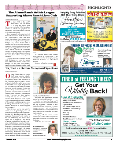 The Alamo Ranch Artists League Supporting Alamo Ranch Lions ClubTSubmitted By Jay Hallhe Lions Club is the world’s largest service club best known for its vision and hearing work.Having been inspired by Helen Keller, Lions continue to collect used eye glasses and hearing aids. These are sanitized and given to those who may benefit.Lions are people who volunteer their time to humanitarian efforts. Founded in 1917, the association’s motto is “We Serve.” Locally, Alamo Ranch Lions screen school students for vision problems through Lions KidSight USA, provide disaster relief to needy victims, and provide local community support to the food bank and veterans. We also provide support and serve the Texas Lions Camp in Kerrville, TX, a residential camping facility for children with physical disabilities such as Type 1 diabetes, physical handicaps, burn victims, cancer patients and more.100% of all proceeds collected at Lions Club fundraisers are used to support local and national charities, such as Lions KidSight USA and Texas Lions Children’s Camp, international disasters and so muchOBy Dr. Donna Beckervarian failure, when the ovaries finally stop secreting estradiol, progesterone, and testosterone,may begin as early as the 3rd decade of life. The earliest symptom may be insomnia and awakening feeling suddenly very warm in the middle of the night. Progesterone, the first hormone to decline, is responsible for regular periods, calmness of mind, and peaceful sleep. Lack of testosterone may present as complete disdain for sex, lack of motivation and sometimes as indifference to life. “I just don’t care about anything, certainly not sex,” said one patient. As estradiol levels begin to wane, vaginal dryness develops into atrophy, shrinkage of the vagina to a tight, dry opening prone to itching. “It feels like I am being torn,” one patient’s description of previously joyous marital relations.Many times, a woman may visit her doctor, even a gynecologist, who will prescribe an antidepressant along with a sleeping pill. Now the woman has a new diagnosis, “Depression,” and maybe in her own mind, “crazy”. The dryness of the vagina may be treated by a tiny amount of a cream derived from pregnant mare’s urine. Hard to believe, I know, but this is the pharmaceutical hormone cream commonly prescribed. I have seen this type of patient at the free 15 minute consult: “I don’t know if you can help me”. With sad face and much sighing, she describes loss of interest, insomnia, hot flashes, and moodiness. “My doctor said it will all be better in about 2-3Del Webb Hill Country RetreatArts & Crafts FestivalFREE Admission • FREE Parking Over 60 VendorsWhen: Sat. Oct. 21, 2023 10 am-4pm Sun. Oct. 22, 2023 11am-3pmWhere: 4550 Del Webb Blvd. San Antonio, TX 78253@alamoranchartistsleaugeFESTIVAL BENEFITS LIONS CLUB AND OTHER CHARITIESTired of suffering from Allergies?October 2023www.alamoranchhighlights.com9more.Your purchase of food during the Arts& Crafts festival on October 20 & 21 will benefit the work they do for sight, hearing, childhood disabilities and international disasters.See arts & crafts ad on this page.What We Treat• Hay Fever, Nasal & Eye Allergy• Asthma• Sinusitis• Eczema & Hives• Food & Drug Allergy • Pet Allergies• Immune Disorders• Stinging Insects• Contact Dermatitisyears, but I can’t live like this!”Hot flashes and night sweats in somewomen last into their 8th decade.I touched her hand, “I can help you!” Iexplained that some researchers believe that any hormones, synthetic or bio- identical, could lead to cancer of the breast, uterus, or ovaries. I told her that some published articles also noted possible blood clot problems which could lead to a heart attack or stroke.And yes, not all women require hormones, but for the vast majority who do need them, restoration of hormones halts the decline.Call for free 15 min. consult:Dr Donna BeckerSpecializes in anti-aging & health maintenance medicine.(210) 545-5224 www.antiagingsa.comGet Your Vitality Back!Hometown Cleaning ServicesSPECIALS$160 4-HR Priority Cleaning. 15% OFF Initial CleaningFREE Estimates!Call Today! 210-438-7359 www.hometowncleaningtx.comAsk About OurDrops11840 Alamo Ranch Pkwy, Suite 80 San Antonio, TX 78253Veteran Owned Buisness210-764-6567 Premierallergytx.comFocus of Treatments:• Hormone restoration to healthy young adults levels• New Weightloss Medications • Thyroid issues• Hot Flashes/ Night Sweats• Moodiness, “Emotionality” • Loss of Libido• Brain Fog• Insomnia• Vitamin Deficiencies• Blood levels guide treatmentMen’s issues:Erectile, Dysfunction, Fatigue and Weight GainDr. Donna BeckerThe Enhancementof Life CenterCall to schedule your FREE consultation (210) 545-522414603 Huebner Rd,. Suite 2601 (Huebner & NW Military)www.antiagingsa.comJohn Freiler, MD