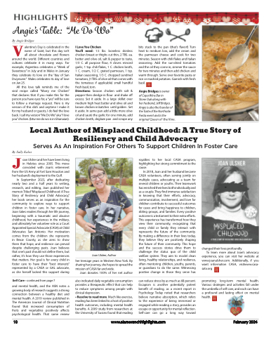 Angie’s Table: “Me Do Wo”VBy Angie Bridgesalentine’s Day is celebrated in thename of Saint, but this day isn’tall about chocolate and flowers around the world. Different countries and cultures celebrate it in many ways. For example, Argentina celebrates a “Week of Sweetness” in July and in Wales in January they celebrate its love on the “day of San Dwynwen.” Wales celebrates its day of love on Jan 25.All this love talk reminds me of the viral recipe called “Marry me Chicken” that declares that if you make this for the person you have eyes for, a “yes” will be sure to follow a marriage request. Here is my version of this dish and anytime I make it for my husband or guests, I do feel the love back. I call my version “Me Do Wo” aka “I love you”chicken. (btw me do wo is in Ghanaian).I Love You ChickenYou’ll need: 1.5 lbs. boneless skinless chicken breast or thighs cut thin, 2 TBS. ea. butter and olive oil, salt & pepper to taste, 1/3 C. all purpose flour, 4 cloves minced garlic, 1 tsp. chili flakes, 1 C. chicken broth, 1 C. cream, 1/2 C. grated parmesan, 1 tsp. Italian seasoning, 1/3 C. chopped sundried tomatoes, (1 TBS. of olive oil that comes with the tomatoes if applicable) small handful fresh basil, torn.Directions: Season chicken with salt & pepper then dredge in flour and shake off excess. Set it aside. In a large skillet over medium high heat butter and olive oil and brown chicken in batches until golden . Set it aside. In same pan add a little more olive oil and sauté the garlic for one minute, add chicken broth, deglaze pan and scrape anybits stuck to the pan (that’s flavor!) Turn heat to medium low, add the cream and the parmesan cheese and cook for two minutes. Season with chili flakes and Italian seasoning. Add the sun-dried tomatoes and the oil they come in, simmer the sauce for two minutes and then add chicken and warm through. Serve over favorite pasta or rice or mashed potatoes. Garnish with fresh basil.Angie Bridges is ownerof Copa Wine Bar inStone Oak along withher husband, Jeff Bridges. Angie is also the founder of the Taste of the Northside Fiesta event and is the original Queen of the Vine.By Sally KalosLocal Author of Misplaced Childhood: A True Story of Resiliency and Child AdvocacyServes As An Inspiration For Others To Support Children In Foster CareJoan Ulsher and her have been living in Helotes since 2005. This move coincided with Joan’s retirement from the US Army at Fort Sam Houston and her husband’s deployment to the Gulf.In September 2023, after dedicating nearly two and a half years to writing, research, and editing, Joan published her memoir. Titled “Misplaced Childhood: A True Story of Resiliency and Child Advocacy,” her book serves as an inspiration for the community to explore ways to support children in foster care. In her narrative, Joan takes readers through her life journey, beginning with a traumatic and abusive childhood, her experiences in the military, and ultimately her volunteer role as a Court Appointed Special Advocate (CASA) at Child Advocates San Antonio. Her motivation comes from the children she represents in Bexar County, as she aims to show them that hope, and resilience can prevail despite challenging pasts. Joan believes that one’s past should not define them, but rather, it’s how they use those experiences that matters. Her goal is for every child in foster care to have their “best interests” represented by a CASA or GAL advocate, as she herself lacked this support duringSelf Care - continued from page 7and mental health, and the ASN notes agrowing body of research suggests a strong connection between a healthy diet and mental health. A 2019 review published in The American Journal of Clinical Nutrition found that increased consumption of fruits and vegetables positively affects psychological health. That same reviewJoan Ulsher, Authorher teenage years in Western New York. By sharing her journey, she hopes to spread the mission of CASA far and wide.Joan donates 100% of her net authoralso indicated daily vegetable consumption provides a therapeutic effect that can help to reduce symptoms among people with clinical depression.• Resolve to read more. Much like exercise, reading has been linked to a host of positive health outcomes, including mental health benefits. A 2009 study from researchers at the University of Sussex found that readingroyalties to her local CASA program, highlighting her strong commitment to the cause.In 2018, Joan and her husband became CASA volunteers, often serving jointly on multiple cases, advocating as a team for several children or youths. Their teamwork has enriched their lives both individually and as a couple. They find immense satisfaction in knowing that their efforts, advocacy, communication, involvement, and love for children contribute to successful outcomes for cases and bring happiness to children, sibling groups, and families. Every positive outcome is a testament to their extra efforts. This experience has transformed how they view their community, recognizing that every child or family they interact with represents the future of the community. By making a difference in their lives today, they believe they are positively shaping the future of their community. This hope and the success stories drive them to challenge the status quo of the child welfare system. They aim to model clean living, healthy relationships, and resilience, often mentoring children, youths, parents, or guardians to do the same. Witnessing positive change in those they serve hascan reduce stress by as much as 68 percent. Escapism is another potentially potent benefit of reading, as a recent report in Psychology Today noted that researchers believe narrative absorption, which refers to the experience of being immersed or engaged while reading a story, provides an escape or opportunity for mental reflection. Self-care can go a long way towardchanged their lives profoundly.To
