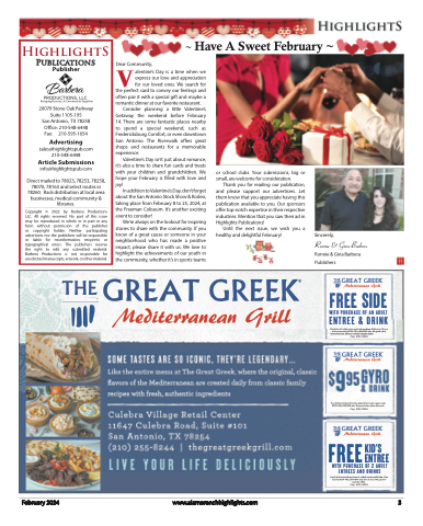 ~ Have A Sweet February ~HighlightSPublications PublisherPRODUCTIONS, LLCBringing Business & Community Together20079 Stone Oak Parkway Suite 1105-195San Antonio, TX 78258 Office: 210-548-6448 Fax: 210-595-1654Advertisingsales@highlightspub.com 210-548-6448Article Submissionsinfo@highlightspub.comDirect mailed to 78023, 78253, 78258, 78070, 78163 and select routes in 78260. Rack distribution at local area businesses, medical community & libraries.Copyright © 2022 by Barbera Productions LLC. All rights reserved. No part of this issue may be reproduced in whole or in part in any form without permission of the publisher or copyright holder. Neither participating advertisers nor the publishers will be responsible or liable for misinformation, misprints or typographical errors. The publishers reserve the right to edit any submitted material. Barbera Productions is not responsible for unsolicited manuscripts, artwork, or other material.VDear Community,alentine’s Day is a time when we express our love and appreciation for our loved ones. We search forthe perfect card to convey our feelings and often pair it with a special gift and maybe a romantic dinner at our favorite restaurant.Consider planning a little Valentine’s Getaway the weekend before February 14. There are some fantastic places nearby to spend a special weekend, such as Fredericksburg, Comfort, or even downtown San Antonio. The Riverwalk offers great shops and restaurants for a memorable experience.Valentine’s Day isn’t just about romance; it’s also a time to share fun cards and treats with your children and grandchildren. We hope your February is filled with love and joy!In addition to Valentine’s Day, don’t forget about the San Antonio Stock Show & Rodeo, taking place from February 8 to 25, 2024, at the Freeman Coliseum. It’s another exciting event to consider!We’re always on the lookout for inspiring stories to share with the community. If you know of a great cause or someone in your neighborhood who has made a positive impact, please share it with us. We love to highlight the achievements of our youth in the community, whether it’s in sports teamsTH_f_ GREATlllf /Ut!.Jilt?.,,ant!.an q,illor school clubs. Your submissions, big or small, are welcome for consideration.Thank you for reading our publication, and please support our advertisers. Let them know that you appreciate having this publication available to you. Our sponsors offer top-notch expertise in their respective industries. Mention that you saw their ad in Highlights Publications!Until the next issue, we wish you a healthy and delightful February!Sincerely,Ronnie & Gina BarberaRonnie & Gina BarberaPublishersGREEK®THE GREAT GREEK lllf ;1,teJitenanum q,.iUFREE SIDE. WITH PURCHASE OF AN ADULTENTREE & DRINKFreeSidewithadultentreeanddrink pureha.5e$S.9Svalue.Dinein with coupon only, MON.-FRl 11AM-8PM only. Not good w/anyother discount& Does not include sampler desert.Exp. 3/31/2024THE GREAT GREEK lllf ;1,teJite>'Mnean q,.iUFree Drinkwith Gyro Purchase $9.95 Dine in with coupon only, MON.-FRI.11AM-8PM only. Not goodw/any other discounts.Exp. 3/31/2024THE GREAT GREEKftleJiUl'l't:/lltlt:/11 ql'lllliiTFREE ENTREE WITH PURCHASE OF 2 ADULT ENTREES AND DRINKSFree Kids Entree with purehase of 2 adult entrees and drinks. Dine In only. MON.-FRI. uAM-8PM only.Dine In only. Not good w/ anyctheroffera.Exp. 3/31/2024KID'SFebruary 2024www.alamoranchhighlights.com3
