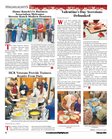 Alamo Ranch/151 Business Association Welcomes Stevens Ranch Modern DentistryValentine’s Day AversionsDebunkedWBy Kathi Holzschuhere all know someone who claims to “hate” Valentine’s Day. (Maybe it’s YOU!). Somehaters have even re-named it“Manipulating People to Spend Money to Prove Love With Shallow Romantic Gestures Day.” (WAY too long!) But, is it? Is Valentine’s an overly commercialized overstatement of affection? Or is it more about love in general? Could it be as simple as being one day out of the year when we express love openly—a day to give little validations of fondness?The challenge with the haters’thinking is equating the day with money-- a waste of money. But think about it for just a second. How do you feel when you receive a card or note from someone expressing their appreciation and affection for you? Or when you receive a gift that says, “I’m glad you are in my life.” It feels good. It floods you with warmth and gratitude. How much money is that feeling worth?The other challenge with the haters’ thinking is that Valentine’s is just a day about romance. And it can be. But love is love, whether romantic, familia, or friendship. It doesn’t have to be expressed with roses and diamonds. It can be anything that brings together those you love or extends love to those who need it.Stepping outside ourselves for one day a year to express our love for others can fill our hearts with joy. Giving love to others brings love in return. So, if greeting cards and flowers are too pricey for you, write a note, pick flowers, or cook a meal. Spend time.Need more ideas? Here are five budget- friendly, love-inspired possibilities.1. “Friendsentine”-much like Friendsgiving, gather your gang and share a meal. Everyone can bring something to contributeA young airman cuts a pie to serve to his tablemateThe Alamo Ranch/151 Business Association welcomed newest member, Stevens Ranch Modern Dentistry, with a ribbon cutting on December 7, 2023.Stevens Ranch Modern Dentistry provides care to their patients using modern technology: Oral DNA testing, Velscope Oral Cancer Screenings, Same Day Crowns, Laser Therapy and CBCT radiology. With access to a General Dentist that has completed an Advanced Education in General Dentistry (AEGD)residency program accompanied by all specialists under one roof, they provide truly convenient comprehensive care forthe whole family (oral surgeon, endodontist, periodontist, orthodontist, and pediatric dentist.) Their vision is to provide the best care possible to their patients in a legal, moral,andethicalmanner. Theyareexcited to be a part of this growing community and look forward to helping as many people as possible get heathier and happier through their oral health.Stevens Ranch Modern Dentistry is located at 14314 Potranco Rd, Suite 109, San Antonio, TX 78253. They can be reached at (830) 219-1378 or visit www. stevensranchmoderndentistry.com.and share love through food.2. Handwrite your special people or person a heartfelt note expressing gratitude for them. Let them know how much they mean to you. This gift they can enjoy for years to come will fill them with love.3. Take a hike with your favorite person and enjoy the scenery-even if it’s cold outside. Stop and listen for the sounds of love around the birds, the wind, the trees rustling nature’s love for humanity.4. Create a photo album for your loved ones- there are many online apps to help with this. Fill it with images of special moments shared over the past year (or years).5. Snuggle up and watch a romantic comedy movie with your partner or a comedy without the romance with your pals. Be sure to have plenty of snacks- popcorn, chocolates, chips, and salsa-along with cozy blankets!However you choose to celebrate Valentine’s Day, you can make a meaningful day without spending a lot of money and contributing to the over-commercialization of the holiday. Think of all the people you love. Then, let them know with a simple gesture.Guests enjoy eating great food and good conversationVeterans - continued on page 9 February 2024HCR Veterans Provide Trainees Respite From DutyGuest trainees fill their plates with homemade Thanksgiving specialties.Submitted By Terry ArnoldTwo busloads carrying 50 trainees from Lackland Air Force Base stopped at the Hill Country Retreat4community center over the holidays.They were there to be honored by the HCR Veterans Group, who would provide themwww.alamoranchhighlights.com
