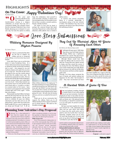 On The Cover: Happy Valentines Day! By Sally Kalos“ O ver the years (and centuries), Valentine’s Day has undergone various transformations, serving as a religious celebration, an ancient ritual day, and a commercial holiday. This evolution means that the meaning of Valentine’s Day is truly flexible, allowing you to interpret it in your own way. You have the option to entirelyforgo the celebrations, treat yourself to some chocolate or flowers, or express your love and appreciation for the people in your life, be they co-workers, romantic partners, friends, or family members.The desire to love and be loved is perhaps the universal thread that binds humanity. Physical love is often linked with attraction, while platonic love is rooted inselfless actions.In essence, love doesn’t necessitatebeing in a romantic relationship; it encompasses acting in the best interests of others. This Valentine’s Day, may we all experience the kind of love that prioritizes the well-being of others.”By Janine HarperWe live in a community that often are the first to support our military and are so composed of the military, so our love story may sound familiar.It was 2004. There I was on my first duty station in Camp Humphreys Korea. As a 19-year-old young women I was just looking to spread my wings, but life had something else in mind. I was assigned to my new medical company and cupid shot an arrow at us on day one. One look was all it took. We dated for the next few months (about 6) and then the saddest news came. My husband was assigned new orders. This was the age when things like email and Myspace were just coming online, and I really didn’t use it too much. I felt at that moment our love journey was at an end, but the world wasn’t done with us. A month or so later I too received orders to Fort Carson. Upon my check in and assignment I found myself working right next to him, again. I knew that it was destiny.Many people say dual military marriages don’t last the long haul, but ours was one designed by higher powers. We are now about to celebrate 20 years, two military retirements and two kids and we are still going strong. I guess when you marry your battle buddy, life has a way of making sure you always get through it all. To all ourIt all began 40 years ago in 1983 when they met at Lane Tech High School in Chicago. Melissa was a sophomoreLove Story SubmissionsMilitary Romance Designed ByThey End Up Married After 40 YearsHigher PowersOf Knowing Each OtherBy Melissa & Marian Kupczynskiand Marian was a senior. They got to know each, hang out, and became best friends.Although Marian would have liked to date her, Melissa did not choose to be with him. During that time, Marian moved to Alaska and then joined the service. It was during this time, that Melissa wanted more in their relationship, but sadly, Marian did not choose to be with her at this time. Those decisions sent them on their separate paths in life.Through it all, they always remained the best of friends and wished nothing but happiness for the other. Fast forward 25 years - they have reconnected and havenow been together for 7 years to the day. They never imagined, that after 40 years of knowing each other, and all the twists and turns in life, they would be marrying each other.fellow military romances: The saying was “ If the Army wanted you to have a family, they would have issued you one.”Well, I guess the Army did! My SPHLM- You have been with me as I grew into a woman, we traveled the world together, raised a family and you keep giving me more. Life will never be boring with you, and I am so excited for the next 20 years.Thank you to all our community that supports the military, thank you to all military families for their support, and thank you to all the Veterans----We stand on the shoulders of giants.It Started With A Game Of UnoBy Ana SalinasIplaying for an hour or two when my now- husband showed up and started conversing with our friend, Luis. I felt awkward having him standing, so I asked if he wanted to join us in our next game. He joined in and the rest is history.We have now been together for 9 years and married for 5. We understand each other and are each other’s best friend. It is funny how this world works and I’m glad he came into my life when I was least expecting. Jonathan shows me he loves me every day through acts of service and picks me up when I’m feeling down. We are committed to each other for life!met my husband, Jonathan, through a mutual friend of ours while playingUno at our local university. I had beenPFlanning Your Valentine’s Day Proposalebruary 14 is a day dedicated to when considering whether or not to pop love. And for couples who are the question on Valentine’s Day. Here are pondering their futures together, some ideas for planning the proposal.Valentine’s Day may seem tailor-made for wedding proposals. According to a survey of 1,000 married adults by James Allen, an online diamond and bridal jewelry retailer, people really love getting engaged on Valentine’s Day. Forty-three percent of Millennials report favoring Valentine’s Day for proposals — whether they’re doing the asking or being asked.There are a few things to keep in mindMake it your ownEven if the proposal is taking place on one of the most popular days of the year to get engaged, interject some personality into the occasion. Include important elements that are dear to the person to whom you are proposing, such as favorite flowers or a preferred restaurant. Restaurant reservations may be hard to come by on Valentine’s Day, so you maywant to select a more private meal at home or something catered unless you want to share your proposal with a crowd.Visit possible locations in advanceThink about where you would like to propose and visit those areas at different times of the day. Timing a proposal duringsunset with the rays creating a warm glow on a park bench or on the incoming tide can make it more magical. Adju