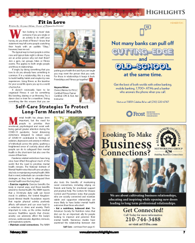 Wsomeone if you are single or an activity to do with your honey, do you think of fitness? I know that statement may left some people scratching their heads with an audible “Okay...” however, hear me out.The typical way to meet people is online now and typical date night is dinner. If you are an active person why not start there? Join a gym, run groups, hikes or fitness events. This applies to both single people and those in relationships.If single, by doing something that you love to do you already have something in common. If in a relationship, this is a way to build healthy habits and maybe try new experiences. Using fitness as the baseline for your social life opens you up to a world of active fun.It doesn’t necessarily have to be organized Fitness it can be something like bowling, skating or ax throwing. Try a dance class or train for a marathon. Doing something like this ensures that you areritten By: Keyuna Milam, Owner of Wanna Go Fit LLChen looking to meet/ dateFit in LoveMEMBER FDICSelf-Care Strategies To Protect Long-Term Mental HealthMental health has always been important, but the need for people to prioritize their emotional, psychological and social well- being gained greater attention during the COVID-19 pandemic. Social distancing restrictions designed to reduce cases of COVID-19 contributed to feelings of isolation, depression and anxiety in millions of individuals across the globe, sparking a heightened sense of curiosity about what people can do to safeguard their mental health in the short-term but also over the course of their lives.Pandemic-related restrictions have long since been lifted throughout much of the world. But the need to prioritize mental health remains. The National Institute of Mental Health notes that self-care can play a vital role in maintaining mental health. With that in mind, individuals can consider these strategies as they look to safeguard their mental health over the long haul.• Exercise regularly. Exercise benefits the body in myriad ways, and those benefits extend to mental health. The NIMH reports that a 30-minute daily walk can boost mood. In addition, the United Kingdom- based Mental Health Foundation reports that regular physical activity positively affects self-esteem and can even lead to a reduction in stress and anxiety. That’s important to note, as the online medical resource Healthline reports that chronic anxiety can adversely affect the body’s nervous, cardiovascular, digestive, immune, and respiratory systems.• Maintain social connections. The NIMHFebruary 2024Looking To Makeputting your health first and if you are single you may meet the person that you seek. For those in relationships it keeps it fresh. Friendships and Fitness go together!Keyuna MilamOwner, Wanna Go Fit LLC Certified Fitness Trainer Certified CPR & First Aid InstructorGet the best of both worlds with online banking, mobile banking, 1,700+ ATMs and a banker who answers the phone when you call.Visit us at 11839 Culebra Rd or call (210) 220-6767.also touts the benefits of maintaining social connections, including relying on friends and family for emotional support and practical help. The Centers for Disease Control and Prevention notes that people who are socially connected and maintain stable and supportive relationships are more likely to have better mental health outcomes than those who don’t.• Eat a nutritious, balanced diet. The American Society for Nutrition notes that diet can be an important ally for people looking to improve and preserve their mental health. Numerous studies have examined the relationship between dietSelf Care - continued from page 10 www.alamoranchhighlights.comBusiness Connections?We are about cultivating business relationships, educating and inspiring while opening new doors leading to long term professional relationships.Get Connected! Call Today for more information210-744-3488or visit ar151ba.com7