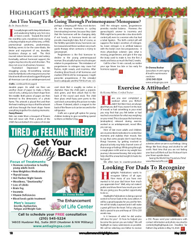 Am I Too Young To Be Going Through Perimenopause/Menopause?IBy Dr. Donna Beckert usually begins with sleep disturbance and awakening feeling very hot once or twice a week. Towards the end ofthe monthly cycle, moodiness-even crying or feeling irritable much of the time, or PMS- premenstrual syndrome, predominates. Nothing seems to be the same libido, the desire and enjoyment of sex, dwindles. Secretions change as well. The thick mucoid nature becomes scant and watery. Eventually, without hormonal support, the vagina may become dry and shrunken. This does not occur in all women, however.Frustration! Depression! So, the struggling young 30-something woman visits her family doc who may pronounce her blood work all normal and suggest that great all-American cure-all, an antidepressant andCrafts - continued from page 8durable paper. An adult can then use another sheet of paper to make a frame mat of sorts, cutting out a heart shape from the middle. Both pieces of paper are then trimmed to the dimensions of a photo frame. The artwork is placed first and then the heart matting on top so that the artwork will show through the heart shape. Frame everything together for a lasting memento. Fuzzy flowersKids can make Mom a bouquet of flowers that will never wilt. Print a photo of the child’s face and attach it to a piece of circularperhaps a sleeping pill! Now, most doctors do not measure hormones in cycling (menstruating) women, because they claim that the hormones will be changing daily if not hourly, so hormone levels do not provide meaningful data. But of course, as the fertility specialists know, hormones can be measured and these numbers very much guide therapy when someone is trying to get pregnant.Progesterone is the first hormone to decline in the young perimenopausal woman. She actually has too much estrogen relative to progesterone. This imbalance of progesterone to estrogen may cause hot flashes, night sweats, and insomnia. After checking blood levels of all hormones and markers (FSH & LH) for menopause, I might prescribe progesterone, if the estradiol level is adequate and the FSH & LH are <23.card stock that is roughly six inches in diameter. Have the child paint a popsicle stick green, and then attach that to the back of the round card stock. The child then glues small fuzzy pom poms to the card stock surrounding the picture to make a flower. If desired, attach a magnet to the back of the flower so it can be secured to the refrigerator.Crafts are a great gift option for young children looking to give something special to Mom on Mother’s Day.Until the estrogen wanes, progesterone provides needed balance. However, the gynecologist’s answer to insomnia and PMS might be to prescribe a low dose birth control pill, even to a woman who has had a tubal ligation. The birth control pill will suppress the body’s secretion of estrogen. So, lower estrogen is in artificial balance with the body’s own low progesterone. A more physiologic solution: give what is missing, progesterone, and give it the way the body used to make it, less the first 2 weeks and twice as much the final 2 weeks.Call for a free 15 min. consult, no matter your age Never too late or too early for hormone support.Dr Donna BeckerSpecializes in anti-aging & health maintenance medicine.(210) 545-5224 www.antiagingsa.comExercise & Attitude!activities when we are in our feelings. Using things like food, drugs and alcohol to self sooth. Next time that you are not feeling your best self, Work out! See if it doesn’t turn your frown upside down.Saving the World One Pound at a Time! www.WannaGoFit.comBHworkout when you REALLY didn’t feel like it but, are always glad that you did? If you weren’t in the best of moods or had something in your mind you may find that you felt better or had reached a resolution for what was weighing on your mind. This is because the hormones (endorphins) released during exercise worked as an antidepressant, mood lifter, you can say.Here of late more adults and children are on prescribed medication to control low moments and stabilize their moods. Not to say that some people don’t need these things however, by getting involved in physical activity may help channel some of that energy or feelings. While going through a rough place in life and on my weight loss journey I discovered boxing. Not only did it help shed the unwanted weight it made me feel good!We often turn to counter-productivey Keyuna Milum, Certified Trainerave you ever completed aGet Your Vitality Back!Focus of Treatments:• Hormone restoration to healthy young adults levels• New Weightloss Medications • Thyroid issues• Hot Flashes/ Night Sweats• Moodiness, “Emotionality” • Loss of Libido• Brain Fog• Insomnia• Vitamin Deficiencies• Blood levels guide treatmentMen’s issues:Erectile, Dysfunction, Fatigue and Weight GainDr. Donna BeckerThe Enhancementof Life CenterCall to schedule your FREE consultation (210) 545-522414603 Huebner Rd,. Suite 2601 (Huebner & NW Military)www.antiagingsa.comHLooking For Dads To Recognizeighlights Publications wants to recognize fathers of all ages. How many of you have everwanted to let your dad know how much you appreciate him? Well, why not make it public and show them how much you care? We are giving you the perfect opportunity to do so.Highlights Publications is doing a special section to honor Dads in the June edition. It will be a great keepsake for you and for him. He will be totally surprised and it will make a great gift from the heart. Tell us why your dad is special to you and keep at 150 to 200 words max.Is it because of what he did and/or still does for you? Or how he helped you become the person you are today? We will highlight as many submissions as possible. We will be selecting one father to receivea $50. Please send your submissions with contact information and photo via email to contest@highlightspub.com. Deadline for Father’s Day articles is May 10, 2023.10w