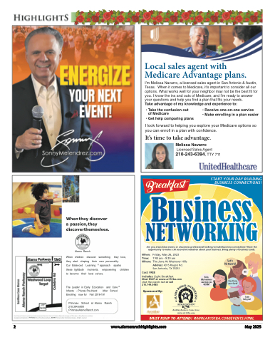 Local sales agent with Medicare Advantage plans.I’m Melissa Navarro, a licensed sales agent in San Antonio & Austin, Texas. When it comes to Medicare, it’s important to consider all our options. What works well for your neighbor may not be the best fit for you. I know the ins and outs of Medicare, and I’m ready to answer your questions and help you find a plan that fits your needs.Take advantage of my knowledge and experience to:• Take the confusion out • Receive one-on-one serviceof Medicare• Get help comparing plans• Make enrolling in a plan easierI look forward to helping you explore your Medicare options so you can enroll in a plan with confidence.It’s time to take advantage.Melissa NavarroLicensed Sales Agent 210-243-6394, TTY 711AlamoWhen they discover a passion, they discoverthemselves.Alamo RanchWhen children discover something they love, they start shaping their own personality.Our Balanced Learning ® approach sparksthese lightbulb moments, empowering children to become their best selves.The Leader in Early Education and Care ® Infants - Private Pre-Kand After School Enrolling now for Fall 2018-19!Primrose School at Alamo Ranch 210.394.6900 PrimroseAlamoRanch.comEach Primrose School is a privately owned and operated franchise. Primrose Schools•, Balanced Learning•, and The Leader in Early Education and Care• are registered trademarks of School Franchising Compony_ Primrose School Franchising Company_ All rights reservedSTART YOUR DAY BUILDING BUSINESS CONNECTIONS!Business NETWORKINGAre you a business owner, or a business professional looking to build business connections? Have the opportunity to make a 30 second introduction about your business. Bring plenty of business cards.BreakfastWhen: Friday, May 26, 2023Time: 7:45 am - 9:30 amWhere: The June At Westover HillsAddress: 4315 Rogers Rd.San Antonio, TX 78251Cost: FREEIncludes: Light BreakfastMust RSVP at www.ar151ba.com click the events tab or call 210.744.3488Hello, My business can help you GROW!Let’s Network!HI!I can help you!Can I have your Card?Sponsored By:ASSOCIATIONBuilding Business Connectionswww.ar151ba.comMUST RSVP TO ATTEND! WWW.AR151BA.COM/EVENTS.HTML2 www.alamoranchhighlights.com May 2023HCNA/151RBUSOINMEALSAS