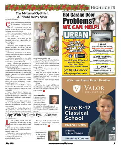 The Maternal Optitimist: A Tribute to My MomBCy Sonny Melendrezarmen Melendrez spent her whole life encouraging my brother and me.She was a cheerleader without the routines. No matter the crisis, she’d always find a way to get us through it.When my mom wasn’t praying for a happy ending, she was taking matters into her own gentle hands.One Mother’s Day I wrote her the following letter. It best explains what she has meant to me.Dear Mom,You always knew what to say when I needed comforting. I’d still hurt, but just knowing you were there made life a little easier.You always encouraged me to dream, cheered when I succeeded, and urged me to try again when I failed.You helped me save for my first radio, $19.95 plus tax. A lot of money back then, but you knew I just had to have it.When I needed Dad’s permission to spend the night at a friend’s house, you lobbied on my behalf.When I made my First Communion you asked me to make I wish. I wished for a little brother. Nine months later, my brother Rick was born. Was there anything you wouldn’t do for me?I can still see your face the day I got the measles. You would have gladly traded places with me, just to take away the pain. I would have let you.You told me we couldn’t afford a bicycle for Christmas. It was true. Yet, there it was on Christmas morning, exactly as I had dreamed it.You’ve always loved making me happy. How could I have survived my first heartbreak without you? At the time, I was sure you didn’t understand. Looking back, I know you did.I can still taste the filling you’d leave for us in the pan after putting a lemon meringue pie in the oven. No one can make them like you.Cub Scout Den Mother, Safety Patrol Mom, PTA, Home Room Mom: You were always ready to help. How could we not beI Spy With My Little Eye... ContestLBy Alissa Reinhardook carefully, search each and every page, up and down, left and right, front to back, and then backto front.Don’t give up! If you can find the hiddenbaby & mamma bird you’ll be entered into a drawing to win a $50!Just email the page number and location where you spotted baby & mama bird to contest@highlightspub.com.Deadline is May 10, 2023.Got Garage Door Problems?We Can Help!We sellWe sellautomaticautomaticgarage doorgarage dooropeners!openers!May 2023www.alamoranchhighlights.com 5proud? We belonged to you.My sense of humor, outlook on life, lovefor children...they all come from you. You’ve always taught me to give back and to put things in God’s hands throughprayer and faith.Mom, you’ve always been there for meand I am so grateful.Thank you for all you’ve help me tobecome. Thank you for giving me your heart and your smile. May I wear them as bravely as you have.God bless you, Mom. I love you. Happy Mother’s Day!–Sonny.My mother died on April 6, 2018 at age 97 with my brother and me at her bedside. We pray to her daily, for surely she was an angel on earth.Sonny Melendrezis an award-winningmotivational speaker,Hall of Fame radio/TV host and author,based in San Antonio.For more of his enthusiastic brand of inspiration and speaking information, visit www.SonnyMelendrez.com and listen to his podcast.Locally Owned & Operated Mon.- Fri. 7am-7pm Sat.- 9am - 5pmSales & Service All Makes & Models(210) 942-8272urbangaragedoorco.com$39.99 GARAGE DOOR LUBE & TUNE Help garage doors run smooth! URBAN GARAGE DOOR CO.No cash value. Expires 5/31/23$32 OFF REPAIRS(Excludes electronics)URBAN GARAGE DOOR CO.No cash value. Expires 5/31/23$100 OFF ANY NEW GARAGE DOOR URBAN GARAGE DOOR CO.No cash value. Expires 5/31/23We hope you’ll have fun with our version of a mini-scavenger hunt within our pages. Good Luck!Congratulations to our MarchI Spy winner Robin PoolSchoolWe Can Help!Welcome Alamo Ranch FamiliesFree K-12ClassicalENROLL NOWA-Rated School DistrictVALOREDUCATION.ORG