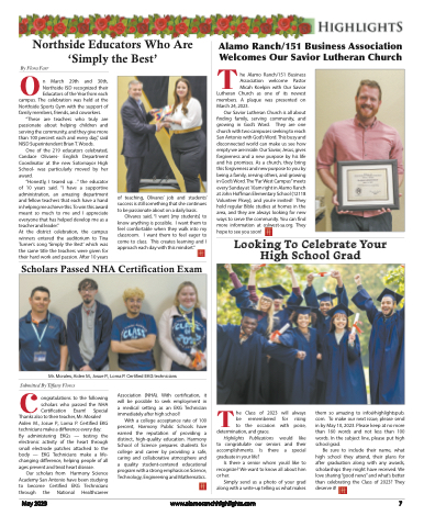 Northside Educators Who AreAlamo Ranch/151 Business Association TWelcomes Our Savior Lutheran Churchhe Alamo Ranch/151 Business Association welcome Pastor Micah Koelpin with Our SaviorLutheran Church as one of its newest members. A plaque was presented on March 24, 2023.Our Savior Lutheran Church is all about finding family, serving community, and growing in God’s Word. They are one church with two campuses seeking to reach San Antonio with God’s Word. This busy and disconnected world can make us see how empty we are inside. Our Savior, Jesus, gives forgiveness and a new purpose by his life and his promises. As a church, they bring this forgiveness and new purpose to you by being a family, serving others, and growing in God’s Word. The “Far West Campus” meets every Sunday at 10am right in Alamo Ranch at John Hoffman Elementary School (12118 Volunteer Pkwy), and you’re invited! They hold regular Bible studies at homes in the area, and they are always looking for new ways to serve the community. You can find more information at oslwest-sa.org. They hope to see you soon!Looking To Celebrate Your High School Grad‘Simply the Best’OBy Flora Farrn March 29th and 30th, Northside ISD recognized their Educators of the Year from eachcampus. The celebration was held at the Northside Sports Gym with the support of family members, friends, and coworkers.“These are teachers who truly are passionate about helping children and serving the community, and they give more than 100 percent each and every day,” said NISD Superintendent Brian T. Woods.One of the 219 educators celebrated, Candace Olivares- English Department Coordinator at the new Sotomayor High School- was particularly moved by her award.“Honestly, I teared up...” the educator of 10 years said. “I have a supportive administration, an amazing department and fellow teachers that each have a hand in helping me achieve this. To win this award meant so much to me and I appreciate everyone that has helped develop me as a teacher and leader.”At the district celebration, the campus winners entered the auditorium to Tina Turner’s song ‘Simply the Best’ which was the same title the teachers were given for their hard work and passion. After 10 yearsof teaching, Olivares’ job and students’ success is still something that she continues to be passionate about on a daily basis.Olivares said, “I want [my students] to know anything is possible. I want them to feel comfortable when they walk into my classroom. I want them to feel eager to come to class. This creates learning and I approach each day with this mindset.”Scholars Passed NHA Certification ExamMr. Morales, Aiden M., Josue P., Lorna P. Certified EKG techniciansCSubmitted By Tiffany Floresongratulations to the following scholars who passed the NHA Certification Exam! SpecialThanks also to their teacher, Mr. Morales! Aiden M., Josue P., Lorna P. Certified EKG technicians make a difference every day:By administering EKGs — testing the electronic activity of the heart through small electrode patches attached to the body — EKG Technicians make a life- changing difference, helping people of all ages prevent and treat heart disease.Our scholars from Harmony Science Academy San Antonio have been studying to become Certified EKG Technicians through the National HealthcareerAssociation (NHA). With certification, it will be possible to seek employment in a medical setting as an EKG Technician immediately after high school!With a college acceptance rate of 100 percent, Harmony Public Schools have earned the reputation of providing a distinct, high-quality education. Harmony School of Science prepares students for college and career by providing a safe, caring and collaborative atmosphere and a quality student-centered educational program with a strong emphasis on Science, Technology, Engineering and Mathematics.T he Class of 2023 will always be remembered for rising to the occasion with poise,determination, and grace.Highlights Publications would liketo congratulate our seniors and their accomplishments. Is there a special graduate in your life?Is there a senior whom you’d like to recognize? We want to know all about him or her.Simply send us a photo of your grad along with a write-up telling us what makesthem so amazing to info@highlightspub. com. To make our next issue, please send in by May 10, 2023. Please keep at no more than 160 words and not less than 100 words. In the subject line, please put high school grad.Be sure to include their name, what high school they attend, their plans for after graduation along with any awards, scholarships they might have received. We love sharing “good news” and what’s better than celebrating the Class of 2023? They deserve it!May 2023www.alamoranchhighlights.com7