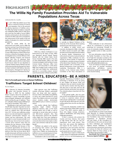 The Willie Ng Family Foundation Provides Aid To Vulnerable Populations Across TexasSubmitted By Eric CastilloIn 2017, Willie Ng battled cancer that led to a victorious journey of survival and inspiration. Due to the personal life altering experience of battling cancer, The Willie Ng Family Foundation nonprofit was established, Willie works to help those who must face the battle of cancer. Willie’s devotion and tenacity to all communities is evident in his life’s work and is committed to the enhancement of the quality of life and quality of education for current and future generations.With an innate ability for law enforcement and public service, Willie Ng has been serving in Law Enforcement since 1993. Willie served the city of San Antonio with the San Antonio Police Department for 22 years. Willie began as a Patrol Officer, then served as a Detective Investigator where he investigated various criminal offenses in the Repeat offenders Program and Financial Crimes Unit. Prior to retirement from SAPD, Willie worked with the United States Secret Service where he was deputized as a Special Federal Deputy Marshal and law enforcement professional range from Hand- to-Hand Combat & Self Defense, Narcotics and Emergency Management training by the U.S. Department of Homeland Security.Willie Ng, Founder.Willie has a Master Certification in Law Enforcement by the State of Texas. Willie was deputized Special Federal Deputy Marshal with the United States Secret Service. Recently, Willie served in the roles of Chief Administrative Officer and Chief Criminal Investigator with the Bexar County Criminal District Attorney’s Office from January 1, 2015-December 31, 2018, where Willie lead multiple teams working closely with local and federal law enforcement agencies to successfully prepare criminal cases for prosecution in Bexar County. Willieis currently an Adjunct Professor at The University of the Incarnate Word, teaching graduate level criminal justice courses.In addition to public service and economic development, Willie is tireless in his efforts toward non-profit work. Willie providescommunitysupportandconsulting to business leaders, entrepreneurs, law enforcement and various local and national organizations. Willie contributes his time serving on various boards, to include but not limited to, currently serving as President of the Alamo Asian Chamber of Commerce, Board president and Co-Founder of the Maestro Entrepreneur Center and Maestro Leadership Development. Willie is a member of the Criminal Justice Reform Committee of the Texas Associations ofBusiness.Willie’s dedication to law enforcementreflects his commitment to serving and protecting his community. Through his career, he embodies integrity, compassion, and a steadfast resolve to make a positive impact.For more information, about The Willie Ng Family Foundation on how they can be of help from education assistance, first responder support, aid for cancer patients and the elderly to even animal rescues, visit /www.williengfamilyfoundation.org.If you are looking to having him speak at your event, he provides mentoring opportunities, self-defense courses, motivational speaking, lockdown drills and active shooter training.PARENTS, EDUCATORS--BE A HERO!Part 3 of a multi-part series on Human TraffickingTraffickers Target School Children!IBy Lou Duggann February Dr. Katariina Rosenblatt, author and Executive Director of There Is HOPE For Me, testifiedbefore Congress about the prevalence of trafficking in schools. Rosenblatt survived being drugged, kidnapped, and trafficked before turning the age of eighteen. “There are 1,000,000 children being trafficked per year,” said Dr. Rosenblatt. “That’s a fact.”“Identification is key,” said Comal County Sheriff Mark Reynolds. Reynolds has been involved in County law enforcement for 34 years, as a deputy since 1990 and Sheriff since 2017. He has seen trafficking activity grow in our area and expresses support for enhanced communication between our citizens and law enforcement. “We need the public to come forward and talk to us,” Reynolds says, “but we have to be cautious. I cannot arrest someone unless they are breaking the law. Because of the hidden nature of trafficking and because of the recreational opportunities we have in our area, I am sure there is much more trafficking going on here than we know about. We’ve actually had people sell family members for money. So, we must do better about getting the proper messaging to victims.”10Reynolds. “Monitoring of children’s use of technology is important. If we are going to give children cell phones, iPads, and computers, then we need to monitor their use. We need to monitor who they talk to, who they text or chat with, and how. We need to educate and involve more parents. Plus, educators play an important role. They are vigilant.”“If the general public, who has more eyes on their surroundings, feels something is wrong or suspicious, please call law enforcement,” said Reynolds. “I would rather we get calls about what may turn out to be nothing rather than miss the one that does matter.”A 9-year-old, elementary student was asked to write about “What makes a person a hero?” The child’s response speaks to those who display courage, awareness, vigilance, identification, and caring during challenging situations:“A hero is someone who protects the Country and loves America. And wants to help human lives like you and me. Superheroes don’t need powers. They have their own powers like helpfulness and respect for the Country. To have a superpower is your own power. God does not need Flash or Captain America. He needs people who love God’s country.”Be a hero! If you suspect a child may be a victim, report it to appropriate authorities; call 911 or if it is not life-threatening callState agencies warn that “trafficking includes school-age children—particularly those not living with their parents--- because of 