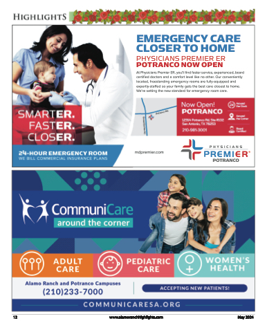 EMERGENCY CARE CLOSER TO HOMEPHYSICIANS PREMIER ERPOTRANCO NOW OPENAt Physicians Premier ER, you'll find faster service, experienced, board certified doctors and a comfort level like no other. Our conveniently located, freestanding emergency rooms are fully-equipped and expertly-staffed so your family gets the best care closest to home. We're setting the new standard for emergency room care.mdpremier.comlrPReM1eRĀ· POTRANCOJLPHYSICIANS12 www.alamoranchhighlights.com May 2024