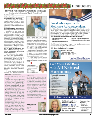 Thyroid Function May Decline With Age Levothyroxine Or Desiccated Thyroid Which Is Best?Local sales agent with Medicare Advantage plans.I’m Melissa Navarro, a licensed sales agent in San Antonio & Austin, Texas. When it comes to Medicare, it’s important to consider all our options. What works well for your neighbor may not be the best fit for you. I know the ins and outs of Medicare, and I’m ready to answer your questions and help you find a plan that fits your needs.Take advantage of my knowledge and experience to:• Take the confusion out • Receive one-on-one serviceof Medicare• Get help comparing plans• Make enrolling in a plan easierI look forward to helping you explore your Medicare options so you can enroll in a plan with confidence.It’s time to take advantage.Melissa NavarroLicensed Sales Agent 210-243-6394, TTY 711By Dr. Donna Becker#1. “I have been taking the same amount of thyroid for 20 years, I guess it’s ok.”Maybe it is ok, maybe not. The thyroid has a wide range of “normal” and I like to help patients get to 50% of normal, at least. I call this “optimal”. It is best to be in the upper end of normal range, rather than the bottom end.#2. “I asked my doctor to please give me Armour thyroid, but he/she would not.”Levothyroxine is the storage form of thyroid, T4, while Armour, desiccated thyroid from a pig, contains both the active and storage forms, T3 & T4. With increasing age, T4 may not convert very well into T3. It is like having money in the bank, but none in your hands for spending. When taking levothyroxine, your T4 (storage) might be great, while the T3 (active) could be barely above the lowest range. It depends on the blood levels of T3 & T4, and both should be in the mid-range of normal.#3. “My thyroid has been tested many times, and the doctor always says it is normal.” The lower end of normal may not be optimal for you.Of all the hormones which may decline with aging, I think thyroid replacement is the most controversial. Yes, thyroid can be a double-edged sword—too much and your heart pounds, hair eventually falls out, bones crumble into the urine, and you feel shaky and weird! But too little thyroid can have symptoms such as fatigue, depression, coldness, constipation, sluggish energy, and weight gain. Laboratory evaluation and physical findings must guide thyroid dosage.“... therapy with once-daily desiccated thyroid in place of levothyroxine causesmodest weightimprovements in symptoms and mental health without appreciable adverse effects.” (Desiccated Thyroid Extract Compared with Levothyroxine in the Treatment of hypothyroidism: A Randomized, Double Blind, Crossover Study Hoang, T. Olsen, C, Mai, V, Clyde, P., & Shakir, M. J Clin Endocrinol Metab. 2013 May ;98(5):1982-90)Endocrinologists treat illnesses of the thyroid, like nodules, autoimmune diseases, and cancer. I am not an endocrinologist, and I properly refer patients to that specialty who have a sickness of their thyroid.Dr. Donna Becker. practicing medicine for over 30 years with focus on hormone replacement for past 20 yrs. Call for free 30m consult.Dr Donna BeckerSpecializes in anti-aging & health maintenance medicine.(210) 545-5224 www.antiagingsa.comloss andpossibleGet Your Life Back with All NaturalHormonesFocus of Treatment:• Weight Loss• Hot Flashes• Vaginal Dryness• Insomnia• Loss of Libido• Thyroid Issues• Erectile Dysfunction• Weakness• Brain Fog• Vitamin Deficiencies• Bone Loss• Men & Women Anti-AgingEnhancement of Life CenterCall to schedule yourFREE consultation!(210) 545-522414603 Huebner Rd., Ste. 2601 (Huebner & NW Military)Dr. Donna BeckerTreatment Plan Includes:• 3 pages of Blood Work• Detailed Analysis• Individualized Treatments.Mother’s Day - continued from page 4unclogging, not even any stuck-zipper zapping.I plan to take a very hot bath and read a very long book. And I will allow myself the luxury of using a brand-new bar of soap. Not once during this glorious bath will anyone interrupt me with “Hey Mom, where’s the sugar?”or“Did I mention I have a science project due tomorrow?”No. 3: After my bath, I want to have control of the television. THE TV. That 52-inch high- definition behemoth in the living room. No ESPN will appear on the TV that day. There will be no Victoria ’s Secret Specials. I will be watching every movie Brad Pitt ever made. I’ll probably also eat some more chocolate.No. 4: I’d like to be taken to dinner at a nice restaurant, one that requires an advance reservation and has no child’s menu. During the meal, I’d like my offspring to conduct themselves admirably. No eating with your fingers, no chewing with your mouth open, no kicking a sibling under the table. And not a single word aboutbodily processes.No. 5: After dinner, I’d like us all to go through family pictures together and reminisce about old times. You are required to look pleasant and appear to be having fun. Not even one teenage eye may roll in disgust. No surreptitious text messages may be sent to friends. And each of you has to say “I love you, Mom,” and you have to mean it.At that, several groans went up. I folded the paper and finished with something my grandma used to say, something ungrammatical but undeniable.“Just remember,”I told my gang.“If Mamma ain’t happy, ain’t nobody happy.”Jackie PapendrewSyndicated Humor Columnistwww. jackiepapendrew.comMay 2024www.alamoranchhighlights.com 9