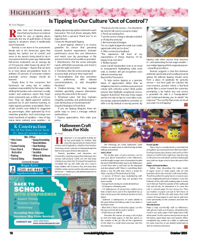By Lou DugganIs Tipping in Our Culture ‘Out of Control’?R adio host and financial adviser Dave Ramsey has been vocal about what he sees as tipping abuse, especially the rise of guilt-driven or forced tipping in situations where it traditionallywasn’t expected.Ramsey is not alone in his assessment.Nearly nine in ten Americans agree that tipping has “gotten out of control,” and seven in ten reports being asked to tip in more places than five years ago. Nationwide full-service restaurants see an average tip of 19.4 percent, while Texans tip about 18.7 percent on average— figures that are back to or even above pre-pandemic levels. In addition, 83 percent of consumers believe automatic service charges should be banned.Nearly three in five consumers feel businesses are using tips to replace employer responsibility for fair wages while shifting the burden onto customers. Locally, waiters and waitresses report that major chain restaurants pay as little as $2.16 per hour. They use digital payment systems, powered by AI and machine learning, to make tipping prompts unavoidable. Point- of-sale screens now default to suggested tip percentages, often optimized by AI to maximize gratuities. Such technology now tracks hundreds of variables— time of day, menu items ordered, even weather— todisplay dynamic tip options tailored to each transaction. This tech-driven ubiquity shifts tipping from a genuine “thank you” to an expected act.Criteria for Meaningful TippingA good tipping criterion is to reservegratuities for service that genuinely exceeds baseline expectations. Evaluate performance across five core dimensions and match your tip percentage or flat amount to the level of excellence provided: 1. Attentiveness. Did the server anticipate needs, refill drinks proactively, and check in at just the right moments?2. Timeliness. Was the service prompt, order accuracy high, and your time respected?3. Personalization. Did they remember your preferences, offer tailored recommendations, or add thoughtful flourishes?4. Problem-Solving. Did they manage mistakes gracefully, propose alternatives, and go the extra mile to fix issues?5. Emotional Labor. Did they maintain empathy, positivity, and professionalism— even during busy or stressful periods? Graceful Strategies to Push BackIf you are tipping fatigued, there are polite ways to send a message without awkwardness:1. Express appreciation, then state your policy:Halloween Craft Ideas For KidsHBy Staffwhimsy and imagination, whether that involves choosing a clever costume or helping design the theme and scope of home decorations.Parents, guardians and educators can channel the creativity inspired by Halloween into various craft projects. Crafts can not only keep children busy when the“I’m bored”lamentations inevitably turn up, but crafts also are a way to keep children off of screens. Plus, the items that children create can be used to decorate rooms in the house — helping to curb added expenses on commercial decor.“Thank you for the service—I’ve decided to tip only for full-service scenarios today.”2. Point out existing fees:“I see the service charge is already included, so I’ll skip the extra tip.”3. Be honest about budget:“I’m on a tight budget this week, but I really appreciate what you’ve done.”4. Offer constructive feedback:“The experience fell short of my expectations—if things improve, I’d be happy to tip next time.”5. Redirect praise:Leave a brief, handwritten note or an email to management highlighting what went well, so workers still get recognition even without monetary tips.Beyond the TransactionTo help restore tipping as a genuine token of appreciation rather than an obligatory line item, combine your personal criteria with collective action: Write public reviews that highlight exceptional service. Support businesses that pay living wages and do not rely on tips to cover labor costs. Encourage payment-platform providers to offer a no-tip default or low-tip presets. Bytipping only when service truly deserves it—and advocating for fair wage models— you realign tipping with its original purpose- --rewarding excellence.Ramsey suggests a clear line between authentic generosity and socially pressured giving. He believes tipping should come from a place of gratitude for genuine service— not from guilt. He criticizes the now-common practice where a fast-food cashier flips a screen toward the customer, prompting a tip before any real service is provided. He calls it a “manipulation” and “nickel-and-diming you to death.” His response? “You can flip that screen at me all you want. I’m not tipping.”K Construction“For All Your Home Exterior Needs” 25+ Years of Customer Services• Patio Covers• Decks• Custom Fencing • Fence Stain &Restoration• Painting• Fascia & Siding• Garage Remodeling • Room Additions• Steel Buildings• Windows & Doors • Insulation• Kitchen & Bathroom RemodelingWe Offer:Licensed & InsuredRoger Kretz Watch Me(210) 441-8441rogerkretz@yahoo.comOnBACK TOSCHOOLWITH CONFIDENCESpeech Therapy Pediatric Feeding TeletherapyAccepting New Clients Insurance May Cover Services!CONTACT US! (210) 495-9944 www.stoneoakspeech.comalloween is an enjoyable holiday for all, but particularly for children. Kids enjoy the opportunity to channel theirThe following are some Halloween crafts children can make alone or with the help of older siblings and parents.Jack’s slimeThe toothy grins of jack-o’-lanterns can be seen just about everywhere come Halloween, and the bright orange color of pumpkins heralds the start of fall. What better way to say“Halloween is here” than with a craft that can be displayed and also played with? Slime is something that’s always a big hit with kids. Here’s a recipe for slime, courtesy of The Best Ideas for Kids.• 6 ounces of Elmer’s glue (substituting with another brand of glue may not produce the same results)• Orange f