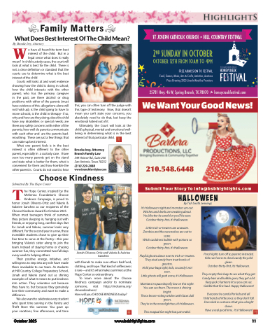vFamily Mattersv What Does Best Interest Of The Child Mean?WBy Brooke Irey, Attorneye have all heard the term best interest of the child. But in a legal sense what does it reallymean? In child custody cases, the court will look at what is best for the child. There is not a clear definition or standard that the courts use to determine what is the best interest of the childCourts will looks at and want evidence showing how the child is doing in school; how the child interacts with the other parent; who has the primary caregiver in the past; are there alcohol or drug problems with either of the parents (must have evidence of this- allegations alone will not hold up); is the child going to have to move schools; is the child in therapy- if so, why and how are they doing; does the child have any disabilities or special needs; are there any safety concerns with either of the parents; how well do parents communicate with each other and are the parents bad- mouthing. These are just a few things that can make up best interest.What one parent feels is in the best interest is often different to the other parent, especially In a custody case. I have seen too many parents get on the stand and state what is better for them, what is convenient for them and how horrible the other parent is. Courts do not want to hearSt Joseph Catholic Church hill country festival2nd Sunday in October October 12th from 10am to 4pmFREE ADMISSION TO FESTIVAL Food, Games, Music, Arts & Crafts, Activities, Auctions Prize Drawing 2025 Lincoln Nautilus Premiere25781 Hwy. 46 W, Spring Branch, TX 78070 honeycreekfestival.comWe Want Your Good News!210.548.6448Submit Your Story To info@bsbhighlights.comHalloweenBy Tish Smith Jennings I t’s Halloween night and monsters are out.Witches and devils are sneaking about. You’d better be careful or you’ll be seen. October thirty-first, it’s Halloween.Little trick-or-treaters are unaware. Zombies and the werewolves are out to scare.Witch cauldrons bubble with potions so green.October thirty-first, it’s Halloween.Playful ghosts dance next to trick-or-treaters. They steal candy from treat bowls of greeters.Hold your bags tight, kids, so candy’s not seen.Little ghosts will grab some, it’s Halloween.Martians in spaceships fly low on this night. You can see them. The moon is shining bright.Those broom-riding witches with faces dull green,They’re in the moonlight too, it’s Halloween.This magical fun night has just ended.Porch lights turn off as parents intended. Kids run home to check candy they did glean.October thirty-first, it’s Halloween.They empty their bags to see what they got. Candy bars and bubble gum, they get a lot. Keep jack o’ lanterns lit so you can see. Gobble that fine haul. Happy Halloween!Everyone be careful for kids and all. Hold hands of little ones so they don’t fall. Dress kids in costumes that give a bright sheen.Have a real good time. It is Halloween!this, you can often turn off the judge with this type of testimony. Now, that doesn’t mean you can’t state your concerns, you absolutely need to do that, but keep the emotional hatred out of it.Ultimately, the Court will look at the child’s physical, mental and emotional well- being in determining what is in the best interest of that particular child.Brooke Irey, Attorney Branch Family Law549 Heimer Rd., Suite 200 San Antonio, Texas 78232 (210) 229-2088 www.branchfamilylaw.comChoose KindnessSubmitted By The Hope CenterThe Hope Center, inspired by the McKenna Foundation’s Choose Kindness Campaign, is proud to honor Jonah Oliveros-Ortiz and Valerie & Aubriee Sanchez as our recipients of the Choose Kindness Award for October 2025. When most teenagers think of summer, they picture sleeping in, hanging out with friends, or enjoying long, carefree days. But for Jonah and Valerie, summer looks very different. For the second year in a row, these incredible students chose to give up their free time to serve at the Pantry—this year bringing Valerie’s sister along to join the team. Instead of staying home or chasing summer fun, they committed two full days every week to helping others.Their positive energy, initiative, and willingness to step into any role have made them invaluable to our team. As students at Hill Country College Preparatory School, Jonah and Valerie stand out as shining examples of what it means to put kindness into action. They volunteer not because they have to, but because they genuinely love their community and want to make a difference.We also want to celebrate every student who spent time serving in the Pantry and Thrift Store this summer. You gave up your vacations, free afternoons, and timeJionah Oliveros-Ortiz and Valerie & Aubriee Sanchezwith friends to make sure others had food, clothing, and hope. That kind of selflessness is rare—and it’s what makes summers at the Hope Center so extraordinary.To learn more about the Choose Kindness campaign and/or to nominatesomeone, visitchoosekindness/How will you CHOOSE KINDNESS today?https://mckenna.org/October 2025www.bsbhighlights.com 11
