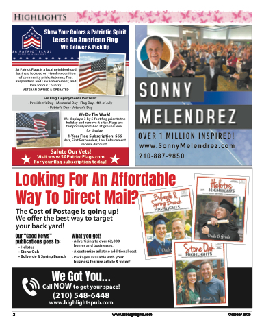 OVER 1 MILLION INSPiRED!www.SonnyMelendrez.com 210-887-9850Show Your Colors & Patriotic SpiritLease An American Flag We Deliver & Pick UpSA Patriot Flags is a local neighborhood business focused on visual recognition of community pride, Veterans, First Responders, and Law Enforcement, and love for our Country. VETERAN OWNED & OPERATEDSix Flag Deployme• President’s Day • Memorial Day • Flag Day • 4th of July • Patriot’s Day • Veteran’s Daynts Per Year:We Do The Work!We display a 3 by 5-foot flag prior to the holiday and remove it after. Flags are temporarily installed at ground levelfor display.1-Year Flag Subscription: $66Vets, First Responders, Law Enforcement receive discount.Salute Our Vets!Visit www.SAPatriotFlags.com For your flag subscription today!Way To Direct Mail?The Cost of Postage is going up! your back yard!What you get!• Advertising to over 62,000 homes and businesses.• A customize ad at no additional cost.• Packages available with your business feature article & video!Our “Good News”publications goes to:• Helotes• Stone Oak• Bulverde & Spring BranchWe Got You... Call NOW to get your space!(210) 548-6448 www.highlightspub.com2 www.bsbhighlights.com October 2025