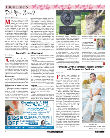 Did You Know?BMy C o n n i e M c F a l l C l a r kany early settlers in Comal County homesteaded or were granted land as they arrived inthe area. A lot of families were fortunate enough to be able to create a cemetery on their homestead for their loved ones to be interred after death. The Koch family allocated space for their final resting place on land located at what is now Koch Drive off of Casey Road and Bulverde Road. There are 14 marked and 2 unmarked burial sites.Carl Koch selected the site for use by his family and the Werner Krause family who lived across the road. The first family member to be buried there was Carl and Elizabeth’s son Otto in 1874. In 1876 daughter Louise was buried there. Two more of Carl’s children plus he and wife Elizabeth are also buried there. The first Krause to restin the Koch Cemetery was Karl Krause, son of Werner and Maria. In 1885, Karl, who was Zada’s mother’s 13-year-old brother, was killed by a lightning strike while standing on the Krause porch watching a thunderstorm.Edgar Bremer married Werner and Maria’s daughter Emma Krause. One of their children, Walter died in his teens of a fever and was the first Bremer to be buried in Koch Cemetery. In 1922, Jerome Erben, the six-month-old grandson of Edgar and Emma Bremer died of diphtheria and was buried there. Werner Krause was the most recent burial in Koch Cemetery in 1932. Wife Maria died in 1914.In August 1924, Moritz Koch, son of Carl Koch deeded the cemetery to Edgar Bremer and now his granddaughter Zada Bremer Jahnsen is in possession of the original deed. The cemetery for the Koch-Krause-Bremer families is maintained by the descendants of the three families. Earl Jahnsen, husband of Zada is buried there, close to the homestead he loved with one of their sons maintaining the legacy.Many thanks to Zada Bremer Jahnsen for sharing her history and invaluable knowledge about the area. Because of her generosity of allowing me to read heror bank repossessions — up 11 percent from June and up 13 percent from July 2024. Nationwide, one in every 3,939 housing units faced a foreclosure filing. Texas ranked 8th for foreclosures - 1 in every 2,990 housing units. Texas EconomyIn August, Governor Greg Abbott recognized the strength and resilience of the Texas economy as the state set new records for total nonfarmtreasured books and papers, I have many more stories to share!Connie McFall Clarkspotlights historical and human interest stories from the area. www.conniecanwrite.comjobs and the number of Texans working based on July data. Texas also outpaced the national annual job growth rate, adding 232,500 jobs over the previous 12 months. “Texas continues to see sustained job growth thanks to having the best business climate in America and the productivity of hardworking Texans,” said Governor Abbott.News Of Local InterestBy Lou DugganJMore than 800 new laws went into effect in Texas on Sept. 1. New laws range from school vouchers and water infrastructure funding to a ban on city and county-funded abortion travel funds.Democrats Fined for Leaving State During SessionAustin station KXAN reports that more than 50 Democratic representatives in the Texas House left the state for weeks in August, in an attempt to block a vote on redrawn maps of Texas’ U.S. congressional districts and raise national awareness of the maps. As a whole, the group of House Democrats who broke quorum will have to pay more than $350,000 for theabsentee fines, plus the $124,943.25 for DPS’s efforts to bring them home. The total fines add up to nearly half a million dollars.Bexar RaisesThe San Antonio Report highlighted budget raises for Bexar County officials. “Bexar County Commissioners voted (in late August) to again raise their own salaries, bringing Bexar County Judge Peter Sakai’s salary from about $205,000 to nearly $209,000 per year for the 2026 fiscal year. The county’s four commissioners will make about $165,000 per year, including a $9,000 per year car allowance. The county judge also receives executive security detail, which provides his transportation. In addition to the county commissioners, the raise would apply to the district attorney, the county clerk, the district clerk, the tax assessor-collector, justices of the peace and probate court judges. Bexar County’s average household income was $82,500 in 2025.” Spurs ArenaPACs are attempting to sway voters on Spurs arena vote. The focus of their efforts is to raise money to get an arena deal approved — or shut down — on Bexar County’s Nov. 4 ballot. HousingIn July, foreclosure activity across the U.S. increased month-over-month, with a total of 36,128 properties with foreclosure filings — including default notices, scheduled auctions,Auly 4th Floodccording to News4 San Antonio, hundreds of photos and videos claiming to show the devastation in the Hill Country — along with celebrities rushing to help — began circulating online after July’s deadly floods. None of them were real. And the people posting them weren’t looking to help. The images were emotional, and the captions were convincing, but experts say they were manufactured to manipulate viewers. The goal of the posts was to drive donations to fraudulent links.New Laws in EffectFernando Davil Celebrates Milestone Birthday with Purpose and GratitudeFBy Sally Kalosernando Davil celebrated his 50th birthday on September 24 with purpose, reflection, anda personal bucket list for the month. To mark the occasion, Fernando is taking on meaningful activities including running a 5K, recording duets with social media influencers, participating in an open jiu-jitsu roll, performing for a senior community, and spending cherished time with family.Born in Brownsville, Texas, Fernando now calls the Bulverde/Spring Branch area home, where he’s lived for the past three years. On September 26, he and his wife Susana will also celebrate 28 years of marriage. Together, they’ve raised three sons
