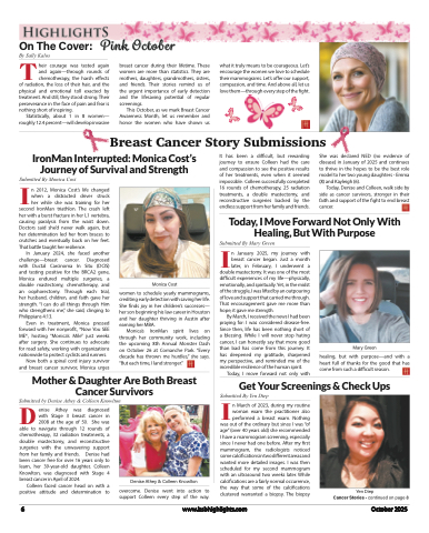 OnTheCover: PinkOctober y Sally KalosBTheir courage was tested again and again—through rounds of chemotherapy, the harsh effectsof radiation, the loss of their hair, and the physical and emotional toll exacted by treatment. And still, they stood strong. Their perseverance in the face of pain and fear is nothing short of inspiring.Statistically, about 1 in 8 women— roughly 12.4 percent—will develop invasivebreast cancer during their lifetime. These women are more than statistics. They are mothers, daughters, grandmothers, sisters, and friends. Their stories remind us of the urgent importance of early detection and the lifesaving potential of regular screenings.This October, as we mark Breast Cancer Awareness Month, let us remember and honor the women who have shown uswhat it truly means to be courageous. Let’s encourage the women we love to schedule their mammograms. Let’s offer our support, compassion, and time. And above all, let us love them—through every step of the fight.IronMan Interrupted: Monica Cost’s Journey of Survival and StrengthISubmitted By Monica Costn 2012, Monica Cost’s life changed when a distracted driver struck her while she was training for hersecond IronMan triathlon. The crash left her with a burst fracture in her L1 vertebra, causing paralysis from the waist down. Doctors said she’d never walk again, but her determination led her from braces to crutches and eventually back on her feet. That battle taught her resilience.In January 2024, she faced another challenge—breast cancer. Diagnosed with Ductal Carcinoma In Situ (DCIS) and testing positive for the BRCA2 gene, Monica endured multiple surgeries, a double mastectomy, chemotherapy, and an oophorectomy. Through each trial, her husband, children, and faith gave her strength. “I can do all things through Him who strengthens me,” she said, clinging to Philippians 4:13.Even in treatment, Monica pressed forward with her nonprofit, *Now You SEE ME*, hosting “Monica’s Mile” just weeks after surgery. She continues to advocate for road safety, working with organizations nationwide to protect cyclists and runners.Now both a spinal cord injury survivor and breast cancer survivor, Monica urgesIt has been a difficult, but rewarding journey to ensure Colleen had the care and compassion to see the positive results of her treatments, even when it seemed impossible. Colleen successfully completed 16 rounds of chemotherapy, 25 radiation treatments, a double mastectomy, and reconstructive surgeries backed by the endless support from her family and friends.She was declared NED (no evidence of disease) in January of 2025 and continues to thrive in the hopes to be the best role model to her two young daughters - Emma (8) and Kayleigh (6).Today, Denise and Colleen, walk side by side as cancer survivors, stronger in their faith and support of the fight to end breast cancer.Breast Cancer Story SubmissionsToday, I Move Forward Not Only With Healing, But With PurposeMonica Costwomen to schedule yearly mammograms, crediting early detection with saving her life. She finds joy in her children’s successes— her son beginning his law career in Houston and her daughter thriving in Austin after earning her MBA.Monica’s IronMan spirit lives on through her community work, including the upcoming 8th Annual Monster Dash on October 26 at Comanche Park. “Every decade has thrown me hurdles,” she says. “But each time, I land stronger.”ISubmitted By Mary Greenn January 2025, my journey with breast cancer began. Just a month later, in February, I underwent adouble mastectomy. It was one of the most difficult experiences of my life—physically, emotionally, and spiritually. Yet, in the midst of the struggle, I was lifted by an outpouring of love and support that carried me through. That encouragement gave me more than hope; it gave me strength.By March, I received the news I had been praying for: I was considered disease-free. Since then, life has been nothing short of a blessing. While I will never stop hating cancer, I can honestly say that more good than bad has come from this journey. It has deepened my gratitude, sharpened my perspective, and reminded me of the incredible resilience of the human spirit.Today, I move forward not only withMary Greenhealing, but with purpose—and with a heart full of thanks for the good that has come from such a difficult season.Mother & Daughter Are Both Breast Cancer SurvivorsSDubmitted by Denise Athey & Colleen Knowltonenise Athey was diagnosed with Stage 3 breast cancer in 2008 at the age of 50. She wasable to navigate through 12 rounds of chemotherapy, 32 radiation treatments, a double mastectomy, and reconstructive surgeries with the unwavering support from her family and friends. Denise had been cancer free for over 16 years only to learn, her 39-year-old daughter, Colleen Knowlton, was diagnosed with Stage 4 breast cancer in April of 2024.Colleen faced cancer head on with a positive attitude and determination to6Get Your Screenings & Check UpsDenise Athey & Colleen Knowltonovercome. Denise went into action to support Colleen every step of the way.SIubmitted By Yen Diepn March of 2023, during my routine woman exam the practitioner also performed a breast exam. Nothingwas out of the ordinary but since I was “of age” (over 40 years old) she recommended I have a mammogram screening, especially since I never had one before. After my first mammogram, the radiologists noticed some calcifications in two different areas and wanted more detailed images. I was then scheduled for my second mammogram with an ultrasound two weeks later. While calcifications are a fairly normal occurrence, the way that some of the calcifications clustered warranted a biopsy. The biopsyYen DiepCancer Stories - continued on page 8 October 2025www.bsbhighlights.com