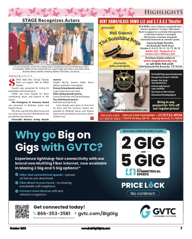 snuSehhineTBoysOctober 2025www.bsbhighlights.com7STAGE Recognizes ActorsDENT DAWG/GLASS DAWG LLC and S.T.A.G.E TheaterL-R Laurie Sanders, Donna Provencher, Barry Goettl,Jay Duval, Daniel Marquez, Robin Cunningham, Ashley Fouse, Angela McCoy, Logan Engel,Judy Utley, Laura Oates, Rene Guzman, Becca Adams, Kimberly Gaines, Kelli Grant, Lou Garza.Submitted By S.T.A. G. E.TAGE Held their Annual Awards Show on August 10th at STAGE Theater.Awards were presented for Acting for both Male and Female Actors.STAGE and Crew Awards for those contributing above and beyond to the season.The Prestigious St Genesius Awardwas presented to Kimberly Gaines and Virginia Gaines.The show was MC’d by Ahley Fouse and Lou Garza and musical entertainment was provided by Pete Martinez.Honorable Mention Acting Awardsor call (830) 438-2339.1300 Bulverde Rd, Buverde , TX 78163went to:Angela McCoy, Jackson Eades, Becca Adams, and Robin CunninghamBronze Acting Awards went to:Logan Engel and Laura OatesSilver Acting Awards went to:Donna Provencher and Daniel Marquez The Gold Awards went to:Kelli Grant and Jay DuvalCrew Awards were given to their best by show and The Genesius Award was awarded to Kimberly Gaines and Virginia Gaines and presented by last year’s winner Ashley Fouse.www.bucketlistoutfitters.com• Full Staff Of Experienced Taxidermists• Average Turn-Around 3-6 Months• Animals, Fish, Birds, Tanning And Euro’s• Professionally Tanned Capes and Hides• Your Choice of 100’S of Poses• International Booking AgencyBring in any project for 10% off our regular prices!Why go Big on Gigs with GVTC?Experience lightning-fast connectivity with our brand new MultiGig Fiber internet, now available in blazing 2 Gig and 5 Gig options!*Ultra-fast symmetrical speeds—upload as fast as you downloadFiber direct to your home—no sharing bandwidth with neighborsConnect more devices with less network congestionGet connected today!866-353-3581 gvtc.com/BigGigWITH*See terms and conditions at gvtc.com/BigGig for more info.presentNeil Simon’sDirected By Robin CunninghamAl & Willie, once a famous vaudeville duo, haven’t spoken in 12 years. CBS invites them to appear in a comedy retrospective; a reluctant reunion is arranged.Old tensions resurface alongside cherished memories & comedic sparks.Opening Night Benefits,the Bulverde Thrift Store October 2, 3, 4, 5, 10, 11, 12, 17, 18, 19Adults $25 / Students $15 Seniors (62+) Military $20Open 6 Days A Week 24/7 Drop Off CoolerREFLECTION TAXIDERMY • (210)722-8936 14370 US Hwy 281 N. • Spring Branch, Tx 78070MULTIGIG FIBER INTERNET PLANS2 GIG ANDNo contract.SYMMETRICAL SPEEDS5 GIGWITHPurchase tickets online atwww.stagebulverde.orgSYMMETRICAL SPEEDS