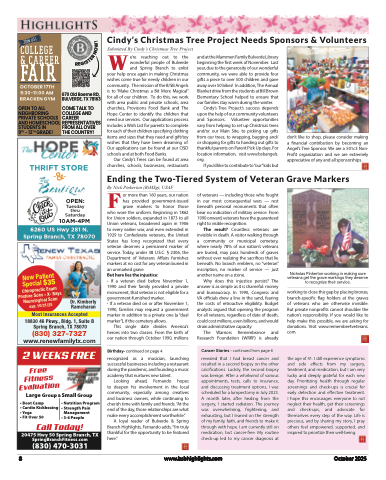 COLLEGE & CAREERFAIROCTOBER 17TH 9:30-11:00 AM BRACKEN GYMOPEN TO ALL NEIGHBORING PRIVATE SCHOOLS AND HOMESCHOOL STUDENTS IN9TH - 12TH GRADE!670 Old Boerne RD, BULVERDE, TX 78163COME TALK TO COLLEGE AND CAREER REPRESENTATIVES FROM ALL OVER THE COUNTRY!THRIFT STOREOPEN:Tuesday thru Saturday10AM-4PM6260 US Hwy 281 N. Spring Branch, TX 78070Most Insurances Accepted2 WEEKS FREELarge Group & Small GroupDr. Kimberly Ramcharan18830 46 Pkwy., Bldg. 1, Suite B Spring Branch, TX 78070(830) 327-7327www.renewfamilytx.com• Boot Camp• Cardio Kickboxing • Yoga• Fit Over 50• Nutrition Program • Strength PainManagement • 3-6 PeopleCall Today!20475 Hwy 50 Spring Branch, TX SpringBranchFitness.com(830) 470-3031Cindy’s Christmas Tree Project Needs Sponsors & VolunteersWSubmitted By Cindy’s Christmas Tree Projecte’re reaching out to the wonderful people of Bulverde and Spring Branch to enlistyour help once again in making Christmas wishes come true for needy children in our community. The mission of the B/SB Angels is to “Make Christmas a Bit More Magical” for all of our children. To do this, we work with area public and private schools, area churches, Provisions Food Bank and The Hope Center to identify the children that need our services. Our applications process includes a Wish List for parents to complete for each of their children specifying clothing items and sizes that they need and gift/toy wishes that they have been dreaming of. Our applications can be found at our CISD schools and at both Food Banks.Our Cindy’s Trees can be found at area churches, schools, businesses, restaurantsand at the Mammen Family Bulverde Library beginning the first week of November. Last year, due to the generosity of our wonderful community, we were able to provide four gifts a piece to over 500 children and gave away over 50 bikes! In addition, The Annual Blanket drive from the students at Bill Brown Elementary School helped to ensure that our families stay warm during the winter.Cindy’s Tree Project’s success depends upon the help of our community volunteers and Sponsors. Volunteer opportunities vary from helping to set up Christmas trees and/or our Main Site, to picking up gifts from our trees, to wrapping, bagging and/ or shopping for gifts to handing out gifts to thankful parents on Parent Pick Up days. For location information, visit www.bsbangels. org.If you’d like to contribute to“our”kids butdon’t like to shop, please consider making a financial contribution by becoming an Angel’s Tree Sponsor. We are a 501c3 Non- Profit organization and we are extremely appreciative of any and all sponsorships.ays days days4PMEnding the Two-Tiered System of Veteran Grave MarkersBy Nick Pinkerton (R)MSgt, USAFFor more than 160 years, our nation has provided government-issued grave markers to honor thosewho wore the uniform. Beginning in 1862 for Union soldiers, expanded in 1873 to all Union veterans, broadened again in 1906 to every earlier war, and even extended in 1929 to Confederate veterans, the United States has long recognized that every veteran deserves a permanent marker of service. Today, under 38 U.S.C. § 2306, the Department of Veterans Affairs furnishes markers at no cost for any veteran buried in an unmarked grave.But here lies the injustice:• If a veteran died before November 1, 1990 and their family provided a private monument, that veteran is not eligible for a government-furnished marker.• If a veteran died on or after November 1, 1990, families may request a government marker in addition to a private one (a “dual marker”), if the cemetery allows.This single date divides America’s heroes into two classes. From the birth of our nation through October 1990, millionsBirthday- continued on page 4recognized as a musician, launching successful businesses including a restaurant during the pandemic, and founding a music academy that nurtures new talent.Looking ahead, Fernando hopes to deepen his involvement in the local community, especially among creatives and business owners, while continuing to cherish time with family and friends. “At the end of the day, those relationships are what make every accomplishment worthwhile.”A loyal reader of Bulverde & Spring Branch Highlights, Fernando adds, “I’m truly thankful for the opportunity to be featured here.”of veterans — including those who fought in our most consequential wars — rest beneath personal monuments that often bear no indication of military service. From 1990 onward, veterans have the guaranteed right to visible recognition.The result? Countless veterans are invisible in death. A visitor walking through a community or municipal cemetery, where nearly 78% of our nation’s veterans are buried, may pass hundreds of graves without ever realizing the sacrifices that lie beneath. No branch emblem, no “veteran” inscription, no marker of service — just another name on a stone.Why does this injustice persist? The answer is as simple as it is shameful: money and bureaucracy. In 1990, Congress and VA officials drew a line in the sand, fearing the costs of retroactive eligibility. Budget analysts argued that opening the program for all veterans, regardless of date of death, could cost millions, even billions, and would strain administrative capacity.The Warriors Remembrance and Research Foundation (WRRF) is alreadyNicholas Pinkerton working in making sure veterans get the grave markings they deserve to recognize their service.working to close this gap by placing bronze, branch-specific flag holders at the graves of veterans who are otherwise invisible. But private nonprofits cannot shoulder the nation’s responsibility. If you would like to help make this possible, we are asking for donations. Visit www.remember4veterans. com.Cancer Stories - continued from page 6revealed that I had breast cancer and resulted in a second biopsy on the other calcifications. Luckily, the second biopsy was benign. After a wh