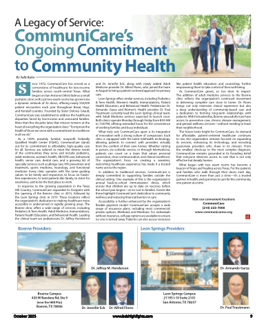 A Legacy of Service:CommuniCare’sOngoing Commitmentto Community Health By Sally KalosS ince 1972, CommuniCare has served as a cornerstone of healthcare for low-income families across south-central Texas. What began on San Antonio’s West Side as a smallpediatric clinic with just two exam rooms has grown into a dynamic network of 32 clinics, offering nearly 550,000 patient encounters each year throughout Bexar, Hays, and Kendall counties. Founded by Sister Dolores Girault, CommuniCare was established to address the healthcare disparities faced by low-income and uninsured families. More than five decades later, that mission remains at the heart of everything the organization does:“To improve the health of those we serve with a commitment to excellence in all we do.”As a 100% privately funded, nonprofit Federally Qualified Health Center (FQHC), CommuniCare stands out for its commitment to affordable, high-quality care for all. Services are tailored to meet the diverse needs of the communities they serve and include pediatrics, adult medicine, women’s health, OB/GYN care, behavioral health, senior care, dental care, and a growing list of specialty services such as allergy care, HIV prevention and treatment, sports medicine, neurology, and functional medicine. Every clinic operates with the same guiding values: to be timely and responsive, to focus on hassle- free experiences, to treat patients like family, to strive for excellence, and to be the best place to work.In response to the growing population in the Texas Hill Country, CommuniCare expanded its footprint with the opening of the Boerne clinic in 2015, followed by the Leon Springs clinic in 2019. These locations reflect the organization’s dedication to making healthcare more accessible in underserved or rapidly growing areas. The Boerne clinic offers a wide range of services, including Pediatrics & Teen Health, Adult Medicine, Immunizations, Patient Health Education, and Behavioral Health. Leading the clinical team are pediatricians Dr. Jeffrey HendersonBoerne Providers:Boerne Campus 430 W Bandera Rd, Ste 9 (near the HEB Plus) Boerne, TX 78006and Dr. Jennifer Eck, along with newly added Adult Medicine provider Dr. Alfred Flores, who joined the team in August to bring a patient-centered approach to primary care.Leon Springs offers similar services, including Pediatrics & Teen Health, Women’s Health, Immunizations, Patient Health Education, and Behavioral Health. Pediatrician Dr. Armando Garza and Women’s Health provider Dr. Paul Trautmann currently lead the Leon Springs clinical team, with Adult Medicine services expected to launch soon. Both clinics operate Monday through Friday from 8:00 AM to 7:00 PM, offering extended hours for the convenience of working families and busy individuals.What truly sets CommuniCare apart is its integration of innovation with a strong culture of compassion. Each clinic is equipped with the latest telehealth technology, allowing patients to connect with providers virtually from the comfort of their own homes. Whether visiting in person, via curbside service, or through telemedicine, patients can count on a team that values personal connection, clear communication, and clinical excellence. The organization’s focus on creating a seamless, welcoming healthcare experience has made it a trusted name across the region.In addition to traditional services, CommuniCare is deeply committed to supporting families outside the clinical setting. One example of this is the organization’s annual back-to-school immunization drives, which ensure that children are up to date on vaccines before the school year begins—at no cost to families. Events like these highlight CommuniCare’s dedication to community wellness and reducing financial barriers to care.Accessibility is further enhanced by the organization’s flexible payment model. CommuniCare accepts a wide range of insurance plans, including most commercial/ private options, Medicaid, and Medicare. For individuals without insurance, self-pay options are available to ensure no one is turned away. Patients can also access resourceslike patient health education and counseling, further empowering them to take control of their well-being.As CommuniCare grows, so too does its impact. The addition of adult medicine services to the Boerne clinic reflects the organization’s continued investment in delivering complete care close to home. Dr. Flores brings not only extensive clinical experience but also a deep understanding of community-based care and a dedication to forming long-term relationships with patients. With his leadership, Boerne-area adults now have access to preventive care, chronic disease management, and general wellness services—without needing to leave their neighborhood.The future looks bright for CommuniCare. As demand for affordable, patient-centered healthcare continues to rise, the organization remains focused on expanding its services, enhancing its technology, and recruiting passionate providers who share in its mission. From the smallest check-up to the most complex diagnosis, CommuniCare remains grounded in its founding belief that everyone deserves access to care that is not only effective but deeply human.What began with two exam rooms has become a beacon of hope and healing across Texas. For the patients and families who walk through their doors each day, CommuniCare is more than just a clinic—it’s a trusted partner in health, and a promise to care for the community, one patient at a time.Visit our convenient locationsCommuniCare (210) 233-7000 www.communicaresa.orgDr. Armando GarzaDr. Paul TrautmannLeon Springs Providers:Dr. Jeffrey M. HendersonDr. Jennifer EckDr. Alfred FloresLeon Springs Campus 21195 I-10 Suite 2101 San Antonio, TX 78257October 2025www.bsbhighlights.com9