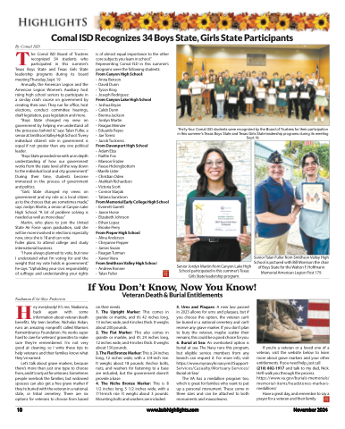 Comal ISD Recognizes 34 Boys State, Girls State ParticipantsBTy Comal ISDhe Comal ISD Board of Trustees recognized 34 students who participated in this summer’sTexas Boys State and Texas Girls State leadership programs during its board meeting Thursday, Sept. 19.Annually, the American Legion and the American Legion Women’s Auxiliary host rising high school seniors to participate in a six-day crash course on government by creating their own. They run for office, host elections, conduct committee hearings, draft legislation, pass legislation and more.“Boys State changed my view on government by helping me understand all the processes behind it,” says Talan Fuller, a senior at Smithson Valley High School.“Every individual citizen’s role in government is equal if not greater than any one political leader.“Boys State provided me with an in depth understanding of how our government works from the state level all the way down to the individual local and city government.” During their time, students become immersed in the process of government and politics.“Girls State changed my views on government and my role as a local citizen as to the choices that are sometimes made,” says Jordyn Martin, a senior at Canyon Lake High School. “A lot of problem solving is needed as well as more ideas.”Martin, who plans to join the United State Air Force upon graduation, said she will be more involved in elections especially now, since she is 18 and can vote.Fuller plans to attend college and study international business.“I have always planned to vote, but now I understand what I’m voting for and the weight that my vote holds in government,” he says. “Upholding your civic responsibility of suffrage and understanding your rightsis of almost equal importance to the other core subjects you learn in school.” Representing Comal ISD in this summer’s programs were the following students: From Canyon High School:• Anna Benson• David Dunn• Tyson King• Joseph RodriguezFrom Canyon Lake High School • Joshua Bryan• Caleb Dunn• Brenna Jackson• Jordyn Martin• Reagan Meinzer• Eduardo Reyes• Jae Torrez• Jacob TucknessFrom Davenport High School• Adam Elza• Raithe Fox• Maeson Frazier• Reese Hickingbottom• Maelle Lister• Christian Oden• Atahliah Richardson• Victoria Scott• Connor Starjak• Tatiana SunstromFrom Memorial Early College High School • Everrett Garrett• Jaxon Hurse• Elizabeth Johnson• Ethan Lopez• Brooke PerryFrom Pieper High School• Alina Anderson• Cheyanne Pepper• James Swain• Reagan Turman• Xavier VieraFrom Smithson Valley High School• Andrew Bonner• Talan FullerThirty-four Comal ISD students were recognized by the Board of Trustees for their participation in this summer’s Texas Boys State and Texas Girls State leadership programs during its meeting Sept. 19.Senior Talan Fuller from Smithson Valley High Senior Jordyn Martin from Canyon Lake High School is pictured with Bill Morrison the chairSchool participated in this summer’s Texas Girls State leadership program.of Boys State for the Walton F. Hoffmann Memorial American Legion Post 179.adianna E’lsi-Skye PinkertonNH ey everybody! It’s me, Nadianna,back again with someinformation about veteran death benefits. My twin brother, Nicholas Aidan, runs an amazing nonprofit called Warriors Remembrance Foundation. He works super hard to care for veterans’ gravesites to make sure they’re remembered. I’m not very good at cleaning, so I write these tips to help veterans and their families know what they’ve earned.Let’s talk about grave markers, because there’s more than just one type to choose from, and it’s not just for veterans. Sometimes people overlook the families, but widowed spouses can also get a free grave marker if they’re buried with the veteran in a national, state, or tribal cemetery. There are six options for veterans to choose from basedVeteran Death & Burial EntitlementsIf You Don’t Know, Now You Know!10www.bsbhighlights.comNovember 2024on their needs.1. The Upright Marker: This comes in granite or marble, and it’s 42 inches long, 13 inches wide, and 4 inches thick. It weighs about 230 pounds.2. The Flat Marker: This also comes in granite or marble, and it’s 24 inches long, 12 inches wide, and 4 inches thick. It weighs about 130 pounds.3. The Flat Bronze Marker: This is 24 inches long, 12 inches wide, with a 3/4-inch rise. It weighs about 18 pounds. Anchor bolts, nuts, and washers for fastening to a base are included, but the government doesn’t provide a base.4. The Niche Bronze Marker: This is 8 1/2 inches long, 5 1/2 inches wide, with a 7/16-inch rise. It weighs about 3 pounds. Mounting bolts and washers are included.5. Urns and Plaques: A new law passed in 2023 allows for urns and plaques, but if you choose this option, the veteran can’t be buried in a national cemetery and can’t receive any grave marker. If you don’t plan to bury the veteran, maybe scatter their remains, this could be a good choice for you. 6. Burial at Sea: An overlooked option is burial at sea. The Navy runs this program, but eligible service members from any branch can request it. For more info, visit https://www.mynavyhr.navy.mil/Support- Services/Casualty/Mortuary-Services/ Burial-at-Sea/The VA has a medallion program too, which is great for families who want to put up a personal monument. These come in three sizes and can be attached to both monuments and mausoleums.If you’re a veteran or a loved one of a veteran, visit the website below to learn more about grave markers and your other entitlements. If you need help, just call (210) 802-1917 and talk to my dad, Nick. He’ll walk you through the process. https://www.va.gov/burials-memorials/ memorial-items/headstones-markers- medallions/Have a great day, and remember to say a prayer for a veteran and their family.