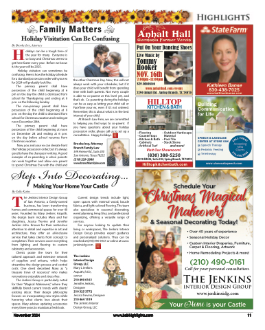 v Family Matters vHoliday Visitation Can Be Confusing HBy Brooke Irey, AttorneyAnhalt Hall Germania Farmer VereinPut On Your Dancing Shoesolidays can be a tough time of the year for many. Everyone is so busy and Christmas seems toget here faster every year. Before we know it, the year will be 2025.Holiday visitation can sometimes be confusing. Hereishowtheholidayschedule for a standard possession order with your ex for 2024 will probably look like:The primary parent shall have possession of the child beginning at 6 pm on the day the child is dismissed from school for Thanksgiving and ending at 6 p.m. on the following Sunday.The non-primary parent shall have possession of the child beginning at 6 p.m. on the day the child is dismissed from school for Christmas vacation and ending at noon December 28th.The primary parent shall have possession of the child beginning at noon on December 28 and ending at 6 p.m. on the day before school resumes from Christmas vacation.Now, you and your ex can deviate front the holiday possession order, but it’s always good to have the changes in writing. A good example of co-parenting is when parents can work together and allow one parent to spend Christmas Eve with the child andLive Music by Tommy Hookerthe other Christmas Day. Now, this will not always work with your schedules, but if it does your child will benefit from spending time with both parents. Not every couple is able to co-parent at this level yet, and that’s ok. Co-parenting during the holidays can be as easy as letting your child call or FaceTime your ex, even if it’s not ordered. Remember, this is about what is in the best interest of your child.At Branch Law Firm, we are committed to helping you find ways to co-parent. If you have questions about your holiday possession order, please call us to set up a consultation. Happy Holidays.Brooke Irey, Attorney Branch Family Law549 Heimer Rd., Suite 200 San Antonio, Texas 78232 (210) 229-2088 www.branchfamilylaw.comNOV. 16th 7:00pm - 11:00pm $20 AdmissionKathleen BanseLLAOTCAY44299.510D.49Making Your Home Your CastleSchedule YourTBy Sally Kaloshe Jenkins Interior Design Groupof San Antonio, a family-ownedbusiness, has been transforming homes and commercial spaces for over 40 years. Founded by Mary Jenkins Asquith, the design team includes Mary and her daughters, Jessica Trevino and Jennifer Jenkins John. Known for their meticulous attention to detail and expertise in art and architecture, they offer an all-inclusive service that takes clients from concept to completion. Their services cover everything from lighting and flooring to custom cabinetry and accessories.Clients praise the team for their tailored approach and extensive network of suppliers and artisans, which helps streamline the design process and control costs. One client described Mary as “a treasure trove of resources” who makes renovations enjoyable and stress-free.The Jenkins Group is particularly noted for their “Magical Makeovers,” where they skillfully blend current trends with clients’ existing décor. Their design philosophy focuses on incorporating new styles while honoring what clients love about their spaces. Mary advises updating accessories every three years to maintain a fresh look.Current design trends include light, open spaces with minimal wood, boucle fabrics, and light-colored flooring. The team also specializes in seasonal decorating, event planning, Feng Shui, and professional organizing, offering a versatile range of services.For anyone looking to update their living or workspaces, The Jenkins Interior Design Group provides expert guidance and personalized solutions. They can be reached at (210) 490-0161 or online at www. jenkinsidg.com.The Jenkins Interior Design Group, LLC Mary L Jenkins Asquith, R.I.D., owner210 490 0161Jennifer Jenkins, Designer210 325 3772Jessica Trevino, Designer 210 464 1519The Jenkins Interior Design Group, LLCChristmas Magical Makeovers& Seasonal Decorating Today!• Over 40 years of experience• Seasonal Holiday Decor• Custom Interior Draperies, Furniture, Carpet & Flooring, Artwork• Home Remodeling Projects & more!(210) 490-0161Call for your personal consultation.The Jenkins interior Design Group www.jenkinsidg.comYour Home is your CastleNovember 2024www.bsbhighlights.com11www.anhalthall.com/events2390 Anhalt Rd., Spring Branch, TX 78070830-438-7025 www.kathleenbanse.com• • ••Flooring Countertops Kitchen & Bath Cabinets Artificial Turf• Outdoor Hardscape Material• Pool Tile• Stack Stoneand more!SPEECH & LANGUAGE CENTER AT STONE OAKSpeech Therapy Pediatric Feeding TeletherapyAccepting New ClientsHILLTOPBuilding Communication for LifeKITCHEN & BATHVisit Our Showroom!(830) 388-525030310 FM306, Suite 204, Spring Branch, TX 78070Hilltopkitchenbath.comwww.stoneoakspeech.com