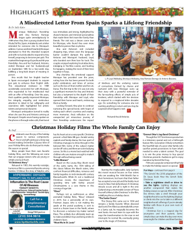 A Misdirected Letter From Spain Sparks a Lifelong FriendshipMBy Dr. Sally Kalosonique Wellesley’s friendship with Ana Romero Borrego began quite serendipitously in1989 when Ana, then a young student from Alcala Del Rio, Spain, mistakenly sent a letter intended for someone else to Monique’s address. Curious and kind-hearted, Monique attempted to find the intended recipient and with no luck decided to respond to Ana herself, proposing to become pen pals. This marked the beginning of a profound 40-year friendship. Ana and her husband, Antonio, visited Monique and her husband,Loyd on September 18th for a two-week stay, fulfilling a long-held dream of meeting in person.Ana recalls that her English teacher in Spain encouraged students to acquire pen pals to enhance their English skills. This educational endeavor in 1989 accidentally connected her with Monique, who responded to her misdirected mail with an offer of friendship. Over the years, Ana’s qualities greatly impressed Monique; her integrity, empathy, and meticulous attention to detail in her calligraphy and seamstress skills highlighted her artistic talents and personal character.Monique’s anticipation turned to reality when she saw Ana and Antonio arriving at the airport. Despite never having spoken on the phone or through video calls, their bondwas immediate and strong, highlighted by shared interests and mirrored personalities that made them feel more like family than friends. The visit was a dream come true for Monique, who found Ana even more beautiful in person than in photos.Ana and Antonio’s visit included shopping trips, where even the language barrier couldn’t dampen the spirits of Antonio and Monique’s husband, Loyd, who bonded over their love for tools. The couples enjoyed exploring local attractions, indulging in Tex-Mex cuisine, and hunting for bargains, making the most of their time together in Texas.Ana cherishes the emotional support Monique has provided over the years, noting how she has been present for both joyful celebrations and times of sorrow, such as the loss of Ana’s mother and her cat, Dama. This first trip to the U.S. was not only a significant moment for Ana and Antonio but also a testament to the depth of their friendship with Monique and Loyd, who opened their home and hearts, embracing them as family.Looking forward, they plan to continue nurturing this special bond, with hopes of visiting each other’s countries and creating more memories. Ana’s reflection on the unexpected yet miraculous journey of their friendship underscores the impactL-R Loyd Wellesley, Monique Wellesley, Ana Romero Borrego & Antonio Becerra.of kindness and the enduring nature of connections formed by chance and nurtured with love. Monique sums up their story with a powerful reminder of the far-reaching effects of simple acts of kindness, which started with her decision to respond to a misplaced letter decades ago. Do something for someone else not wanting anything in return and you may be surprised what happens next.Pictured Ana & Antonio.By StaffChristmas Holiday Films The Whole Family Can EnjoyCelebrants owe the joy of the holiday season to various components. Decor and gift-giving go a long way toward making December a joyous time of year. Holiday films also do their part to make the season so special.Many people have their own favorite holiday films, and the following are some that can engage viewers who are young or simply young at heart.“A Christmas Story”Released in 1983, this warmly nostalgic, humorous film is a perennial favorite among families. It follows the story of Ralphie, whohas his heart set on a very specific Christmas present: a Red Rider BB gun. Amidst wintry exploits and family drama, the true spirit of Christmas manages to shine through in this beloved film. Some of the subject matter can be off-color, and there are some bullying scenes. So this is a movie best watched with children who are mature enough to make it through without being scared.“Little Women”Based on the Louisa May Alcott novel of the same name, the 1994 telling of this classic follows the March sisters, who confront financial difficulties, romance and family tragedies in mid-nineteenth century Massachusetts. While it’s not a traditional Christmas movie, the importance of spending time with family around Christmastime is a core theme in this coming-of-age tale.“Klaus”Perhaps not as well-known as other animated holiday flicks, “Klaus,” released in 2019, has a personality all its own. Postman Jesper, who is not making the grade at the postal academy, is sent to work in a frozen town in the North, where he discovers a reclusive toy maker named Klaus. The unlikely duo ultimately team up to make and deliver toys and bring smiles to children’s faces.“Meet Me In St. Louis”“Emmet Otter’s Jug-Band Christmas”Though this 1977 Jim Henson production is a television special and not a full-length feature film, Generation X likely remembers the heartfelt tale of a poor otter family who sacrifice prized possessions to have what’s needed to enter a talent contest. The goal is to win the prize money to buy special Christmas presents. Audiences get to enjoy narration by Kermit the Frog.Films are a popular component that help to make the holiday season so special.Starring the irreplaceable Judy Garland, this movie musical focuses on four sisters who are awaiting the 1904 World’s Fair in their hometown, but learn that their father has accepted a new job and the family must move to New York beforehand. A Christmas miracle occurs and all is right in the end. Garland sings a memorable version of“Have Yourself a Merry Little Christmas” in the film, solidifying this as a holiday classic.“The Santa Clause”This Disney film came out in 1994 and remains a family favorite. When divorced dad Scott (Tim Allen) accidentally kills a man in a Santa suit, he magically becomes the next Santa. He must learn to cope with the w