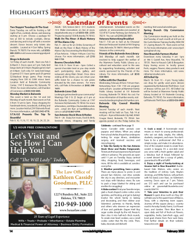 Two Steppin’Tuesdays At The GoatEvery Tuesday, we will be hosting a full night of fun, cocktails, dinner, and dancing starting at 6 pm. Choose a package for two at $60 to include cocktails, dinner, and dancing and to top off with a monster dessert. Dance lessons only tickets also available. Located at 4 Sun Valley, Spring Branch, TX 78070. For more info, call (830)- 885-2209orvisit www.screaminggoatyard. com.Bingo In Bulverde1st Friday of each month. Next one Feb 3 & March 3. Doors open at 5 pm. Early bird bingo starts at 5:30 pm. Regular games start at 6:30pm. Cash only. $3- early bird bingo (3 games) $15 -basic game pack (9 games) $2-blackout bingo game. Prize money ranging from $50 to $300 minus taxes. Location held at Bulverde Community Center, 1747 E Ammann Rd, Bulverde, TX 78163. For more information, call Chamber of Commerce at (830) 438-4285. Monday Market in BulverdeThis event is held on the 1st and 3rd Monday of each month. Next event on Feb 6 from 10 am to 3pm. Enjoy shopping for handmade items, woodwork, clothing and more. Location held at 2541 Bulverde Road. For more information, call (361) 945-4778. S.T.A.G.E Presents The Trip To BountifulFeb 9, 10, 11,16, 17, 18, 19, 23, 24, 25, 26 .Calendar Of EventsAdults - $20, Seniors (62+) - $17, students -$12. Make reservations on line at www. stagebulverde.org or call (830) 438- 2339. Theater located at 1300 Bulverde, TX 78163. Walk On The River: A Black History Of The Alamo CityFeb. 9 - Join us for an Online Screening of Walk on the River: A Black History of the Alamo City Documenting the Black history of San Antonio. 7:00pm- 9:00 pm. Cost: You choose. For more information, call (210) 560-1733.Boerne Chocolate WalkFeb10&11-from10am–5pm.Collecta special chocolate treat as you step inside each participating store, gallery, and restaurant along Main Street. Once done visiting all the stores, you can return your raffle ticket for a chance to win prizes donated by the store owners. For more info, call Parks & Recreation at (830) 248- 1635.Bulverde Lions ClubLooking to get involved in your community? MeetingsFeb9&23beginat6pmat the Bulverde Community Center at 1747 Ammann Rd, Bulverde, TX 78163. For more information, visit https://bulverdelionsclub. com , email Jim Barr at barr888@yahoo. com or call (210) 867-0799.San Antonio Stock Show & RodeoFeb 9 – 26. Enjoy live music, food & drink, livestock shows, shopping and familyentertainment. Scheduled events on the website at www.sarodeo.com.Located at 723 AT & T Center Parkway, San Antonio, TX 78219. You can call (210) 225-5851. Veterans Networking Breakfast Feb.17. 7:30 am to 9am at Ay Chiwawa! Mexican Restaurant located at 403 Singing Oaks, Bulverde, TX 78070. Meet your fellow Veterans in the community.Friends of the Bulverde Area Library3rd Monday of each month. Get involved to help support the welfare of the Mammen Family Public Library as a cultural and education asset to the area by supporting fundraising, activities and events sponsored by the Friends of the Library. For more information, call (830) 438-4864.Coffee with the ChamberWednesday, February 8 from 7:30 am-9am. Networking from 7:30 -7:50 am program starts at 8 am. Location at Mammen Family Public Library located at 131 Bulverde Crossing, Bulverde TX 78163. No cost. For more information of chamber events, visit www.bulverdespringbranchchamber.com. Bulverde City Council Monthly MeetingSecond Tuesday of each month. Next meeting will be held on Tues. Feb 14 at 6:30 pm – 8 pm at Bulverde City Hall, 30360 Cougar Bend, Bulverde, TX 78163. See agenda posted on the Friday before themeeting. Visit www.bulverdetx.gov.Spring Branch City Commission MeetingCity Commission meeting are held on the 2nd Tuesday of each month at 6:30 pm at the Curtis Bremer Training Facility, 9850 FM 311, Spring Branch, TX. Next event on Feb 14. For more information, visit www.cityof- springbranch.org .New Braunfels Farmers MarketDowntown every Saturday 9 am- 1pm at 186 S Castell Ave, New Braunfels, TX 78130. Next to Krause’s Café & Biergarten. Enjoy having access to locally grown fruits, veggies, flowers, dairy products and more. For more information, visit www. nbfarmersmarket.com.All Dolled UpMarch 18- from 10 – 4 pm. Young ladies can shop for gently used prom dresses organized by the Bulverde Thrift Store. Cost of dresses will be just $15. All Dolled Up will be hosted at Mammen Family Public Library located at 131 Bulverde Crossing, Bulverde, TX 78163. For more information, call Bulverde Thrift Store at (830) 436-6482.Celebrate - continued from page 11 home. Consider older animals over puppies and kittens. When you adopt from a local shelter, the pet has undergone testing for major illness, sterilization surgery, and received vaccines and microchipping.2. Take the family to the San Antonio Stock Show and Rodeo Fairgrounds. Tickets are the least expensive if purchased online in advance. The grounds are open until 11 pm on Tuesday. Enjoy carnival rides, shopping, food, beverages, and more. All the info is available at: sarodeo. com/p/fair3. Weather permitting, have a picnic. There are many places to picnic in and around San Antonio. Just drive outside the city in any direction, and encounter rest stops with fabulous views. Be sure to pack a large blanket for sitting and another for snuggling!4. Bake cookies! Find your favorite recipe, grab a heart-shaped cookie cutter, some sprinkles, and frosting, and get to baking! Involve the whole family in baking and decorating, and then deliver your Valentine’s yummies to friends, family, and others who deserve an expression of love and gratitude. (Super Hint! Buy sugar cookie dough by the roll, freeze it, then slice it into half-inch thick rounds. To create mini heart cookies, use a small cookie cutter that fits the circle. Then, bake, decorate and deliver!)5. Cook a meal. A homemade meal means so much to young professionals who eat out daily, singles, the elderly, students, caregivers, and more. You don