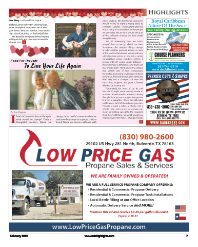 Love Story - continued from page 6a referral, since he lived in Universal City). When he replied, “I can take care of all of your needs.” BAM just like that, I was back in high school, crushing on the football star!We dated for two years before eloping at Niagara Falls and have lived a beautiful life ever since.when making life-directional decisions? Would we try to right a wrong done to someone? Careful. . . if we were to alter too much, many of us would not be the people we are today. We are who we are because of the collective choices we have made along the way.Yet, it’s interesting how we touch people’s lives as we go about our own. Sometimes the simplest things change or alter another person’s actions or view of the world. A kind word versus criticism, a kind gesture versus a rude act, a caring conversation versus mindless clichés, a sincere interest versus social distance--- these do make a difference. And that’s just the simple stuff! Think about the impact that greater acts of love, compassion, friendship, and caring could have on those around us. Not only does it alter someone else’s day, but it changes our own life. Each of us, recipient, and giver, is forever affected by a caring act.Fortunately, for most of us, it’s not too late to right some wrongs made in our lives. A kind word to a friend, a loving thought for a spouse, a supportive gesture to a son or daughter---these can still make a difference. Just let them know you care. Flowers, a card, a letter, a phone call, a simple note, even a text or e-mail---can mean something special to the recipient. And, there’s still time. So, what would you change in your life? Now. . . change it today.Food For ThoughtTo Live Your Life AgainIBy Lou Dugganf each of us were to live our life again, what would we change? That’s a thoughtful question. Would wechange those hurtful moments when we saidsomethingmeantoaspouse,child,or friend? Would we choose a different pathRoyal Caribbean Allure Of The Seas~Now Sailing Out of GalvestonSPECIALIZE IN:Ocean cruises,River cruises HoneymoonsAll Inclusive Resorts Family Reunion Trips Destination WeddingsCall Today To Book Your Spring Break & Summer Cruises.Mimi Boone - Cruise Planners 281-744-6519 www.deckthesea.comPremier Cuts & Shaves830-438-8002 Mon-Thurs 10am-7pm Fri-10am 5pm.29774 US 281 North Suite 105Bulverde.TX 78163 (Call for Availability)www.barber281.comSat-appointment only(830) 980-260029102 US Hwy 281 North, Bulverde, TX 78163WE ARE FAMILY OWNED & OPERATED!WE ARE A FULL SERVICE PROPANE COMPANY OFFERING:• Residential & Commercial Propane Delivery• Residential & Commercial Propane Tank Installations • Local Bottle Filling at our Office Location• Automatic Delivery Service and MORE!Mention this ad and receive $0.20 per gallon discount.Expires 2-28-23www.LowPriceGasPropane.comFebruary 2023www.bsbhighlights.com 7