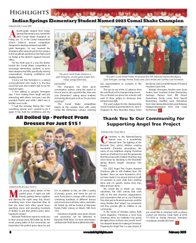 Indian Springs Elementary Student Named 2023 Comal Shake ChampionSubmitted By Comal ISDAfourth-grade student from Indian Springs Elementary was named the 2023 Comal Shake champion on Friday, Jan. 13, in the Comal Independent School District’s annual competition designed to develop interpersonal skills. Lylah Yerrington, 10, was crowned the champion after advancing from her campus to the semifinals and then to the final round on Friday at the district’s Support Services office.For the ninth year in a row, the district hosted the Comal Shake competition to encourage elementary students to hone their interpersonal skills, specifically, starting conversations, showing confidence and shaking hands.It turns out that Yerrington is a natural conversationalist who made it to the final round last year and couldn’t wait to try her hand at it again.“I love talking to people,” Yerrington says. “I love making them laugh and just interacting with others. Last year, I was the youngest finalist, and while I didn’t win, it felt like I won inside.“I had this amazing feeling like I had something special, and I wanted to do it again. It has built my confidence and myThis year’s Comal Shake champion is Lylah Yerrington, a fourth-grade student from Indian Springs Elementary.personality.”The champion has three go-toconversation starters: using the season or time of year to ask a question like, ‘How was your December?’; asking about hobbies; and asking about pets such as, ‘Do you have any dogs?’The Comal Shake competition begins at the campus level with every Comal ISD elementary campus selectingThis year’s Comal Shake finalists are pictured from left: Adrianna Rizalado-Mandujano, Lylah Yerrington, Santiago Herrera, Brody Lewis, Quira Anders and Geoffrey Liam Richardson.two representatives to compete in the semifinals.The top six out of the 32 advance from the semifinals to the championship round. The six finalists are given two minutes with each of three judges to showcase their interpersonal skills.This year’s judges for the championship round included Superintendent Dr. John E. Chapman III, New Braunfels Mayor RustyBrockman and Comal ISD Board of Trustees President Jason York.Besides Yerrington, finalists were Quira Anders from Goodwin Frazier Elementary, Santiago Herrera from Bill Brown Elementary, Brody Lewis from Specht Elementary, Geoffrey Liam Richardson from Clear Spring Elementary and Adrianna Rizalado-Mandujano from Oak Creek Elementary.All Dolled Up - Perfect Prom Dresses For Just $15 !Thank You To Our Community For Supporting Angel Tree ProjectCSubmitted By Cindy Hursthristmas in the Bulverde/Spring Branch area is a wonderfully blessed time. The lighting of theBulverde Tree, school children creating wonderful Christmas decorations, the voices of our neighbors singing Christmas carols on Christmas Eve and the generosity that they share with children that they may never know by donating to the Bulverde/ Spring Branch Angel’s Christmas Tree Project.Our 2022 Angel Tree Project donated Christmas gifts to 495 children from 195 families! Since we were founded in 2015, we have made it our annual mission to gift 4-5 presents to each child, from clothing items and 2-3 specific wishes from toys, bikes and teen items.We would like to thank our many volunteers, the CISD schools that work with us, the area churches, organizations, and corporations that act as our Christmas Tree sites and as financial sponsors, and the many families that “adopt” our ornaments and thus provide gifts to children in our community.In the words of Christian author, Ruth Carter Stapleton, “Christmas is most truly Christmas when we celebrate it by giving the light of love to those who need it most.” Our deepest thanks for making it Christmas. Preparing for Angel Tree is a year project. IfMSubmitted By Kristina Vickersost young ladies dream of theperfect prom. A night out withfriends, getting dinner together and dancing the night away. But, there’s something even more important than all that: the dress! Girls often spend hours searching stores and spending hundreds of dollars to get that perfect prom dress,hoping it’s unique.Bulverde Thrift Store wants to invite youto their annual event, All Dolled Up. At this event, young ladies in the community can hand-select the perfect prom dress for just$15. In addition to this, we offer a variety of jewelry, purses, and shoes for just $5 each. Every dress is unique, with a selection containing hundreds of different dresses and accessories in all sizes, colors, and styles. All Dolled Up will be hosted at Mammen Family Public Library on March 18th from 10-4.Donations of gently worn prom dresses and accessories can be delivered to Bulverde Thrift Store. For more information, call Bulverde Thrift Store at (830) 436-6482.you would like to volunteer with us please contact our Director, Cindy Hurst at (210) 771-7639 or Deidra Hancock, Volunteer Coordinator at (405) 659-0667.8www.bsbhighlights.comFebruary 2023