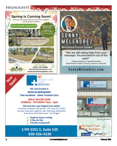 Spring Is Coming Soon!Get your yard ready with our top-notch irrigation and landscape services.BOOK YOUR FREE CONSULTATION$200 OFF Any Project!Valued at $2,000 or More (Exclusions Apply).Call Today!(210) 791-6788 admin@benitezirrigation.comwww.benitezirrigation.com“We are still riding high from yourmessage. You knocked it out of thepark!”~Pamela Swanson, Superintendent, Westminster Public Schools, Denver, ColoradoSonnyMelendrez.comOur 2nd location is OPEN IN BERGHEIM!Two locations. Same Trusted Care.WALK-IN FOR CARE MONDAY - SATURDAY 8am - 8pmWe treat ALL your Urgent Care needs.Infections, illnesses, and injuries: UTI, strep, flu, COVID, ear pain, back pain, migraine, rash, bite/sting, dehydration, lacerations and broken bones - for all ages!Rapid In-House Testing X-Ray On SiteFriendly Caring Staff1 FM 3351 S, Suite 135 830-336-43302 www.bsbhighlights.com February 2025Now Open!