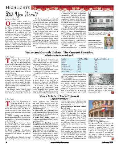 Did You Know?1952 to serve hot meals to the school for 31 cents a plate. The school equipped the cafeteria with a refrigerator, deep freezer, electric stove, hot water heater, and three- compartment stainless steel sink. Mrs. Charles Staudt served the meals to students and teachers. An outside kitchen was built in 1957 and enclosed in 1966.A dedication ceremony and barbeque were held on May 11, 1952. The center is host to the Bulverde Spring Branch Chamber Foundation’s Bingo in Bulverde evening on the first Friday of every month. The 2025 Spring Chicken BBQ & Festival will be held on April 27. The spring festival proceeds go toward maintenance of the center. The venue is also available for special events. Go to https://www.bulverdecommunitycenter. org/ for more information.Contact me at connieclark. conniecanwrite@gmail.com to provideBOy Connie McFall Clarkn East Ammann Road near Bulverde Road is the Bulverde Community Center, establishedin 1951. A nationwide organization called the Grange was formed for the betterment of agriculture and rural communities had a presence in the Bulverde area. That organization approved Oscar Schmidt’s vision for a community center to host social events. San Antonio businessmen L. E. Travis, Marshall Lasswell, Lynn Allen, Dr. Gus Pagenstecker, and Ned Wells offered their advice, services, business experience, and financial aid to the project. These men and their families became residents of the rural community of Bulverde.The Grange purchased and donated the 6.3 acres of land where the community center stands today. It was next to the Rahe Rural High School. Reinhold Leismann & Sons of Blanco was the building contractor. Groundbreaking began in July 1951 and was completed in October 1951. People of the community were instrumental in helping complete the structure.On December 31, 1951, the first dance was held at the community center. Music was provided by Herbert Laubach and the Rhythm Pals. Dances were held monthly following the first Valentine’s Day Dance in February 1952. The dances continued for 29 years.A cafeteria was added in Februaryhistorical events, people and places that our readers would be interested in.Connie McFall Clarkspotlights historical and human interest stories from the area. www.conniecanwrite.comTBy Lou Duggano alleviate the severe drought conditions in the San Antonio area, it would take approximately9 to 10 inches of rain spread over a period of time to significantly replenish water resources and improve soil moisture levels. This amount of rainfall would help raise reservoir levels and provide much-needed relief to the region.Restoring the Edwards Aquifer to normal conditions depends on several factors, including the current water levels, the rate of water usage, and the amount of rainfall needed to replenish the aquifer. Generally, significant and sustained rainfall over the aquifer’s recharge zone is required to restore it to normal levels.The Edwards Aquifer Authority (EAA) uses a network of rain gauges and NEXRAD radar data to estimate the amount ofTBy Lou Dugganhe 2025 Texas Legislative sessionbegan on January 14. The stateopened the session with a $20B surplus. More than 2,000 bills were filed before the session kicked off. There are several key priorities on the agenda. Below are some of the main issues expected to be forwarded:1. School Funding and Vouchers: Increased funding for public schools and the introduction of a school voucher program are high on the list.2. Property Taxes: Continued efforts to provide property tax relief, including potential elimination of school property taxes, are being discussed.3. Border Security: Strengthening interagency operations to combat criminal enterprises at the border is a significant focus.4. Energy, Emerging Technologies, and AI: Evaluating the impact of renewableA Series on Water and GrowthWater and Growth Update: The Current SituationLocationBoerne Blanco BulverdeNew Braunfels KerrvilleSan Antonio Airpor Canyon Lake2024 Rainfall (in)27.31 30.45 44.0 25. 56 25.43 24.00 20.0Avg Annual Rainfall (in)35.02 34.13 32.0 34.29 27.30 33.00 36.0rainfall that becomes recharge to the aquifer. This data helps in understanding the precipitation trends and evaluating the effectiveness of recharge efforts.As of January 1, 2025, the Edwards Aquifer levels were as follows:• San Antonio Pool (J-17 Index Well): 627 feet • Uvalde Pool (J-27 Index Well): 831.1 feet• Comal Springs: 62 cubic feet per second (cfs)• San Marcos Springs: 84 cfsThe San Antonio Pool was in Stage 4, which means a 40% reduction in groundwater withdrawals, while the Uvalde Pool was in Stage 5, with a 44% reduction.As of January 4, 2025, Canyon Lake in Texas was at 50% capacity with a water level of 880.64 feet above sea level. This is significantly lower compared to its historical levels. The lake’s highest recorded level was950.32 feet in 2002 during a major flood event. As of this date, the lake was 28.36 feet below the flood pool.Locally, here’s a comparison of the 2024 rainfallnumbersforBoerne,Blanco,Bulverde, New Braunfels, Canyon Lake, Kerrville, and San Antonio International Airport:Remarkably, Bulverde received more rainfall than its average annual amount, while others received less. A significant factor in its rainfall capture was a rainfallof 14.375 inches of rain during July. All Bulverde rain amounts were captured, measured and logged by rain gauge at Highway 281 & 1863.shutting out Highland Park in the second half and securing the win.San Antonio Airport ConstructionCity officials kicked off a new era for the San Antonio International Airport (SAT) this week by breaking ground for a new terminal. The $1.68 billion new terminal will be constructed alongside the existing Terminal B and built to accommodate the region’s continued growth. The 800,000-square-foot terminal is expected to be completed in 2028.News Briefs of Local InterestLegislative Updateenergy, exploring new technologies like small 