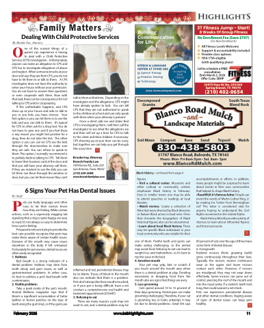vFamily Mattersv Dealing With Child Protective ServicesOBy Brooke Irey, Attorneyne of the scariest things of a parent can experience is having to deal with a Child ProtectiveServices (CPS) investigation. Unfortunately, anyone can make an allegation to CPS and CPS has to investigate allegations of abuse and neglect. When someone knocks at your door and says they are from CPS, you do not have to let them in or talk to them. A CPS investigator does not have the authority to enter your house without your permission. You do not have to answer their questions or even cooperate with them. Now with that said, there can be consequences for not talking to CPS and/or cooperating.If the unthinkable happens, and CPS show up at your house and asks to talk to you or you kids, you have choices. Your first option is you can let them in to see the kids and you can talk to them. It’s typical for CPS to often ask for a drug test. You do not have to give one and if you feel there is any reason you might test positive for a drug, then do not take the test. The other option is you can can let CPS see the kids through the door/window to make sure they are safe. You can refuse to speak to them. The option, I normally recommend is to politely decline talking to CPS. Tell them to leave their business card at the door and that you will have your attorney call them. If they are insistent to see the kids you can let them see them through the window or door, but you can let them know they can’t3T Fitness Jump - Start! 8 Weeks Of Group FitnessNo Enrollment Fee (Save $797)(For New Enrollments)All Fitness Levels Welcome Support & accountability included Flexible class optionsHSA/ FSA eligible(with qualifying plans)Call to schedule a FREE consultation Ends March 2, 2026 Offer Code: SBHP20475 Hwy 46 Ste. 250/260 Spring Branch, TX 78070(210) 402-0654Building Communication for LifeSPEECH & LANGUAGE CENTER AT STONE OAKSpeech Therapy Pediatric Feeding TeletherapyAccepting New Clientswww.stoneoakspeech.comtalk to them at that time. Depending on the investigator and the allegations, CPS might have already spoken to kids. You can tell CPS that they are not authorized to speak to the children at school and can only speak with them when your attorney is present.Once a client calls me and states that CPS is investigating them, I will then call the investigator to see what the allegations are and then will set up a time for CPS to talk to the client and their children if necessary. CPS showing up at your door can be scary, but together, we can help you get through this scary time.Brooke Irey, Attorney Branch Family Law549 Heimer Rd., Suite 200 San Antonio, Texas 78232 (210) 229-2088 www.branchfamilylaw.comDecomposed GraniteSoil MixesCompostBase SandSouth Texas Blend RockMulch830-438-580331767 Blanco Road, Bulverde, TX 78163 Hours: Mon- Fri-8am-5pm • Sat. 8am- 3pmwww.BlancoRdMulch.comTopsoilBlack History - continued from page 4figures.• Visit a cultural center. Museums and other cultural or community centers emphasize Black history in February. Even in smaller towns one may be able to attend speeches or readings at local libraries.• Watch movies. Curate a collection of films that were directed by Black directors or feature Black actors in lead roles. Films that chronicle the biographies of Black historical figures also can be educational. • Learn about local Black history. There may be specific Black individuals in your local community who are notable for theiraccomplishments or efforts. In addition, many people might be surprised to learn about events in their own communities that helped to shape Black history.• Read MLK Jr’s famous letter. People can revisit the words of Martin Luther King, Jr. by reading his “Letter From Birmingham Jail.” The letter is considered vital for anyone hoping to understand the Civil Rights movement in the United States.Black History Month provides plenty of chances to learn about influential figures and historical events.6 Signs Your Pet Has Dental IssuesBy StaffPets use body language and other cues to let their owners know how they are feeling. While certain actions, such as a vigorously wagging tail signaling that a dog is quite happy, are easy to read, it’s not always so easy to determine how a pet is feeling.Pet parents who are trying to provide the best care possible recognize that pets may make them aware of certain health issues. Diseases of the mouth may cause issues elsewhere in the body if left untreated. Fortunately for pet owners, dental issues are often easily recognized.1. HalitosisBad breath is a strong indicator of a dental problem. Halitosis may stem from tooth decay and gum issues, as well as gastrointestinal problems. In either case, it’s best to address a pet’s bad breath with a veterinarian.2. Visible problemsTake a peek inside of the pet’s mouth.Animal Wellness magazine says that if there’s a significant accumulation of tartar (yellow or brown patches on the tops of teeth along the gum line), or if the gums areinflamed and red, periodontal disease may be to blame. Traces of blood in the mouth also can indicate that there is a problem. Pets don’t always like their mouths touched, so if your pet is being difficult, have a vet conduct a comprehensive oral health and treatment appointment (COHAT).3. Refusing to eatThere are many reasons a pet may not want to eat, and a dental problem may beone of them. Painful teeth and gums can make eating challenging, so the animal may avoid food. Refusing to eat can lead to weight loss and malnutrition, so it’s best to nip this issue in the bud.4. Sensitive mouthYour pet may yelp, bite or scratch if you touch around the mouth area when there is a dental problem at play. Drooling excessively or dropping food from the mouth also are signs that things are awry. 5. Less groomingCats spend around 10 to 15 percent of their days grooming. Dental pain can make grooming challenging. Therefore, if your cat is grooming less or 