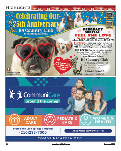 Celebrating Our25th AnniversaryK9 Country Club & Training AcademyFEBRUARY SPECIAL:Follow all the love! k9countryclubtexas12www.bsbhighlights.comFebruary 2026around the cornerADULTCARE CAREBoerne and Leon Springs Campuses(210)233-7000COMMUNICARESA.ORGWOMEN’S HEALTHFEEL THE LOVEPro Shop: Spend $20 or more and geta Free Gift. Final Holiday Blow out... 75% OFF!Boarding: Book Your pup for two nights over Valentine’s Weekend, Mention this ad, and get FREE Services* (*Hugs n’ Loves or Beach Club*)WE OFFER: Daycare • Overnight Boarding • Grooming Cattery • Beach Club • Dock Diving • Pet Bakery • Big Hugs • Lot’s of LovinAward Winning TrainingFollow us for specials all year long!PEDIATRICACCEPTING NEW PATIENTS!