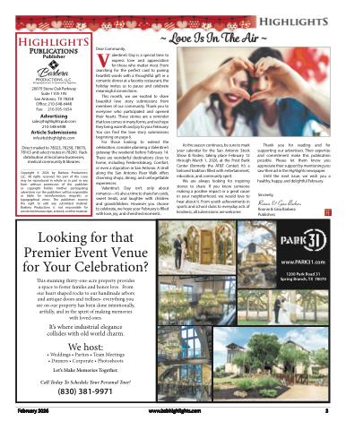 ~ Love Is In The Air ~ DVear Community,alentine’s Day is a special time to express love and appreciation for those who matter most. Fromsearching for the perfect card to pairing heartfelt words with a thoughtful gift or a romantic dinner at a favorite restaurant, the holiday invites us to pause and celebrate meaningful connections.This month, we are excited to share beautiful love story submissions from members of our community. Thank you to everyone who participated and opened their hearts. These stories are a reminder that love comes in many forms, and we hope they bring warmth and joy to your February. You can find the love story submissions beginning on page 6.For those looking to extend the celebration, consider planning a Valentine’s getaway the weekend before February 14. There are wonderful destinations close to home, including Fredericksburg, Comfort, or even a staycation in San Antonio. A stroll along the San Antonio River Walk offers charming shops, dining, and unforgettable experiences.Valentine’s Day isn’t only about romance—it’s also a time to share fun cards, sweet treats, and laughter with children and grandchildren. However you choose to celebrate, we hope your February is filled with love, joy, and cherished moments.HighlightSPublications PublisherPRODUCTIONS, LLCBringing Business & Community Together20079 Stone Oak Parkway Suite 1105-195San Antonio, TX 78258 Office: 210-548-6448 Fax: 210-595-1654Advertisingsales@highlightspub.com 210-548-6448Article Submissionsinfo@bsbhighlights.comDirect mailed to 78023, 78258, 78070, 78163 and select routes in 78260. Rack distribution at local area businesses, medical community & libraries.Copyright © 2024 by Barbera Productions LLC. All rights reserved. No part of this issue may be reproduced in whole or in part in any form without permission of the publisher or copyright holder. Neither participating advertisers nor the publishers will be responsible or liable for misinformation, misprints or typographical errors. The publishers reserve the right to edit any submitted material. Barbera Productions is not responsible for unsolicited manuscripts, artwork, or other material.Looking for thatPremier Event Venuefor Your Celebration?This stunning thirty-one-acre property provides a space to foster familes and honor love. From our heart shaped rocks to our handmade arbors and antique doors and trellises- everything you see on our property has been done intentionally, artfully, and in the spirit of making memories with loved ones.It’s where industrial elegance collides with old world charm.We host:• Weddings • Parties • Team Meetings • Dinners • Corporate • PhotoshootsLet’s Make Memories Together.Call Today To Schedule Your Personal Tour!(830) 381-9971www.PARK31.com1200 Park Road 31 Spring Branch, TX 78070As the season continues, be sure to mark your calendar for the San Antonio Stock Show & Rodeo, taking place February 12 through March 1, 2026, at the Frost Bank Center (formerly the AT&T Center). It’s a beloved tradition filled with entertainment, education, and community spirit.We are always looking for inspiring stories to share. If you know someone making a positive impact or a great cause in your neighborhood, we would love to hear about it. From youth achievements in sports and school clubs to everyday acts of kindness, all submissions are welcome.Thank you for reading and for supporting our advertisers. Their expertise and commitment make this publication possible. Please let them know you appreciate their support by mentioning you saw their ad in the Highlights newspaper.Until the next issue, we wish you a healthy, happy, and delightful February.Sincerely,Ronnie & Gina BarberaRonnie & Gina Barbera PublishersFebruary 2026www.bsbhighlights.com3