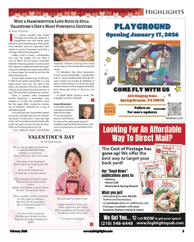 Why a Handwritten Love Note Is Still Valentine’s Day’s Most Powerful GestureIBy Sonny Melendrezn a season crowded with instant messages and same-day deliveries, a handwritten love note stands apartbecause it asks something rare of the writer: time, intention, and care. Especially when written in cursive, it becomes more than a message. It becomes a keepsake.Unlike a text or email, a handwritten love note has weight. You can hold it. You can fold it. You can keep it. Long after Valentine’s Day has passed, it can be tucked into a drawer or slipped between the pages of a book, waiting to be rediscovered. When it is found again, the words do not feel old. They feel preserved.Cursive adds another layer of intimacy. It reflects the writer’s personality in a way typed words never can. The slant of the letters, the pressure of the pen, the rhythm of the lines all reveal mood and emotion. It says,“This came from my hand, not a screen.”There is another, often overlooked benefit. Receiving a handwritten note inspires us to write one ourselves, much like the ripple effect created by random acts of kindness. Gratitude has a way of reproducing itself.On a personal note, I have letters written by my two sons that mean more to me than any award I could receive. I have also kept every card my loving and passionate wife, Linda, has given me over the past 42 years. That is a lot of love preserved in ink.I once believed perfect penmanshipPLAYGROUNDOpening January 17, 2026COME FLY WITH US334 Singing Oaks Spring Branch, TX 78070Follow usfor more updatesmattered. It doesn’t. As long as the words can be read, it is the emotional honesty that counts.On Valentine’s Day, when expressions of love can feel predictable, a handwritten note in cursive quietly breaks through the noise. It does not compete for attention. It earns it. And in doing so, it carries the quiet evidence that someone stopped what they were doing and chose to focus on one person.As Ralph Waldo Emerson wrote, “The only gift is a portion of thyself.”Sonny Melendrezis an award-winningmotivational speaker,Hall of Fame radio/TV host and author,based in San Antonio.For more of his enthusiastic brand of inspiration and speaking information, visit www.SonnyMelendrez.com and listen to his podcast.Looking For An Affordable Way To Direct Mail?The Cost of Postage has gone up! We offer the best way to target your back yard!Our “Good News”publications goes to:• Helotes• Stone Oak• Bulverde & Spring BranchWhat you get!• Advertising to over 48,000 homes and businesses.• A customize ad at no additional cost.• Packages available with your business feature article & video!We Got You... Call NOW to get your space!(210) 548-6448www.highlightspub.comVALENTINE’S DAYBy Tish Smith JenningsWe’ve said goodbye to Christmas. It’s almost Valentine’s Day. January is crash time. Hearts and roses aren’t far away.Decorations are displayed. Room lights are bright pink and red.This is such a festive hue.It looks like a fire has spread.Kids exchange Valentine’s cards. They munch on sweet candy hearts.Maybe they’ll have a school dance. Another fun occasion starts.Music, candles, dinner, and wine, It is the night of romance.We dress for the ambiance. We’ve made great plans in advance.It’s nice to feel so special. This day goes by way too fast. They should make it Valentine’s Week.We girls want to make it last.Happy Valentine’s Day, y’all.I hope everyone’s got a date With chocolates and flowers sent, Gentlemen, don’t arrive late!It is time to celebrate!February 2026www.bsbhighlights.com 5