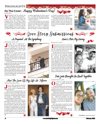 OnTheCover: HappyValentine’sDay! y Sally KalosBValentine’s Day has evolved over time, taking on many identities— from a religious observance andancient ritual to the modern holiday we recognize today. This evolution reflects the flexibility of its meaning, allowing each person to define and celebrate it in their own way. Whether you choose to skip the holiday altogether, enjoy a sweet treat or a bouquet of flowers, or take a momentto express appreciation for those around you—co-workers, friends, family members, or romantic partners—Valentine’s Day truly is what you make of it.At its heart, the desire to love and be loved is a universal human experience. While romantic love often grows from attraction, platonic love is rooted in selflessness and genuine care. Love, in its truest form, does not require a romantic relationship;it is found in prioritizing others, offering kindness, and acting with compassion.This Valentine’s Day, let us celebrate love in all its forms and look for ways to bring warmth, kindness, and care into the lives of those around us. May we all experience the joy of a love that uplifts, supports, and nurtures.Love Story SubmissionsA Proposal At The Symphonyennifer went to Lackland for a site visit to one of the buildings she designed. This was the sameHow I Met My Honey Submitted By Coach KImet my honey when I was 12 years old. I loved him even then. Not too long after, my mother made me stop seeing him. We remained friends and he then became my first intimate experience.As time went on, I had a son, married and moved out of the country. He found me in 2014 on the Classmates website. We messaged infrequently throughout the years and saw each other in 2020 when I was going through my divorce. The same infrequent contact continued until I unfortunately had an ex-boyfriend that had a hard time letting go and messaged my honey. This caused us to reconnect and the rest is history. We have begun a relationship rooted in the past; now being built in the future. I believe that he was my first, my present and hopefully my forever love.Fate Just Brought Us Back Together OSubmitted By Renee Kuthyubmitted By Jennifer AlleySJjobsite as Joshua’s projects. That day a few employees went to lunch and Josh couldn’t take his eyes off Jenn.Josh had two season tickets to the Symphony. He asked Jenn to go with him, fully expecting her to say no. She said yes, and Josh rushed to make dinner reservations at Silo, have his suit cleaned, and get flowers.On the 2nd date while walking through Eisenhower Park, Jennifer was sure that she finally found her perfect match!A few months later, Josh recommended that they have dinner at Silo before the last show of the Symphony season - just like their first date! About 5 minutes before the show was going to start, Josh got down on one knee and proposed! Jenn said yes and everyone was clapping.Met The Love Of My Life At FifteenJSubmitted By Douglas Weaveruly 4, 1965, my parents took their family including this shy 15-year- old to a beach in Maryland for thefirst (and only) time.I spied on the most beautiful girl I hadever seen in the surf and knew I had to get to know her. She was also a little shy, but we managed to spend the day getting to know one another – holding hands, walking, talking, and falling in love that day.I memorized her address and wrote her that night to tell her how much I enjoyed her company, signing “Love Doug”. Being young and naive I nearly let her slip away, but now, after nearly 50 years of marriage, six children, 13 grandchildren, and two plus two great grandchildren we still hold hands, constantly profess our love and passion for one another, and love with the same intensity we had on our first Independence Day.ur story is a real-life George Strait song... It started way back in fourth grade.I used to sit beside a cutie named Craig. In my pink dress, matching bow, and long ponytail, he kissed me on the playground and asked me to be his girl.Fast forward 12 years when we met back up, thanks to a mutual friend. 3 months later, instead of asking me to check yes or no, he says.... “Wanna get married?” I say “Sure” and there we were April 10,1999, standing at the alter... his eyes all red and the Priest reminding him we were at a wedding, not a funeral.Now we’re grown up and I’m his wife with 3 amazing kids, an amazing son-in-law and 2 beautiful, grandchildren.We knew in fourth grade, fate just brought us back together for our happily ever-after.6 www.bsbhighlights.comLove Stories - continued on page 7 February 2026