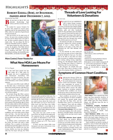 Robert Ezzell (Bob), of Bulverde,Threads of Love Looking For Volunteers & Donationshreads of Love was established in 1992 in Baton Rouge, Louisiana. Threads of Love has since grownacross the country through multiple satellite chapters. Threads of Love provides clothing, blankets, quilts and other handmade articles for tiny premature and sick infants. When a parent is faced with the death of an infant through miscarriage, infant death or stillbirth, they reach out to them with a gift showing God’s love through their sewing skills, silently saying “you are loved.”All materials and labor are donated by volunteers, making this mission possible. Threads of Love is always looking for volunteers of all ages, in fact, they just celebrated Ms. Pat’s 90th Birthday who volunteers.It’s very informal. So come comfy and even if you just stay an hour to help, they would be thrilled to have you. You don’t have to be able to sew, there are many steps necessary to complete every project, from sewing, cutting, ironing, organizing, packing, etc. The Bulverde chapter meets every Thursday from 9:30am to 1:30pm at 33300 Hwy. 281 N. in the Club House.Not everyone can donate time and that’s okay. Other ways to donate to help ensure this amazing ministry continues topassed away December 7, 2025.BSubmitted By Tami Wolffob was born on July 8, 1941, andy Julie Zookattended Brackenridge High School, and then served in the U.S.Navy.He worked for Lawson Products for30 years, then started his second career, delivering mail for the Spring Branch Post Office, where he made lots of great friends and was loved by all.Bob was known for his great sense of humor. He never met a stranger anywhere he went, and he always had a new joke to tell. He had a positive outlook on life, no matter what. He was always the first to point out a beautiful sunset or a rainbow.Bob leaves behind his wife of 60 years, Luanne, his daughters, Shari Bligh (James) and Tami Wolff (Charles); grandchildren, Lauryn, Jonathon, and Sofie. He is also survived by his siblings, John Ezzell (Rhonda), Melody Bellino, and Sandra Fuchs(Jeff ).More Control, Fewer HeadachesWhat New HOA Law Means For HomeownersBTIBy Lou Duggann late 2025 Texas passed new law that makes life a little easier for people who live in neighborhoodswith Homeowner Associations that comprise more than 60 homes. This new mandate is meant to give homeowners more information, more control, and fewer surprises.In the past, some HOAs made it difficult to find their rules. A homeowner might have had to email someone, wait days for a reply, or even pay for copies. Now, an HOA must put all its rules online where a person can see them anytime.This includes things like: What a person can and can’t do with their yard, parking rules, architectural rules, and bylaws and restrictions. As a result, homeowners shouldn’t be surprised by rules they didn’t know existed. They should be able to check the rules easily, anytime, without waiting on the HOA. This legislation also made it harder for an HOA to enforce rules that aren’t posted.Earlier law protected solar panel installation, but some HOAs tried to block solar roof tiles— the kind that look like regular shingles but make electricity. New law says HOAs can’t stop you from installing these tiles.In addition, when a homeowner sells the house, the buyer will need a resale certificate. This is a packet of information the HOA must give that explains: how much the HOA dues are, whether you owe any money, whether you have any violations, what fees the buyer will pay, the HOA’shelp families are:* Fabric (Fleece, Cotton and Flannel)* Yarn (3 Ply)* Crochetters* Maintenance/ Sewing Machine Cleaners* Cash donations (Tax deductible)All donations can be mailed or dropped off to: 1257 Frontier, Spring Branch, TX 78070.For any questions, please contact Jan Mobley at 210-325-4949 or JMOBLEY@ GVTC.COMSymptoms of Common Heart ConditionsCBy StaffDisease Control and Prevention. Globally, CVDs were responsible for around 19 million deaths in 2022. In the United States, heart disease affects around 128 million adults. Learning to recognize symptoms of potential heart conditions can ensure people know when to take action that may prevent further problems down the road.Heart conditions can present in many ways, and symptoms of various conditions can overlap. This general guide, based on data from the Mayo Clinic and the Cleveland Clinic, serves as a warning and not a diagnosis. Those with any sudden, severe or “not right” symptoms are urged to seek immediate medical attention.• Coronary artery disease: CAD can result in chest pain (angina), often with exertion. Shortness of breath, fatigue, and pain that may radiate to the arm, jaw, neck, or back are possible.• Myocardial infarction (heart attack): A heart attack can produce different symptoms in men and women, so it’s best to treat any out-of-the-ordinary signs with caution. Intense chest pressure or squeezing; pain spreading to arms, jaw, back, or stomach; shortness of breath; nausea; cold sweats, lightheadedness; fatigue; or back pain merit medical attention.financial health, and all the HOA’s rules. This requirement protects you and the buyer. It basically tells the buyer, “Here’s everything you need to know about this home and this HOA before you buy it.” And because HOAs must now post their rules online, the resale certificate is more likely to be accurate. Buyers can doublecheck the rules themselves, which makes selling your home smoother and less stressful.Plus, Texas now puts a limit on how much HOAs can charge for this paperwork. The maximum fee for a resale certificate (i.e. packet of information) is $375. If the certificate needs to be updated later, the HOA can charge up to $75. They cannot charge more.In short, new law makes HOAs more transparent and gives homeowners more control and fewer headaches.• Heart failure: Those experiencing heart failure may have persistent 