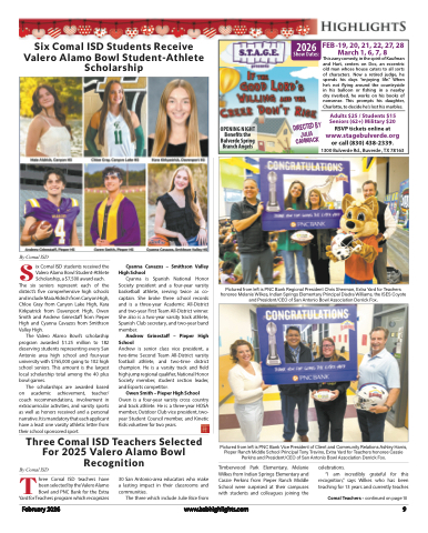 2026 Show Dates:FEB-19, 20, 21, 22, 27, 28OPENING NIGHT Benefits the Bulverde Spring Branch AngelsThis zany comedy, in the spirit of Kaufman and Hart, centers on Doc, an eccentric old man whose house caters to all sorts of characters. Now a retired judge, he spends his days “enjoying life.” When he’s not flying around the countryside in his balloon or fishing in a nearby dry riverbed, he works on his books of nonsense. This prompts his daughter, Charlotte, to decide he’s lost his marbles.Adults $25 / Students $15 Seniors (62+) Military $20RSVP tickets online atwww.stagebulverde.orgor call (830) 438-2339.1300 Bulverde Rd., Buverde , TX 78163March 1, 6, 7, 8Six Comal ISD Students Receive Valero Alamo Bowl Student-Athlete ScholarshipSBy Comal ISDix Comal ISD students received the Valero Alamo Bowl Student-Athlete Scholarship, a $7,500 award each.The six seniors represent each of the district’s five comprehensive high schools and include Maia Aldrich from Canyon High, Chloe Gray from Canyon Lake High, Kara Kirkpatrick from Davenport High, Owen Smith and Andrew Grinestaff from Pieper High and Cyanna Cavazos from Smithson Valley High.The Valero Alamo Bowl’s scholarship program awarded $1.25 million to 182 deserving students representing every San Antonio area high school and four-year university with $765,000 going to 102 high school seniors. This amount is the largest local scholarship total among the 40 plus bowl games.The scholarships are awarded based on academic achievement, teacher/ coach recommendations, involvement in extracurricular activities, and varsity sports as well as honors received and a personal narrative. It is mandatory that each applicant have a least one varsity athletic letter from their school sponsored sport.Cyanna Cavazos – Smithson Valley High SchoolCyanna is Spanish National Honor Society president and a four-year varsity basketball athlete, serving twice as co- captain. She broke three school records and is a three-year Academic All-District and two-year First Team All-District winner. She also is a two-year varsity track athlete, Spanish Club secretary, and two-year band member.Andrew Grinestaff – Pieper High SchoolAndrew is senior class vice president, a two-time Second Team All-District varsity football athlete, and two-time district champion. He is a varsity track and field high jump regional qualifier, National Honor Society member, student section leader, and Esports competitor.Owen Smith – Pieper High SchoolOwen is a four-year varsity cross country and track athlete. He is a three-year HOSA member, Outdoor Club vice president, two- year Student Council member, and Kinetic Kids volunteer for two years.Pictured from left is PNC Bank Regional President Chris Sherman, Extra Yard for Teachers honoree Melanie Wilkes, Indian Springs Elementary Principal Diadra Williams, the ISES Coyote and President/CEO of San Antonio Bowl Association Derrick Fox.Three Comal ISD Teachers Selected For 2025 Valero Alamo BowlTBy Comal ISD Recognitionhree Comal ISD teachers have 30 San Antonio-area educators who makebeen selected by the Valero Alamo a lasting impact in their classrooms andBowl and PNC Bank for the Extra communities.Yard for Teachers program which recognizes The three which include Julie Bice fromPictured from left is PNC Bank Vice President of Client and Community Relations Ashley Harris, Pieper Ranch Middle School Principal Tony Trevino, Extra Yard for Teachers honoree Cassie Perkins and President/CEO of San Antonio Bowl Association Derrick Fox.Timberwood Park Elementary, Melanie Wilkes from Indian Springs Elementary and Cassie Perkins from Pieper Ranch Middle School were surprised at their campuses with students and colleagues joining thecelebrations.“I am incredibly grateful for thisrecognition,” says Wilkes who has been teaching for 13 years and currently teachesComal Teachers - continued on page 10 9February 2026 www.bsbhighlights.com: