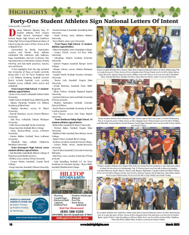 Forty-One Student Athletes Sign National Letters Of IntentDSubmitted By Comal ISDuring National Signing Day, 41 student athletes from Canyon High School, Davenport HighSchool, Pieper High School and Smithson Valley High School signed National Letters of Intent to play the sport of their choice at the collegiate level.Surrounded by family, teammates, coaches and friends, these athletes celebrated this milestone with balloons, hugs, handshakes and lots of photos. This day represents a culmination of years of early morning and late-night practices, lessons, wins and losses.A few highlights from the day included two University of Texas at Austin commits along with a U.S. Air Force Academy and a U.S. Military Academy football commit. Sports include baseball, cross country, football, soccer, softball, swim, tennis and volleyball.From Canyon High School, 11 student- athletes signed letters.• Quinn Cross, beach volleyball, Tarleton State University• Kaleb Gainer, football, Texas A&M-Kingsville • Tapiwa Hananda, football, U.S. Military Academy at West Point• Natalya Hendrus, soccer, St. Mary’s University• Aracely Martinez, soccer, Huston-Tillotson University• Sala Nuu, volleyball, Dakota Wesleyan University• Collin Pence, baseball, Trinity University• Diego Sanchez, football, Blinn College• Grace Slanina-Wertz, soccer, Schreiner University• Kindru Walker, football, Texas Lutheran University• Elizabeth Yaws, softball, Oklahoma Wesleyan UniversityFrom Davenport High School, seven student-athletes signed letters.• Josh Bendele, basketball, Albany College of Pharmacy and Health Sciences• Eli Bliss, cross country, Trinity University• Cooper Martin, baseball, Coastal Bend College• Diego Sanchez, baseball, Ottawa University• Daniel Soukup II, baseball, Grambling State University• Aniah Tinsley, track, Baldwin Wallace University• Taryn Welch, swim, Lynn UniversityFrom Pieper High School, 13 student- athletes signed letters.• Alaura Arringdale, swim, Randolph College • Cooper Deitch, soccer, Sul Ross State University• Johnathan Hebert, football, Schreiner University• Jackson Hopper, baseball, Ranger Junior College• Megan Johnes, soccer, Dakota Wesleyan University• Cayden Keeth, football, Houston Christian University• Tanner Leib, baseball, Angelo State University• Derek Martinez, baseball, Texas A&M- Kingsville• Ethan Palmer, football, Wayland Baptist University• Caroline Peterson, track and field, University of Texas at Austin• Braylon Saekoaleo, football, Colorado School of Mines• Austin Shreve, baseball, University of South Carolina-Sumter• Ava Trevino, soccer, East Texas Baptist UniversityFrom Smithson Valley High School, 10 student-athletes signed letters.• Blake Allen, baseball, St. Mary’s University• Preston Baker, football, Angelo State University• Matthew Felix, baseball, New Mexico Junior College• Ayden Fulton, football, Blinn College• Andrew Lunsford, baseball, Panola College • Joshua Miller, tennis, Hardin-Simmons University• Gavin Parker, baseball, Concordia University, Nebraska• Mia Perez, cross country, University of Texas at Austin• Cade Spradling, football, U.S. Air Force Academy at Colorado Springs • Bryce Wells, baseball, Weatherford CollegeEleven student athletes from Canyon High School signed National Letters of intent Wednesday, Feb. 5, to play the sport of their choice at the collegiate level. Pictured back row from left is Kaleb Gainer, Diego Sanchez, Tapiwa Hananda, Kindru Walker and Collin Pence; front row from left is Elizabeth Yaws, Aracely Martinez, Natalya Hendrus, Grace Slanina-Wertz, Quinn Cross and Sala Nuu.Seven student athletes from Davenport High School signed National Letters of intent Wednesday, Feb. 5, to play the sport of their choice at the collegiate level. Pictured back row from left is Eli Bliss, Josh Bendele, Cooper Martin, Daniel Soukup II and Diego Sanchez; front row from left is Taryn Welch and Aniah TinsleyThirteen student athletes from Pieper High School became the first students to sign National Letters of intent for the school on Wednesday, Feb. 5. Pictured back row from left is Alaura Arringdale, Caroline Peterson, Austin Shreve, Tanner Leib, Braylon Saekoaleo, Cayden Keeth and Ethan Palmer; front row from left is Megan Johnes, Ava Trevino, Jackson Hopper, Derek Martinez, Johnathan Hebert and Cooper Deitch.nchez; front row from left is Taryn Welch and Aniah TinsleyTen student athletes from Smithson Valley High School signed National Letters of intent Wednesday, Feb. 5, to play the sport of their choice at the collegiate level. Pictured back row from left is Preston Baker, Ayden Fulton, Cade Spradling and Bryce Wells; front row from left is Joshua Miller, Matthew Felix, Mia Perez, Blake Allen, Andrew Lunsford and Gavin Parker.Building Communication for LifeSPEECH & LANGUAGE CENTER AT STONE OAKSpeech Therapy Pediatric Feeding TeletherapyAccepting New Clientswww.stoneoakspeech.comHILLTOPKITCHEN & BATH• Flooring• Countertops• Kitchen & BathCabinets• Artificial Turf• Outdoor Hardscape Material• Pool Tile• Stack Stoneand more!Visit Our Showroom!(830) 388-525030310 FM306, Suite 204, Spring Branch, TX 78070Hilltopkitchenbath.com10www.bsbhighlights.comMarch 2025LLAOTCAY44299.510D.49