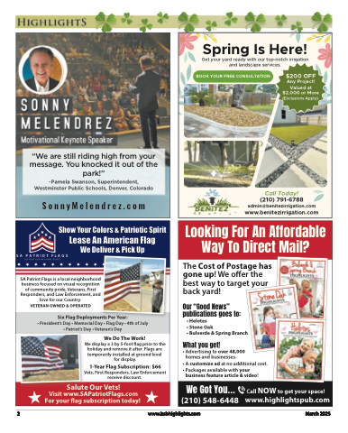 Spring Is Here!Get your yard ready with our top-notch irrigation and landscape services.BOOK YOUR FREE CONSULTATION$200 OFF Any Project!Valued at $2,000 or More (Exclusions Apply).Call Today!(210) 791-6788 admin@benitezirrigation.comwww.benitezirrigation.com“We are still riding high from yourmessage. You knocked it out of thepark!”~Pamela Swanson, Superintendent, Westminster Public Schools, Denver, ColoradoSonnyMelendrez.comLooking For An Affordable Way To Direct Mail?The Cost of Postage has gone up! We offer the best way to target your back yard!Our “Good News”publications goes to:• Helotes• Stone Oak• Bulverde & Spring BranchWhat you get!• Advertising to over 48,000 homes and businesses.• A customize ad at no additional cost.• Packages available with your business feature article & video!We Got You... Call NOW to get your space!(210) 548-6448www.highlightspub.comShow Your Colors & Patriotic SpiritLease An American Flag We Deliver & Pick UpSA Patriot Flags is a local neighborhood business focused on visual recognition of community pride, Veterans, First Responders, and Law Enforcement, and love for our Country. VETERAN OWNED & OPERATEDSix Flag Deployme• President’s Day • Memorial Day • Flag Day • 4th of July • Patriot’s Day • Veteran’s Daynts Per Year:We Do The Work!We display a 3 by 5-foot flag prior to the holiday and remove it after. Flags are temporarily installed at ground levelfor display.1-Year Flag Subscription: $66Vets, First Responders, Law Enforcement receive discount.Salute Our Vets!Visit www.SAPatriotFlags.com For your flag subscription today!2 www.bsbhighlights.com March 2025
