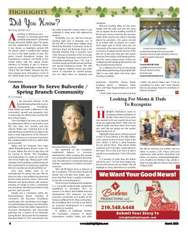 Did You Know?Instagram.Nine-pin bowling alleys are the samelength with the balls and pins the same size as regular ten-pin bowling. Instead of the ten pins set by a machine, the nine pins (eight white around one red) are manually placed by pinsetters. One game consists of six frames with six players on a team. Each player gets to throw twice but not necessarily in the same order or at the same set of pins. If a player knocks all nine of the first set of nine pins, they get nine points. However, if the red pin is left standing alone, then the score is twelve points. If there are multiple pins left standing after the first roll, then another bowler throws.For a different bit of fun for the family, call the Bulverde Bowling Club at (830) 438- 3065 to see what dates and times open bowling is available.businesses. Chick-fil-A, Panera Bread, Academy Sports + Outdoors, Chase Bank, and Texas Regional Bank, are recent examples.“I don’t think I have ever had a job thatBEurope during the Middle Ages. The game was first popularized in Germany, where it was known as kegelspiel, around 300 AD. Martin Luther is credited with settling on nine as the ideal number of pins. The game moved throughout Europe, the Scandinavian countries, and finally to the United States, with the earliest known reference to bowling at pins in America made by author Washington Irving about 1818 in “Rip Van Winkle”. Ninepins was the most popular form of bowling in much of the United States from colonial times untilCommentarythe early nineteenth century, when it was outlawed in many areas and replaced by tenpins.”Thankfully, you can still find nine-pin bowling right here in Bulverde, one of the few left in Central Texas. Hidden away behind the Bulverde Community Center at Ammann Road and Bulverde Road is the Bulverde Bowling Club, in business since 1956. They are a member of the Tri-County 9-Pin Bowling Association and boast of six beautifully-maintained lanes. The club is member-based and holds annual meetings and special fundraising events. The club hosts leagues, children’s classes and other events as requested by outside groups. You can follow them on Facebook andAy Connie McFall Clarkccording to Britannica.com, “ninepins is a bowling game that probably originated in continentalAn Honor To Serve Bulverde /Spring Branch CommunityBAy Lou Duggans the Executive Director of the Bulverde/Spring Branch Economic Development Foundation,Paula Stakes has made a difference in the community’s growth and prosperity. And, in many ways, her efforts have touched the lives of local citizens.“Our Foundation has been very blessed by collaborative efforts to work with Comal ISD, two cities, two councils, and two mayors,” Stakes says. “Learning how to do that effectively, on behalf of our citizens, has been a main requirement of the Director’s position. However, our successes have been the combined effort of all of us, rather than just one entity.”Stakes and her husband, John, have called Bulverde/Spring Branch home for 25 years. Within the next 30 days they will be moving to Florida. “The friendships and relationships I’ve made are what I will miss most,” Stakes says. “Being a part of the Chamber, the Foundation, and the history of this community for so many years made the Director’s position an emotional fit for me.”How does Stakes want to be remembered? “As caring,” she says. “We are about to enter a new political era governed by term limits and new visions. I know that Bulverde and Spring Branch will continue growing. It’s tough to leave a community you care about, and when your heart is a big part of it. I just care a lot.”Initially just a committee within the Bulverde/Spring Branch Chamber of Commerce, the Economic Foundation quickly grew into something much bigger. As a retired banker, a former council member and Mayor of Live Oak, Stakes’ experience in economic development and community planning was a perfect fit for Bulverde/ Spring Branch. She joined the Foundation’s Executive Board in 2013 and became theContact me at connieclark. conniecanwrite@gmail.com to provide historical events, people and places that our readers would be interestedin.Connie McFall Clarkspotlights historical and human interest stories from the area. www.conniecanwrite.comI didn’t care about,” Stakes says. “I look at everything I’ve done, and I have learned that we are always meant to contribute to the lives of others.”Looking For Moms & Dads To RecognizeHBy Staffighlights Publications wants to recognize mothers and fathers of all ages. How many of you have4www.bsbhighlights.comMarch 2025Executive Director in 2022.Her leadership of the Foundationemphasized balance in economic development, while ensuring that growth was sustainable and beneficial for the whole area. She believed in community input and strategic negotiations to achieve successful outcomes.Who will fill Stakes’ shoes as Director of the Foundation? “The Executive Board will decide who will take over,” Stakes says. “I know that their heart is equally committed to how this community grows.”The Economic Development Foundation is a non-profit public/private partnership established in November 2011. Its mission is to attract and facilitate business development that enhances our local economy, community, and quality of life. However, different from other communities, the Foundation does not rely on tax dollars for economic development. It is entirely funded by its members.In addition to healthcare facilities, the Foundation continues to attract restaurateurs, retailers, banks, and otherever wanted to let your parents know how much you appreciate them? Well, why not make it public and show them how much you care? We are giving you the perfect opportunity to do so.Highlights Publications is doing a special section to honor Moms in the May edition and a special section to honor Dads in the June edition. It will be a great keepsake for you a