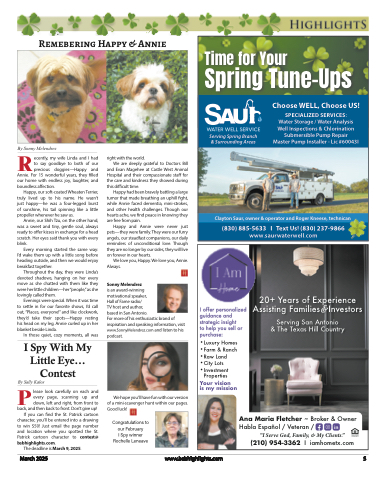 Remebering Happy & AnnieTime for YourSpring Tune-UpsServing Spring Branch & Surrounding AreasChoose WELL, Choose US!SPECIALIZED SERVICES:Water Storage / Water Analysis Well Inspections & Chlorination Submersible Pump Repair Master Pump Installer - Lic #60043IClayton Saur, owner & operator and Roger Kneese, technican(830) 885-5633 I Text Us! (830) 237-9866www.saurwaterwell.comBy Sonny MelendrezRecently, my wife Linda and I had to say goodbye to both of our precious doggies—Happy and Annie. For 15 wonderful years, they filled our home with endless joy, laughter, and boundless affection.Happy, our soft-coated Wheaten Terrier, truly lived up to his name. He wasn’t just happy—he was a four-legged burst of sunshine, his tail spinning like a little propeller whenever he saw us.Annie, our Shih Tzu, on the other hand, was a sweet and tiny, gentle soul, always ready to offer kisses in exchange for a head scratch. Her eyes said thank you with every blink.Every morning started the same way: I’d wake them up with a little song before heading outside, and then we would enjoy breakfast together.Throughout the day, they were Linda’s devoted shadows, hanging on her every move as she chatted with them like they were her little children—her“people,”as she lovingly called them.Evenings were special. When it was time to settle in for our favorite shows, I’d call out, “Places, everyone!” and like clockwork, they’d take their spots—Happy resting his head on my leg, Annie curled up in her blanket beside Linda.In those quiet, cozy moments, all wasI Spy With MyLittle Eye...ContestBy Sally KalosPlease look carefully on each and every page, scanning up and down, left and right, from front to back, and then back to front. Don’t give up!If you can find the St. Patrick cartoon character, you’ll be entered into a drawing to win $50! Just email the page number and location where you spotted the St. Patrick cartoon character to contest@ bsbhighlights.com.The deadline is March 9, 2025. March 2025right with the world.We are deeply grateful to Doctors Billand Evan Magehee at Castle West Animal Hospital and their compassionate staff for the care and kindness they showed during this difficult time.Happy had been bravely battling a large tumor that made breathing an uphill fight, while Annie faced dementia, mini-strokes, and other health challenges. Though our hearts ache, we find peace in knowing they are free from pain.Happy and Annie were never just pets—they were family. They were our furry angels, our steadfast companions, our daily reminders of unconditional love. Though they are no longer by our sides, they will live on forever in our hearts.We love you, Happy. We love you, Annie. Always.Sonny Melendrezis an award-winningmotivational speaker,Hall of Fame radio/TV host and author,based in San Antonio.For more of his enthusiastic brand of inspiration and speaking information, visit www.SonnyMelendrez.com and listen to his podcast.We hope you’ll have fun with our version of a mini-scavenger hunt within our pages. Good luck!I offer personalized guidance and strategic insightto help you sell or purchase:•Luxury Homes•Farm & Ranch•Raw Land•City Lots•Investment PropertiesYour visionis my mission20+ Years of Experience Assisting Families&InvestorsServing San Antonio & The Texas Hill CountryAna Maria Fletcher ~ Broker & Owner Habla Español / Veteran / in“I Serve God, Family, & My Clients.”(210) 954-3362 I iamhometx.comCongratulations to our FebruaryI Spy winner Rochelle Leneavewww.bsbhighlights.com 5