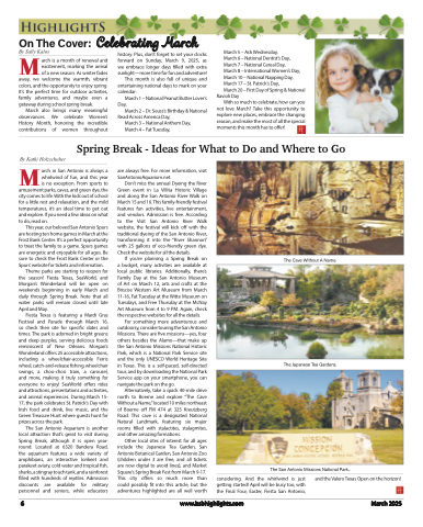 On The Cover: Celebrating Marcharch is a month of renewal and excitement, marking the arrival of a new season. As winter fadesaway, we welcome the warmth, vibrant colors, and the opportunity to enjoy spring. It’s the perfect time for outdoor activities, family adventures, and maybe even a getaway during school spring break.March also brings many meaningful observances. We celebrate Women’s History Month, honoring the incredible contributions of women throughouty Sally KalosBMhistory. Plus, don’t forget to set your clocks forward on Sunday, March 9, 2025, as we embrace longer days filled with extra sunlight—more time for fun and adventure!This month is also full of unique and entertaining national days to mark on your calendar:March 1 – National Peanut Butter Lover’s Day,March 2 – Dr. Seuss’s Birthday & National Read Across America Day,March 3 – National Anthem Day, March 4 – Fat Tuesday,March 5 – Ash Wednesday,March 6 – National Dentist’s Day,March 7 – National Cereal Day,March 8 – International Women’s Day, March 10 – National Napping Day, March 17 – St. Patrick’s Day,March 20 – First Day of Spring & NationalRavioli DayWith so much to celebrate, how can younot love March? Take this opportunity to explore new places, embrace the changing season, and make the most of all the special moments this month has to offer!By Kathi HolzschuherSpring Break - Ideas for What to Do and Where to GoMarch in San Antonio is always a whirlwind of fun, and this year is no exception. From sports to amusement parks, caves, and green dye, the city comes to life. With the kids out of school for a little rest and relaxation, and the mild temperatures, it’s an ideal time to get out and explore. If you need a few ideas on what to do, read on.This year, our beloved San Antonio Spurs are hosting ten home games in March at the Frost Bank Center. It’s a perfect opportunity to treat the family to a game. Spurs games are energetic and enjoyable for all ages. Be sure to check the Frost Bank Center or the Spurs’ website for tickets and information.Theme parks are starting to reopen for the season! Fiesta Texas, SeaWorld, and Morgan’s Wonderland will be open on weekends beginning in early March and daily through Spring Break. Note that all water parks will remain closed until late April and May.Fiesta Texas is featuring a Mardi Gras Festival and Parade through March 16, so check their site for specific dates and times. The park is adorned in bright greens and deep purples, serving delicious foods reminiscent of New Orleans. Morgan’s Wonderland offers 25 accessible attractions, including a wheelchair-accessible Ferris wheel, catch-and-release fishing, wheelchair swings, a choo-choo train, a carousel, and more, making it truly something for everyone to enjoy! SeaWorld offers rides and attractions, presentations and activities, and animal experiences. During March 15- 17, the park celebrates St. Patrick’s Day with Irish food and drink, live music, and the Green Treasure Hunt where guests hunt for prizes across the park.The San Antonio Aquarium is another local attraction that’s great to visit during Spring Break, although it is open year- round. Located at 6320 Bandera Road, the aquarium features a wide variety of amphibians, an interactive lorikeet and parakeet aviary, cold water and tropical fish, sharks, a stingray touch tank, and a rainforest filled with hundreds of reptiles. Admission discounts are available for military personnel and seniors, while educatorsare always free. For more information, visit SanAntonioAquarium.net.Don’t miss the annual Dyeing the River Green event in La Villita Historic Village and along the San Antonio River Walk on March 15 and 16. This family-friendly festival features fun activities, live entertainment, and vendors. Admission is free. According to the Visit San Antonio River Walk website, the festival will kick off with the traditional dyeing of the San Antonio River, transforming it into the “River Shannon” with 25 gallons of eco-friendly green dye. Check the website for all the details.If you’re planning a Spring Break on a budget, many activities are available at local public libraries. Additionally, there’s Family Day at the San Antonio Museum of Art on March 12, arts and crafts at the Briscoe Western Art Museum from March 11-16, Fat Tuesday at the Witte Museum on Tuesdays, and Free Thursday at the McNay Art Museum from 4 to 9 PM. Again, check the respective websites for all the details.For something more adventurous and outdoorsy, consider touring the San Antonio Missions. There are five missions—yes, four others besides the Alamo—that make up the San Antonio Missions National Historic Park, which is a National Park Service site and the only UNESCO World Heritage Site in Texas. This is a self-paced, self-directed tour, and by downloading the National Park Service app on your smartphone, you can navigate the park on the go.Alternatively, take a quick 40-mile drive north to Boerne and explore “The Cave Without a Name,” located 10 miles northeast of Boerne off FM 474 at 325 Kreutzberg Road. This cave is a designated National Natural Landmark, featuring six major rooms filled with stalactites, stalagmites, and other amazing formations.Other local sites of interest for all ages include the Japanese Tea Garden, San Antonio Botanical Garden, San Antonio Zoo (children under 3 are free, and all tickets are now digital to avoid lines), and Market Square’s Spring Break Fest from March 9-17. This city offers so much more than could possibly fit into this article, but the adventures highlighted are all well worthThe Cave Without A Name.The Japanese Tea Gardens.considering.getting started! April will be busy too, with the Final Four, Easter, Fiesta San Antonio,And theThe San Antonio Missions National Park..whirlwind is just and the Valero Texas Open on the horizon!6www.bsbhighlights.com March 2025