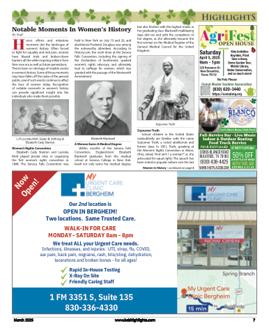 Notable Moments In Women’s Historybut also finishes with the highest marks in her graduating class. Blackwell’s trailblazing days did not end with the completion of her degree, as she ultimately became the first woman on the Medical Register of the General Medical Council for the United Kingdom.Sojourner TruthSojourner TruthSchool children in the United States undoubtedly are familiar with the name Sojourner Truth, a noted abolitionist and former slave. In 1851, Truth, speaking at the Women’s Rights Convention in Akron, Ohio, asked, “And ain’t I a woman?” as she advocated for equal rights. The speech has been noted in popular culture over the lastWomen In History - continued on page 8HBy Staffto fight for equality and inclusion, women have blazed trails and broken-down barriers, all the while inspiring millions from their own era as well as future generations. There’s been no shortage of notable events in women’s history. Some of those moments may have fallen off the radar of the general public, even if such events continue to affect the lives of women today. Recognition of notable moments in women’s history can provide significant insight into the individuals who made them possible.L-R Lucretia Mott, Susan B. Anthony & Elizabeth Cady Stanton.Women’s Rights ConventionElizabeth Cady Stanton and Lucretia Mott played pivotal roles in organizing the first women’s rights convention in 1848. The Seneca Falls Convention waseroic efforts and milestone moments dot the landscape of women’s history. Often forcedheld in New York on July 19 and 20, and abolitionist Frederick Douglass was among the noteworthy attendees. According to History.com, the work done at the Seneca Falls Convention, including the signing of the Declaration of Sentiments, sparked women’s rights advocacy and ultimately lead to suffrage for women, which was granted with the passage of the Nineteenth Amendment.Elizabeth BlackwellA Woman Earns A Medical DegreeWithin months of the Seneca Falls Convention, England-born Elizabeth Blackwell graduates from the medical school at Geneva College in New York. kwell not only earns her medical degree,AgriFest OPEN HOUSESaturday April 5, 2025 9am - 1pm325 Resource Dr. New Braunfels,Kids Activities Hayrides, Plant Give-a Away, Demo Garden Tour, Mobile Library, Water Conservation, and so much more!Texas 78132No Pets PleaseComal Master Gardner Association(830) 620-3440 https://comalmg.org33855 Blanco Road Bulverde, TX 78163(830) 438-4425Let’s Have Some Irish Fun!Full-Service Bar • Live Music Indoor & Outdoor Seating Food Truck ServicePet & Kid FriendlySt Patty’s Special!50% offA BOTTLE OF WINEwith this AD!www.thatplaceob.comEXPIRES 3-31-25Our 2nd location is OPEN IN BERGHEIM!Two locations. Same Trusted Care.WALK-IN FOR CARE MONDAY - SATURDAY 8am - 8pmWe treat ALL your Urgent Care needs.Infections, illnesses, and injuries: UTI, strep, flu, COVID, ear pain, back pain, migraine, rash, bite/sting, dehydration, lacerations and broken bones - for all ages!Rapid In-House Testing X-Ray On SiteFriendly Caring Staff1 FM 3351 S, Suite 135 830-336-4330March 2025www.bsbhighlights.com 7Now Open!