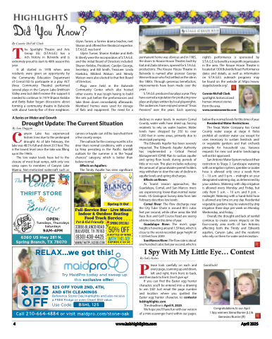 Did You Know?Glynn Turner, a former drama teacher, met Sharon and offered her theatrical expertise. S.T.A.G.E. was born!Glynn Turner, Sharon Knibbe and Beth B. Sherfy were the incorporators of S.T.A.G.E. and the initial Board of Directors included: Sharon Knibbe, President; Carolyn George, Secretary; and Bill Smith, Treasurer. Linda Haekstra, Mildred Watson and Wendy Watson were also elected to that first Board of Directors.Plays were held in the Bulverde Community Center which also hosted other events. It was tough having to build the sets just before the performances and take them down immediately afterwards. Members’ homes were used for storage of flats and equipment. The need for aBTy Connie McFall Clarkhe Spotlight Theatre and Arts Group Etc. (S.T.A.G.E.) has a rich history in Bulverde and isextremely proud to start its 46th season this year.It all started in 1978 when area residents were given an opportunity by the Community Education Department of Comal ISD to participate in a play. ACT (Area Community Theatre) performed several plays in the Canyon Lake-Smithson Valley area but didn’t receive the support it needed to continue. In 1979 Sharon Knibbe and Betty Baker began discussions about forming a community theatre in Bulverde with about twenty-five of their neighbors.A Series on Water and Growthpermanent home was obvious and in 1985, the doors to Krause House Theatre, built by Earl and Zada Jahnsen, opened for S.T.A.G.E. productions. The Krause House Theatre in Bulverde is named after pioneer George Werner Krause who first settled on the site in the 1800s. Through generous benefactors, improvements have been made over the years.S.T.A.G.E. produces four plays a year. They have earned a reputation for producing new plays and plays written by local playwrights. The audiences have enjoyed several “Texas Premiers” over the years. Each openingdeclines in water levels. In western Comal County, water wells have dried up, forcing residents to rely on water haulers. Water levels have dropped by 350 to over 1,000 feet in some areas, primarily due to municipal pumping.The Edwards Aquifer has been severely impacted. The Edwards Aquifer Authority has implemented a Critical Period Management (CPM) Plan to sustain aquifer and spring flow levels during periods of little or no rain. This plan includes reducing the amount of groundwater permit holders may withdraw to slow the rate of decline in aquifer levels and spring discharges.Effects on Rivers:As Tourist season approaches, the Guadalupe, Comal, and San Marcos rivers are experiencing lower-than-normal water levels. US Geological Survey data from late February describes low levels:Comal River: The flow discharge near the City Tube Chute is around 83.5 cubic feet per second, while other areas like Mill Race Run and Golf Course Road are seeing all-time lows for this time of year.Guadalupe River: The river’s gage height is hovering around 1.59 feet, which is close to the worst-recorded gage height of 1.53 feet from 2009.San Marcos River: The flow rate is about one hundred cubic feet per second, which isnight’s performance is sponsored by S.T.A.G.E. to benefit a nonprofit organization in the area. The Krause House Theatre is located at 1300 Bulverde Road. Performance dates and details, as well as information on S.T.A.G.E.’s outreach programs may be found on the website at https://www. stagebulverde.org/.Connie McFall Clarkspotlights historical and human interest stories from the area. www.conniecanwrite.combelow the normal levels for this time of year. Residential Water Restrictions:The Texas Water Company has ComalCounty water usage at stage 4: Rules prohibit all outdoor water use except for uses necessary to sustain livestock and/ or vegetable gardens and fruit orchards primarily for household use. Variance requests for new sod and/or landscaping will not be approved.San Antonio Water System reduced their restriction to Stage 3. Landscape watering with an irrigation system, sprinkler or soaker hose is allowed only once a week from 5 – 10 a.m. and 9 p.m. – midnight on your designated watering day, as determined by your address. Watering with drip irrigation is allowed every Monday and Friday, but onlyfrom5a.m.–10a.m.and9p.m.– midnight. Watering with a hand-held hose is allowed any time on any day. Residential vegetable gardens may be watered by drip irrigation three days per week on Monday, Wednesday, and Friday.Overall, the drought and lack of rainfall continue to create severe impacts on the four-county area north of San Antonio, affecting both the Trinity and Edwards aquifers, Canyon Lake, and the residents who rely on them for water and recreation.Drought Update: The Current SituationCBy Lou Duggananyon Lake has experiencedhistoric lows due to the prolongeddrought. As of late February, the lake was 48.5% full and down 29.5 feet. This is the lowest level since the lake was filling up in the 1960s.The low water levels have led to the closure of most boat ramps, with only one ramp open to members of Canyon Lake Marina. Non-motorized watercraft such ascanoes or kayaks can still be launched from a few county ramps.The outlook for the coming months is for drier than normal conditions, with a weak La Nina persisting in the Pacific. Rainfall outlook for the summer is in the “equal chances” category, which is better than below normal.Effects on Aquifers:The Trinity Aquifer has seen significantTHRIFT STOREOPEN:Tuesdays, Thursdays Saturdays9AM-4PM6260 US Hwy 281 N. Spring Branch, TX 78070Full-Service Bar • Live Music Indoor & Outdoor Seating Food Truck ServicePet & Kid FriendlySpring It On!33855 Blanco Road Bulverde, TX 78163(830) 438-4425Spring Special!50% offA BOTTLE OF WINEwith this AD!www.thatplaceob.comEXPIRES 4-30-25ays days days4PMRELAX...we got this!Try MaidPro today and sweep up this exclusive offer:$125 $25 OFF YOUR 2ND, 4TH,AND 6TH CLEANINGSReference Stone Oak Highlights and also receive a FREE Fridge or oven Clean! 