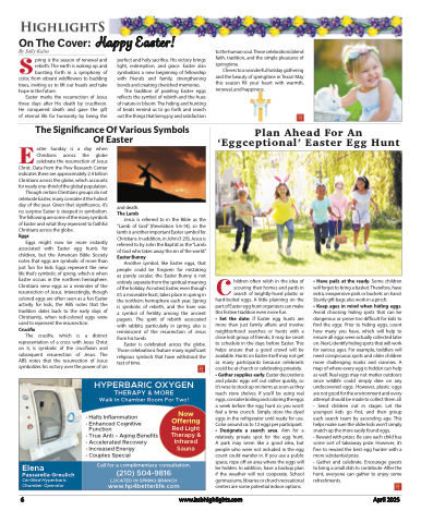 On The Cover: Happy Easter! y Sally KalosBSto the human soul. These celebrations blend faith, tradition, and the simple pleasures of springtime.Cheers to a wonderful holiday gathering and the beauty of springtime in Texas! May this season fill your heart with warmth, renewal, and happiness.Plan Ahead For An ‘Eggceptional’ Easter Egg Huntpring is the season of renewal and rebirth. The earth is waking up and bursting forth in a symphony ofcolor, from vibrant wildflowers to budding trees, inviting us to lift our heads and take hope in the future.Easter marks the resurrection of Jesus three days after His death by crucifixion. He conquered death and gave the gift of eternal life for humanity by being theperfect and holy sacrifice. His victory brings light, redemption, and grace. Easter also symbolizes a new beginning of fellowship with friends and family, strengthening bonds and creating cherished memories.The tradition of painting Easter eggs reflects the symbol of rebirth and the hues of nature in bloom. The hiding and hunting of treats remind us to go forth and search out the things that bring joy and satisfactionThe Significance Of Various Symbols Of EasterE aster Sunday is a day when Christians across the globe celebrate the resurrection of Jesus Christ. Data from the Pew Research Center indicates there are approximately 2.4 billion Christians across the globe, which accounts for nearly one-third of the global population. Though certain Christians groups do not celebrate Easter, many consider it the holiest day of the year. Given that significance, it’s no surprise Easter is steeped in symbolism. The following are some of the many symbols of Easter and what they represent to faithfulChristians across the globe.EggsEggs might now be more instantly associated with Easter egg hunts for children, but the American Bible Society notes that eggs are symbolic of more than just fun for kids. Eggs represent the new life that’s symbolic of spring, which is when Easter occurs in the northern hemisphere. Christians view eggs as a reminder of the resurrection of Jesus. Interestingly, though colored eggs are often seen as a fun Easter activity for kids, the ABS notes that the tradition dates back to the early days of Christianity, when red-colored eggs were used to represent the resurrection.CrucifixThe crucifix, which is a distinct representation of a cross with Jesus Christ on it, is symbolic of the crucifixion and subsequent resurrection of Jesus. The ABS notes that the resurrection of Jesus symbolizes his victory over the power of sinand death.The LambJesus is referred to in the Bible as the “Lamb of God” (Revelation 5:6-14), so the lamb is another important Easter symbol for Christians. In addition, in John (1:29), Jesus is referred to by John the Baptist as the “Lamb of God who takes away the sin of the world.” Easter BunnyAnother symbol, like Easter eggs, that people could be forgiven for mistaking as purely secular, the Easter Bunny is not entirely separate from the spiritual meaning of the holiday. As noted, Easter, even though it’s a moveable feast, takes place in spring in the northern hemisphere each year. Spring is symbolic of rebirth, and the hare was a symbol of fertility among the ancient pagans. The spirit of rebirth associated with rabbits, particularly in spring, also is reminiscent of the resurrection of Jesus from his tomb.Easter is celebrated across the globe. Those celebrations feature many significant religious symbols that have withstood the test of time.Children often relish in the idea of scouring their homes and yards in search of brightly-hued plastic or• Have pails at the ready. Some children will forget to bring a basket. Therefore, have extra, inexpensive pails or buckets on hand. Sturdy gift bags also work in a pinch.• Keep ages in mind when hiding eggs.Avoid choosing hiding spots that can be dangerous or prove too difficult for kids to find the eggs. Prior to hiding eggs, count how many you have, which will help to ensure all eggs were actually collected later on. Next, identify hiding spots that will work for various ages. For example, toddlers will need conspicuous spots and older children more challenging nooks and crannies. A map of where every egg is hidden can help as well. Real eggs may not matter outdoors since wildlife could simply dine on any undiscovered eggs. However, plastic eggs are not good for the environment and every attempt should be made to collect them all. • Send children out in stages. Let the youngest kids go first, and then group each search team by ascending age. This helps make sure the older kids won’t simply snatch up the more easily found eggs.• Reward with prizes. Be sure each child has some sort of takeaway prize. However, it’s fine to reward the best egg hunter with a more substantial prize.• Gather and celebrate. Encourage guests to bring a small dish to contribute. After the hunt, everyone can gather to enjoy some refreshments.hard-boiled eggs. A little planning on the part of Easter egg hunt organizers can make this festive tradition even more fun.• Set the date: If Easter egg hunts are more than just family affairs and involve neighborhood searches or hunts with a close knit group of friends, it may be smart to schedule in the days before Easter. This helps ensure that a good crowd will be available. Hunts on Easter itself may not get as many participants because celebrants could be at church or celebrating privately. • Gather supplies early. Easter decorations and plastic eggs sell out rather quickly, so it’s wise to stock up on items as soon as they reach store shelves. If you’ll be using real eggs, consider boiling and coloring the eggs a week before the egg hunt so you won’t feel a time crunch. Simply store the dyed eggs in the refrigerator until ready for use. Color around six to 12 eggs per participant. • Designate a search area. Aim for a relatively private spot for the egg hunt. A