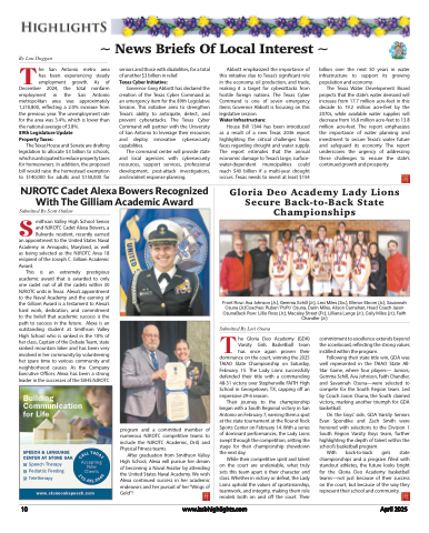 By Lou Duggan~ News Briefs Of Local Interest ~T he San Antonio metro area has been experiencing steady employment growth. As of December 2024, the total nonfarm employment in the San Antonio metropolitan area was approximately 1,210,800, reflecting a 2.0% increase from the previous year. The unemployment rate for the area was 3.4%, which is lower thanthe national average of 3.8%.89th Legislature Update Property Taxes:The Texas House and Senate are drafting legislation to allocate $3 billion to schools, which is anticipated to reduce property taxes for homeowners. In addition, the proposed bill would raise the homestead exemption to $140,000 for adults and $150,000 forseniors and those with disabilities, for a total of another $3 billion in relief.Texas Cyber Initiative:Governor Greg Abbott has declared the creation of the Texas Cyber Command as an emergency item for the 89th Legislative Session. This initiative aims to strengthen Texas’s ability to anticipate, detect, and prevent cyberattacks. The Texas Cyber Command will partner with the University of San Antonio to leverage their resources and deploy innovative cybersecurity capabilities.The command center will provide state and local agencies with cybersecurity resources, support services, professional development, post-attack investigations, and incident response planning.Abbott emphasized the importance of this initiative due to Texas’s significant role in the economy, oil production, and trade, making it a target for cyberattacks from hostile foreign nations. The Texas Cyber Command is one of seven emergency items Governor Abbott is focusing on this legislative session.Water Infrastructure:House Bill 1344 has been introduced as a result of a new Texas 2036 report highlighting the critical challenges Texas faces regarding drought and water supply. The report estimates that the annual economic damage to Texas’s large, surface- water-dependent municipalities could reach $40 billion if a multi-year drought occurs. Texas needs to invest at least $154billion over the next 50 years in water infrastructure to support its growing population and economy.The Texas Water Development Board projects that the state’s water demand will increase from 17.7 million acre-feet in this decade to 19.2 million acre-feet by the 2070s, while available water supplies will decrease from 16.8 million acre-feet to 13.8 million acre-feet. The report emphasizes the importance of water planning and investment to secure Texas’s water future and safeguard its economy. The report underscores the urgency of addressing these challenges to ensure the state’s continued growth and prosperity.NJROTC Cadet Alexa Bowers Recognized With The Gilliam Academic AwardSubmitted By Scott Outlawmithson Valley High School Senior and NJROTC Cadet Alexa Bowers, a Bulverde resident, recently earnedan appointment to the United States Naval Academy in Annapolis, Maryland, as well as being selected as the NJROTC Area 18 recipient of the Joseph C. Gilliam Academic Award.This is an extremely prestigious academic award that is awarded to only one cadet out of all the cadets within 30 NJROTCunitsinTexas. Alexa’sappointment to the Naval Academy and the earning of the Gilliam Award is a testament to Alexa’s hard work, dedication, and commitment to the belief that academic success is the path to success in the future. Alexa is an outstanding student at Smithson Valley High School who is ranked in the 10% of her class, Captain of the Debate Team, state ranked mountain biker and has been very involved in her community by volunteering her spare time to various community and neighborhood causes. As the Company Executive Officer, Alexa has been a strong leader in the successes of the SVHS NJROTCGloria Deo Academy Lady Lions Secure Back-to-Back State ChampionshipsFront Row: Ava Johnson (Jr.), Gemma Schill (Jr.), Lexi Miles (So.), Ellenor Ebrom (Jr.), Savannah Osuna (Jr.)Coaches: Ruben ‘PoPo’ Osuna, Darin Miles, Alison Carnahan, Head Coach Jason OsunaBack Row: Lillie Ross (Jr.), Macaley Street (Fr.), Lilliana Lange (Jr.), Caily Miles (Jr.), Faith Chandler (Jr.)commitment to excellence extends beyond the scoreboard, reflecting the strong values instilled within the program.Following their state title win, GDA was well represented in the TAIAO State All- Star Game, where four players— Juniors; Gemma Schill, Ava Johnson, Faith Chandler, and Savannah Osuna—were selected to compete for the South Region team. Led by Coach Jason Osuna, the South claimed victory, marking another triumph for GDA basketball.On the boys’ side, GDA Varsity Seniors Evan Spondike and Zach Smith were honored with selections to the Division 1 South Region Varsity Boys team, further highlighting the depth of talent within the school’s basketball program.With back-to-back girls state championships and a program filled with standout athletes, the future looks bright for the Gloria Deo Academy basketball teams—not just because of their success on the court, but because of the way they represent their school and community.ubmitted By Lori OsunaSTBuilding Communication for LifeSPEECH & LANGUAGE CENTER AT STONE OAKSpeech Therapy Pediatric Feeding TeletherapyAccepting New Clientswww.stoneoakspeech.comprogram and a committed member of numerous NJROTC competitive teams to include the NJROTC Academic, Drill, and Physical Fitness teams.After graduation from Smithson Valley High School, Alexa will pursue her dream of becoming a Naval Aviator by attending the United States Naval Academy. We wish Alexa continued success in her academic endeavors and her pursuit of her “Wings of Gold”!he Gloria Deo Academy (GDA) Varsity Girls Basketball team has once again proven theirdominance on the court, winning the 2025 TAIAO State Championship on Saturday, February 15. The Lady Lions successfully defended their title with a commanding 48-31 victory over Stephenville FAITH High School in Georgetown, TX, capping off an impressive 2