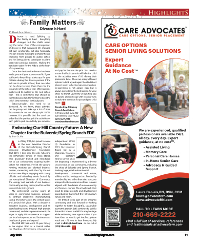 vFamily MattersvDivorce Is HardDBy Brooke Irey, Attorneyivorce is hard. Splitting up the family is hard. Everything changes, but the child’s needsstay the same. One of the consequences of divorce is that everyone’s life changes, not just emotionally, but also financially. This can include moving to a smaller house, changing from private to public school and not being able to participate in all the past extra-curricular activities. Making the transition easier for the kids is at the heart of co-parenting.Once the decision for divorce has been made, you and your spouse need to figure out how to keep things status quo for your children during the divorce process. If the kids are in private school, then see what can be done to keep them there for the remainder of the school year. Other options might need to explore for the next school year. This is something that should be calmly discussed and remember to keep the child’s best interest as the focal point.Extra-curriculars also need to be discussed. As we know, these activities can be pricey and take up a lot of time. Extra-curricular are not always split 50/50. However, it is possible that the court can order that the parties split the activities or each gets to pick one activity per semesterCARE OPTIONSSENIOR LIVING SOLUTIONSExpert Guidance At No CostTMTMWe are experienced, qualified professionals available 24/7, all day, every day. Expert guidance, at no costTM.• Assisted Living• Memory Care• Personal Care Homes• In-Home Senior Care• Advocacy & Guided SupportTMLaura Daniels,RN, BSN, CCM laura@advocatern.com www.advocateRN.comCALL TO LEARN MORE210-669-2222Find a full list of services, references and testimonials at advocatern.comand pay for the one the pick. You need to ensure that both parents will take the child to the activities even if it’s during their possession time. There are many different options to look at, and again the child’s best interest needs to be the main consideration. Co-parenting is not always easy but is always going to be the best option for your child. At Branch Law Firm, we can help you co-parent and come up with creative ways to make the transition for you and your child easier.Brooke Irey, Attorney Branch Family Law549 Heimer Rd., Suite 200 San Antonio, Texas 78232 (210) 229-2088 www.branchfamilylaw.comEmbracing Our Hill Country Future: A New Chapter for the Bulverde/Spring Branch EDFBAy Scott D. Hitts of May 11th, I’m proud to serve as the new Executive Director of the Bulverde/Spring BranchEconomic Development Foundation (BSB EDF). I step into this role following the remarkable tenure of Paula Stakes, who graciously trained and introduced me to our communities’ inspiring leaders before her retirement. I’ve hit the ground running, meeting our talented business owners, connecting with the City Council and our new Mayor, engaging with county officials, and attending events hosted by our exceptional Chamber of Commerce. The energy and warmth of our business community are truly special, and I’m excited to contribute to its growth.My professional journey spans 25 years in commercial business, primarily in contract electronics manufacturing, taking my family across the United States and around the globe. With a decade in executive business development and 15 years leading teams through high-growth, turnaround, and start-up environments, I’m eager to apply this experience to support our local entrepreneurs and businesses as they launch, grow, and expand.The BSB EDF has a rich 13-year history in our region. Born as a council within the Chamber of Commerce, it became anJuly 2025www.bsbhighlights.com 11independent 501(c)(3) foundation in2013. Our volunteerBoard, led by aChairman, Treasurer,and Secretarywho’ve served sincethe beginning, is represented by a diverse cross-section of our community, including the cities of Bulverde and Spring Branch, banking, legal, retail and residential development, commercial real estate, utilities, and technology sectors. Funded by membership fees rather than sales taxes, our unique structure ensures our focus remains aligned with the desires of our community and business owners. We actively seek their input to shape projects and development opportunities that reflect the Hill Country’s values and vision.I’m thrilled to be part of this dynamic community and look forward to working together to foster thoughtful, sustainable economic growth. Let’s continue to build a future that honors our Hill Country heritage while embracing new opportunities. If you have ideas or want to get involved, please reach out - I’d love to hear from you. My email is dhitt@bsbedf.com or my cell at (210) 986-4626.