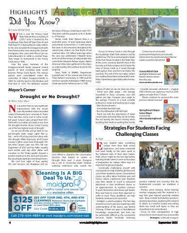 Did You Know?BWy Connie McFall Clarkhat is now the Honey Creek State Natural Area consisting of 2,293.7 acres is located by theGuadalupe State Park off State Hwy 46 and Park Road 31 in Spring Branch. Early settlers to the area included the Doeppenschmidts from Bavaria who were among the German immigrants who came with Prince Carl von Solms-Braunfels to settle in Central Texas. They began to homestead in the Honey Creek area in 1866.Over the years, members of the Doeppenschmidt family acquired several parcels of land, including what would become Honey Creek Ranch. The various parcels were consolidated under the ownership of Adam Doeppenschmidt in 1894. He sold the land to Otto Weidner and Fred Rust in 1910. The Weidners workedMayor’s Cornerthe tracts of Honey Creek Ranch until 1971. They then sold the property to W. O. Bartle, Jr., of Houston.Honey Creek State Natural Area is a protected piece of land harboring plants and animals nurtured by a 1.5-mile spring- fed creek. In the limestone throughout the natural area, visitors can find fossils of sea creatures alive 125 million years ago when the area was underwater. Chipped stone tools are all that remain of early people who roamed the Edwards Plateau region. Native American tribes later gathered in this place, as evidenced by other artifacts found on the property.Texas Parks & Wildlife Department acquired part of the natural area from the Texas Nature Conservancy in 1985 and the rest from a private individual in 1988. Honey Creek opened for limited access in 1985.Access to Honey Creek is only through the Guadalupe State Park entrance and by guided tour. The tours and programs begin at the Rust House located in the State Park. At the scenic overlook, Spanish moss in the live oaks and Ashe junipers don’t hinder the view of Honey Creek as it winds through bald cypress trees and ferns far below the overlook. The end of the tour takes visitors on a walk by the pristine and peaceful creek. https://tpwd.texas.gov/state-parks/honey- creeksurface of what we can do. Here are a few. • Know your daily usage – the average household in Texas consumes over 200 gallons per day. Compare your usage to the average. If you’re on a well, consider putting in a meter and tracking your usage • Take shorter showers –• Consolidate laundry loads• Run the dishwasher with full loads• Teach our kids the importance of water conservation and what they can do to help, like not leaving the faucet running when brushing their teeth or washing their handsContact me at connieclark. conniecanwrite@gmail.com to provide historical events, people and places that our readers would be interested in.Connie McFall Clarkspotlights historical and human interest stories from the area. www.conniecanwrite.com• Consider rainwater catchment – a typical 2000 sf home can capture as much as 2500 gallons of water from 1” of rain.Please, continue to conserve this most precious natural resource!Spring Branch Mayor James MayerContact Info info@cityofspringbranch. orgDrought or No Drought?By Mayor James MayerNo question that we saw significant improvement with the recent rains. My weather station recorded nearly10”betweenJune1andJuly31.That’s more rain than we’ve seen in some recent full years! Canyon Lake jumped from 45% full to 69% in a matter of a week or two. And the drought monitor shows Comal County out of the two highest levels of drought.So, we can all relax and go back to our pre-drought water usage, right? Not so fast...we’re still a long way from done with this drought. While improved, all of Comal County is still in some level of drought. The last time Canyon Lake was 69% full was September of 2023 and has fallen steadily each month until July 2025. Water well monitors on the Trinity aquifer showed a positive response to the June and July rains but are already starting to trend back down.We can’t lose sight of how quickly this vital resource can disappear, and weStrategies For Students Facing Challenging Classescan’t afford to abandon the conservation practices that helped to sustain us through these past 3 years. Everyone has a role in conserving water. Outdoor watering restrictions only scratch they Staff BElook back fondly on the years spent in the hallowed halls of their alma maters. High school might be the last step before learning a trade career or serve as four years of preparation for college. Either way, it is important to get good grades.Continually challenging oneself with coursework can help students get the most out of their academic careers. General level classes are often taken freshman year and honors classes sophomore year. Students may then decide to enroll in advanced placement or dual enrollment classes as an upperclassman. As students continue to push themselves and classes get harder, they may have to revise their approach in order to excel. These guidelines can help students continue to be successful.• Establish a solid foundation. The first step towards success in any class is gaining a solid understanding of the basics, says Stemly Tutoring. If there are gaps in foundational knowledge, assignments and tests can be particularly difficult as the coursework becomes harder. Routinely reviewingvery student takes something unique from their high school experience, and many eventually$125 OFFCleaning Is A BIG Deal To Us.TMTry MaidPro today and sweep up this$25 OFF YOUR 2ND, 4TH, AND 6THCLEANINGS Reference Stone Oak Highlights and also receive a FREE Fridgeor oven Clean! $50 value.Use Code: BSBHL125Kim Folden -OwnerCall 210-664-4884 or visit maidpro.com/stone-oakprevious material and ensuring that the fundamental concepts are mastered is essential.• Practice active learning. Active learning involves engaging with the material in a way that goes beyond passively reading texts. Ideas include formulating questions, quizzing classmates, explaining the material to others as a teacher would, and writing down key words and topics so t