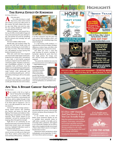 The Ripple Effect Of KindnessABy Sonny Melendrezs the story goes..On a rainy morning in a smallTHRIFT STOREOPEN:Tuesday thru Saturday10AM-4PM6260 US Hwy 281 N. Spring Branch, TX 78070Most Insurances Accepted18830 46 Pkwy., Bldg. 1, Suite B Spring Branch, TX 78070(830) 327-7327www.renewfamilytx.comDr. Kimberly RamcharanSeptember Comal Fair SpecialsSee Me At The Comal Fair & Enter For A Free African Safari*Bring in any project for 10% off our regular prices!* AIRFARE, ANIMALS AND TAXIDERMY NOT INCLUDED. ALL DAY FEES PAID FOR UP TO 7 HUNTERS.www.bucketlistoutfitters.comOpen 6 Days A Week REFLECTION TAXIDERMY • (210)722-8936 24/7 Drop Off Cooler 14370 US Hwy 281 N. • Spring Branch, Tx 78070Texas town, a diner owner namedJack noticed a young man sitting alone atthe counter. The man’s clothes were worn,his eyes tired. When Jack took his order,the man quietly admitted he didn’t have ys enoughmoneyforafullmeal.MWithout hesitation, Jack poured him a hot cup of coffee, served a plate of eggs and toast, and waved away the man’s attempt to pay. “Just promise me you’ll do something kind for someone else someday,” Jack said with a smile.The man nodded, visibly moved.Months later, Jack received a letter. The young man had found steady work and had been volunteering at a local shelter. In the letter, he wrote, “That meal reminded me I still mattered. I’ve been passing that kindness forward ever since.”What Jack could never have imagined was how far that single ripple would reach. Inspired by the young man’s commitment to give back, a local teacher proposed turning an empty lot near the shelter into a community garden. Residents, businesses, and schoolchildren pitched in to plant vegetables, herbs, and flowers. Soon, the garden was not only feeding people but also creating a peaceful place where neighbors could connect, work side-by-side, and watch something beautiful grow—all from the kindness that began with one free plate of eggs.Kindness often begins quietly, almost unnoticed. A door held open, a seat offered, a smile given freely. But once set in motion,ys ysit can flow outward in ways the giver may never witness. Each act plants a seed—one that may grow into something larger than anyone imagined.In a fast-moving world, kindness is a reminder that connection matters. It bridges differences, restores hope, and often costs nothing more than a moment of our time.Jack didn’t just serve a meal that rainy morning; he served a reminder of humanity’s capacity for good. And, from that single gesture, the hungry were fed—and the weary were reminded they mattered.“You cannot do a kindness too soon, for you never know how soon it will be too late.” — Ralph Waldo EmersonSonny Melendrezis an award-winningmotivational speaker,Hall of Fame radio/TV host and author,based in San Antonio.For more of his enthusiastic brand of inspiration and speaking information, visit www.SonnyMelendrez.com and listen to his podcast.Tuesda Thursda Saturda 9AM-4PAre You A Breast Cancer Survivor?FBy Sally Kalosew words in life hit as hard as “cancer.” Facing that word, fighting it, surviving it—it’s a battle unlikeany other. The journey is monumental, and only those who’ve walked through it truly understand its relentless toll. It’s a “you had to be there” kind of experience—one no one is ever fully prepared for and no one ever deserves.Yet from that battle emerge warriors— strong, tested survivors who transform into mentors and heroes for those still fighting. Their bravery and resilience shine, offering hope and guidance in the darkest moments. These women deserve to be celebrated—not just for surviving, but for inspiring others through their strength.Right here in our community, we are proud to have many such women who have stared down breast cancer and emerged victorious. Highlights Publications wants to honor these local warriors!If you or someone you know is a breast cancer survivor, we invite you to share your story. Please submit a photo along with a short summary of the journey—whether it’sabout the fight, the survival, or the strength it took to rise above. We are looking for 150- 200 words.In our October issue, in honor of Breast Cancer Awareness Month, we aim to spotlight these powerful stories to uplift others currently in the fight, and to encourage action, awareness, and support in our community. Together, we can shine a light on this struggle and help move toward a future where breast cancer is no longer a threat to those we love.Submit your stories and photos to info@ bsbhighlights.com by September 10, 2025. Let’s honor these warriors among us.September 2025www.bsbhighlights.com 5New Patient Special $35 Chiropractic Exam Posture Scan • X- RaysNeurological Scan exp. 09/30/25