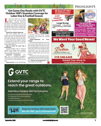 Get Game-Day Ready with GVTC Outdoor WiFi: Seamless Coverage forL LaborDay&FootballSeason30 Days Of FREE Group Classes!Large Group• Total Flexability • Senior Fitness • Cardio Kickboxing • Body Strength • YogaCall Today!Full-Service Bar Indoor & Outdoor Seating Food Truck ServicePet & Kid Friendly33855 Blanco Road Bulverde, TX 78163(830) 438-4425Sept.Special!50% off20475 Hwy 50 Spring Branch, TX SpringBranchFitness.com(830) 470-3031A BOTTLE OF WINEMention Or Bring This AdExpires 9-30-25We Want Your Good News!www.thatplaceob.com210.548.6448Submit Your Story To info@highlightspub.comabor Day marks the unofficial kickoff to fall, and that means tailgates, backyard barbecues,and hours of football streaming are just around the corner. Whether you’re hosting the ultimate watch party or enjoying one last lakeside weekend, GVTC Outdoor WiFi ensures your connection never misses a play.Elevate Your Outdoor ExperienceWith GVTC Outdoor WiFi, you can extend your home’s high-speed internet beyond the walls, reaching the back patio, pool, garden, garage, and even the dock. No more dead zones, dropped streams, or disrupted Zoom calls. This is next-level connectivity designed for the way you live, work, and play outdoors.Why It’s Perfect for Labor Day & Football FansRugged Reliability: Built to withstand extreme Texas weather, from sweltering heat to sudden storms, your connection stays strong when the party does.Hands-Off Convenience: GVTC takes care of everything—installation, optimization, and ongoing maintenance— so you can focus on the festivities, not the tech.Smart Controls: Use the GVTC WiFi Appto prioritize game-day devices, manage performance, and monitor the networkfrom anywhere.Outdoor-Optimized Lifestylefor EveryStream fantasy football stats in the shed, host a movie night under the stars, or let the kids game from the treehouse, all with the same dependable connection you trust indoors. Plus, with smart security from GVTC connectHome®, you can monitor activity, control your home, and enjoy peace of mind, no matter where you are on your property.This Labor Day, bring the game and your digital lifestyle outside with GVTC Outdoor WiFi. Because life doesn’t stop at the back door. Visit gvtc.com/outdoorwifi to learn more today! License B-03287Extend your range to reach the great outdoors.Seamless Outdoor WiFi for Everyone.» Seamless & Extended Outdoor Coverage» Professional, White-Glove Installation» Weather Resistant» Extend the Power of Your GVTC Fiber InternetAdd Outdoor WiFiShop Our Outdoor WiFi Deals Now!866-353-3581 | gvtc.com/OutdoorWiFi*Terms and conditions apply. Visit gvtc.com/OutdoorWiFi for more info.September 2025www.bsbhighlights.com 7Free Fitness Evaluation