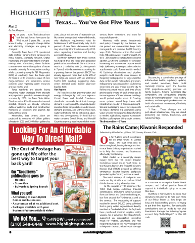 Part 1BFy Lou Dugganive years... 2030. Think about howfast the last 5 years have gone by.Well, in just 5 years, life... as you know it today... is going to change. Water and electricity shortages are going to change it.Currently, Texas hosts 279 operational data centers—ranging from campuses by Meta, Google, Microsoft, Amazon, Digital Realty, QTS, and Equinix to dozens of crypto- mining sites. Combined, these facilities consume over 400 million gallons of water annually, primarily for evaporative cooling, while consuming roughly 781 Megawatts (MW) of electricity from the Texas grid. As Texas is set to welcome a wave of new mega-campuses and expansions, serious concerns arise regarding water resources and our electric grid.Texas residents are already facing mounting water shortages from drought and population growth. In a severe‐drought scenario, by 2030, the Texas State Water Plan forecasts a 4.7-million-acre‐foot annual shortfall. Regions are already enforcing outdoor‐watering limits and construction moratoria as reservoirs and aquifers dip below critical levels.Meanwhile, data centers alone are projected to consume 49 billion gallons of water in 2025 and 399 billion gallons byTexas... You’ve Got Five Years2030, about 6.6 percent of statewide use. No current law caps their water withdrawals, only disclosure requirements exist for facilities over 5 MW. Realistically, only 10–20 percent of new Texas data‐center builds may adopt significant water‐reuse by 2030, unless regulatory incentives and funding accelerate sharply.Electricity demand from these centers has helped drive the Texas grid’s projected peak load increase from 85 GW in 2024 to as much as 218 GW by 2031 (a 256% growth in 7 years), with data centers accounting for a growing share of that growth. ERCOT has already approved more than 5,496 MW of new large-use centers with an additional 56,458 MW pending, suggesting data- center demand could double large-user load by 2030.Our RegionAs Texas braces for growing water and energy challenges by 2030, our region— Comal, Bexar, and Kendall Counties— stands at a crossroads. San Antonio’s energy demand is soaring, and the Edwards Aquifer is under stress. Canyon Lake is under severe demand pressure, and without more rain, water restrictions will be tightening again. With new developments on hold due to water concerns Comal, Bexar, and Kendall Counties urgently need more reliable waterservice, fewer restrictions, and room for responsible growth.However, with smart investments and policy changes by our leaders, we can protect our communities, keep costs manageable, and preserve the Hill Country way of life. Statewide actions that could help: 1) Boosting water reuse from just 1.5% to 15–25% would ease pressure on lakes and aquifers. 2) Offering tax credits for rainwater harvesting and stormwater capture would help. 3) Allowing water rights to be traded so surplus water could flow where it is needed. 4) Exploring desalination and pipeline projects could diversify water sources. 5) Requiring backup power for large users like data centers would help reduce grid strain. 6) Expanding transmission lines could bring clean wind and solar energy into the city. 7) Rolling out smart meters and time-of-use pricing could reward off-peak energy use. 8) Increasing water efficiency in new buildings would protect aquifer levels. 9) Creating reuse systems would help towns with infrastructure needs. 10) Requiring drought- tolerant landscaping in new developments to reduce demand. 11) Upgrading aging water systems with expanded state funding is needed. 12) Building regional wastewater facilities could replace failing septic systems. The Bottom Line—5 YearsBy pursuing a coordinated package of infrastructure builds, regulatory updates, and market incentives, Texas could materially improve upon the baseline 2030 projections—easing pressure on family budgets, helping businesses stay competitive, and safeguarding property values. By working together—local leaders, residents, and state policymakers—we can build a future that is more secure, affordable, and sustainable.5 Years... These changes are not just about infrastructure, they are about protecting our homes, businesses, and natural heritage.Looking For An Affordable Way To Direct Mail?The Cost of Postage has gone up! We offer the best way to target your back yard!Our “Good News”publications goes to:• Helotes• Stone Oak• Bulverde & Spring BranchWhat you get!• Advertising to over 48,000 homes and businesses.• A customize ad at no additional cost.• Packages available with your business feature article & video!We Got You... Call NOW to get your space!(210) 548-6448www.highlightspub.comThe Rains Came; Kiwanis RespondedSOu b m i t t e d b y G l e n d a R a s t o f T e x a s H i l l C o u n t r y K i w a n i s C l u bn July 4, 2025, almost record rains fell on small towns in Central Texas. The river levels rose todevastating levels, leaving damage and loss. In true Texas fashion, organizations rushed in to help the residents and businesses affected by the flooding.What started as a seemingly simple inquiry from the T-O District Disaster Committee, turned into so much more. In true Kiwanis fashion, the Texas Hill Country Kiwanis Club (THCK) stepped up offering emergency, disaster hygiene backpacks (provided by the District) to those in need.The initial delivery of backpacks was made on July 6 with a second and third distribution occurring a few days later.At the request of T-O personnel, the THCK Club began collecting financial contributions. Donations came in, not just from our friends and family and colleagues, but from around the T-O District as well as the country. The outpouring of support resulted in almost $40,000 being collected that is going vetted organizations directly involved in flood relief efforts. So far, funds have purchased medical supplies, utility wagons for a Volunteer Fire Department, supported an org